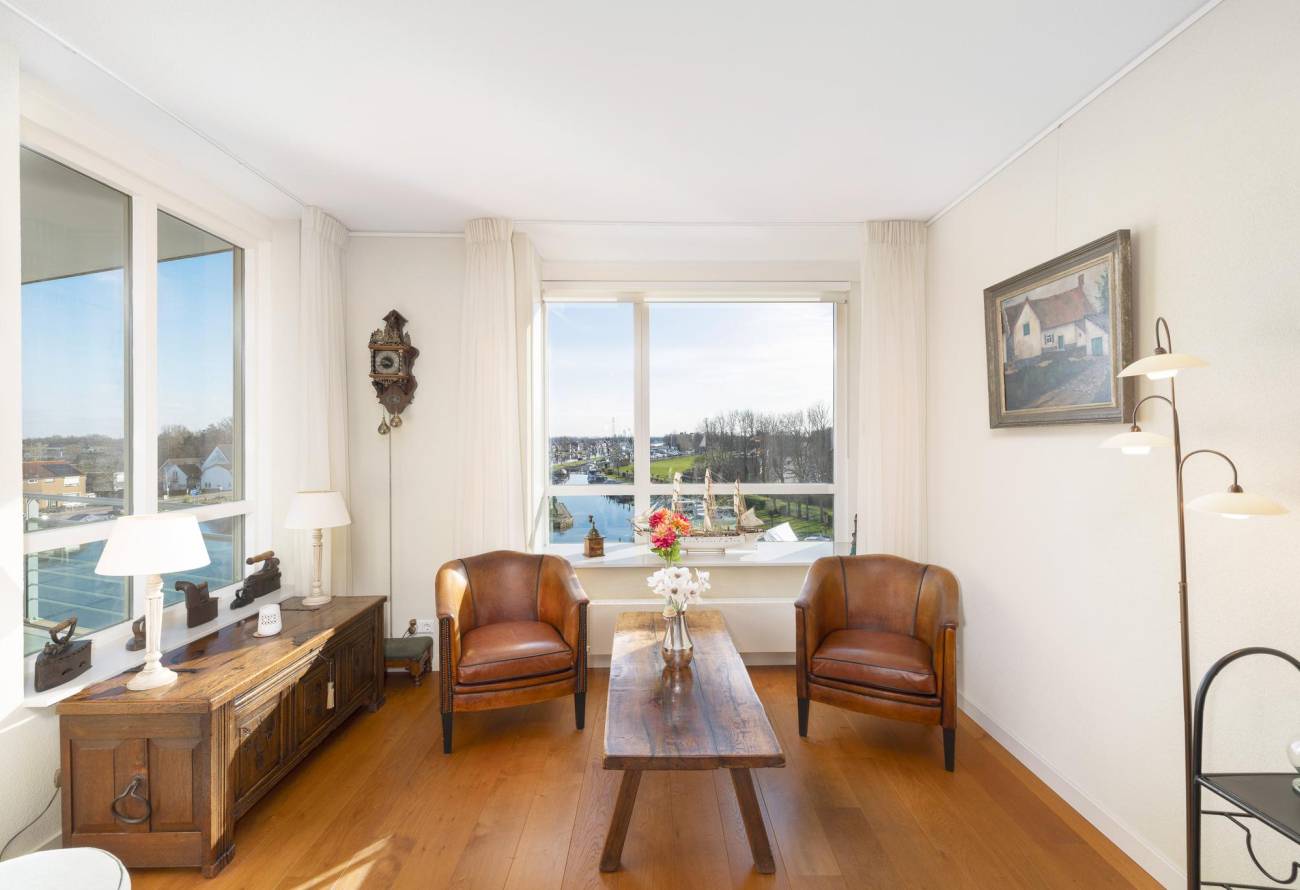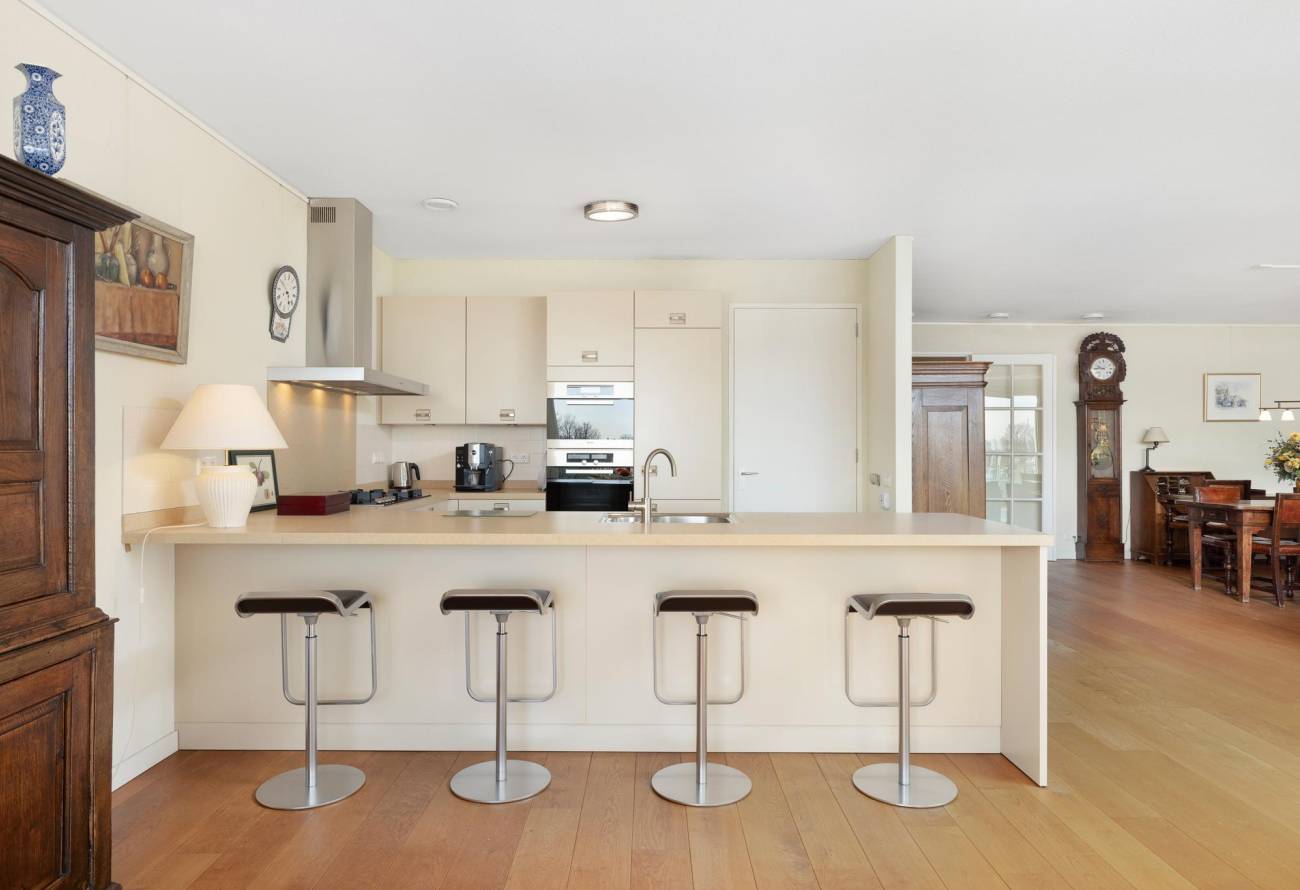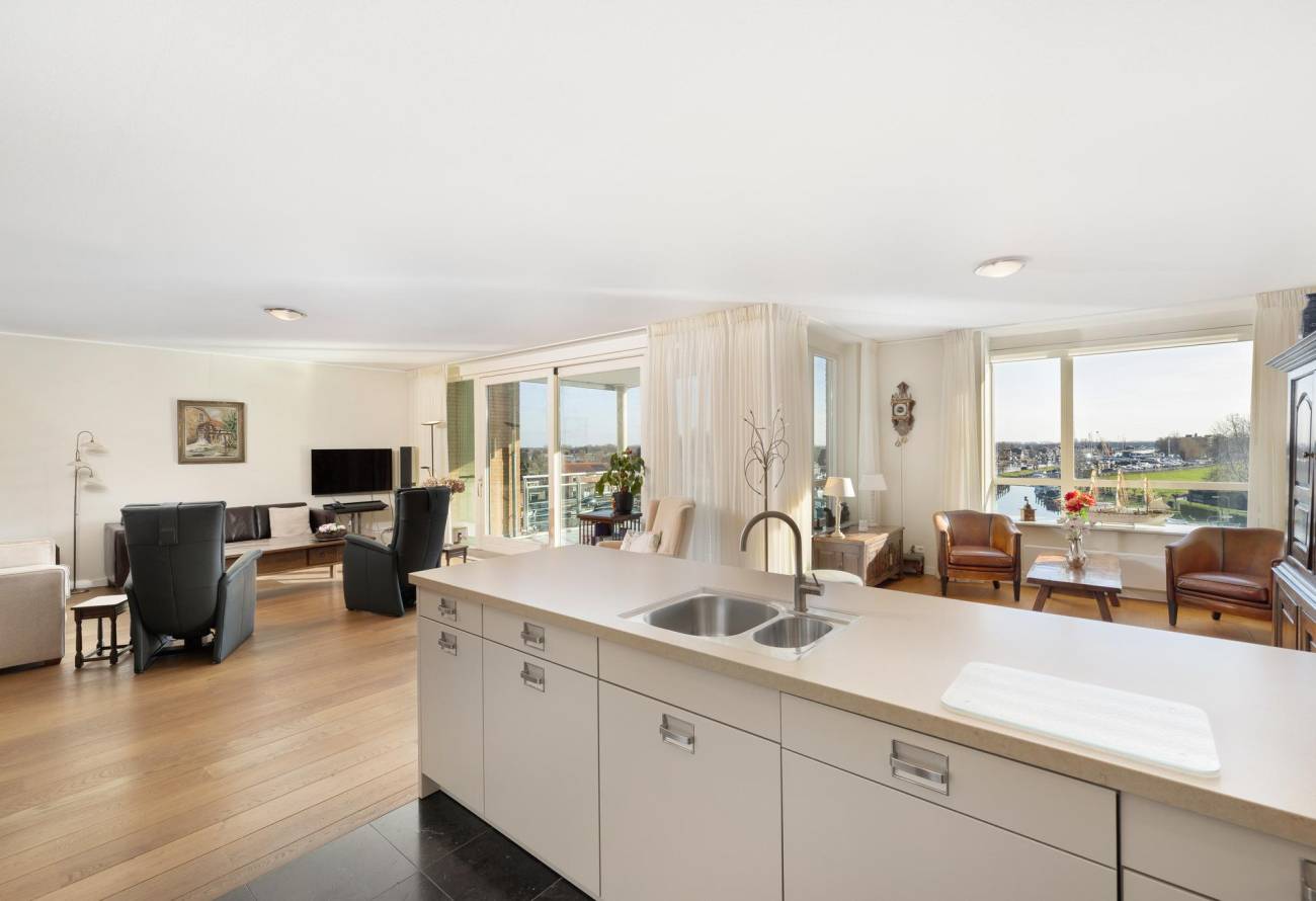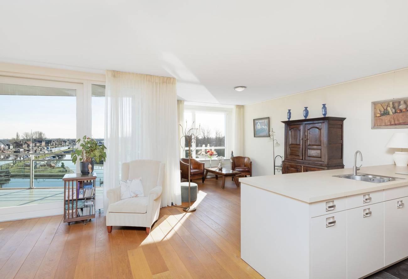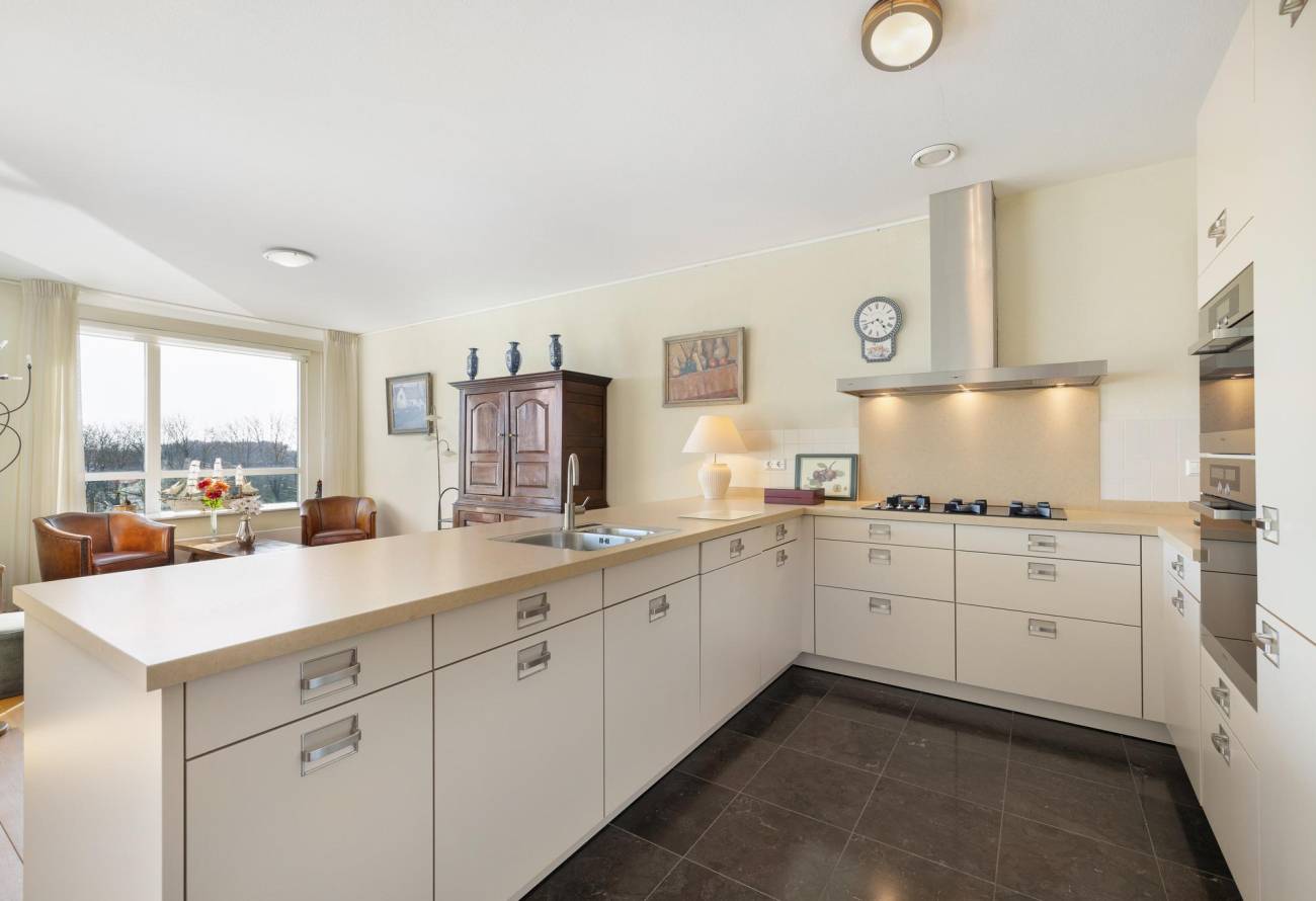 Binnen in de ruime woonkamer vallen licht en ruimte direct op evenals het prachtige uitzicht. De grote ramen laten het zonlicht binnenstromen, waardoor een warme en uitnodigende sfeer ontstaat. De fraaie lichte keuken heeft een spoeleiland is voorzien van diverse inbouwapparatuur en heeft een gezellige eetbar. De naastgelegen bijkeuken is ideaal voor de voorraad en hier zijn de aansluitingen voor de wasapparatuur. Eén van de vele pluspunten van dit appartement is het ruime balkon op het zuiden, dat direct toegankelijk is vanuit de woonkamer.
