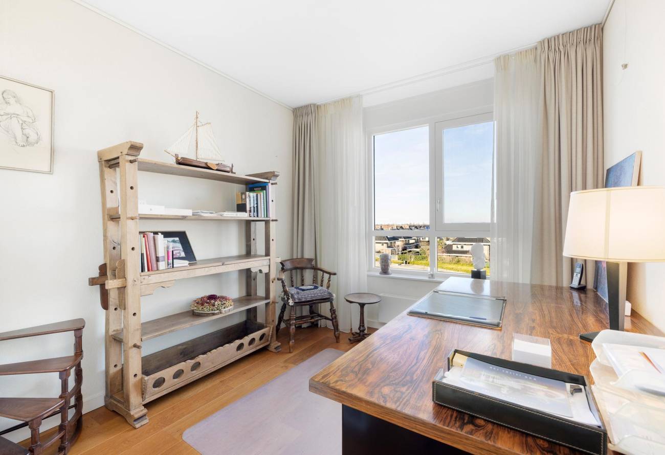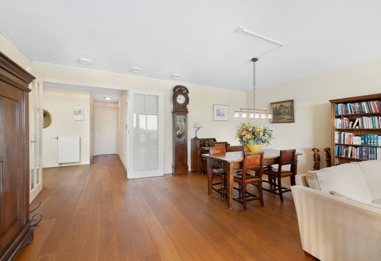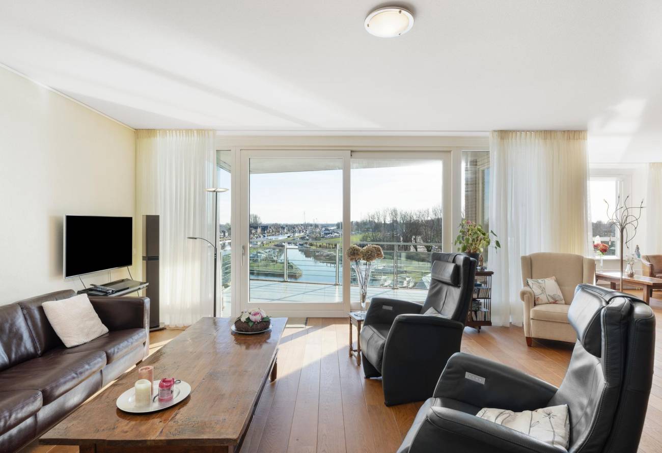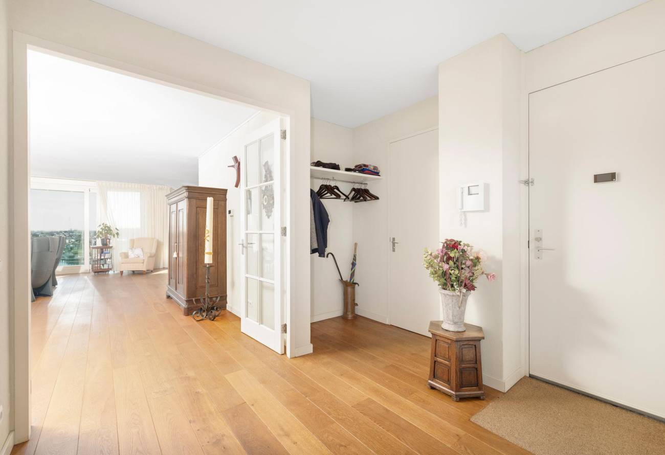 Binnen in de ruime woonkamer vallen licht en ruimte direct op evenals het prachtige uitzicht. De grote ramen laten het zonlicht binnenstromen, waardoor een warme en uitnodigende sfeer ontstaat. De fraaie lichte keuken heeft een spoeleiland is voorzien van diverse inbouwapparatuur en heeft een gezellige eetbar. De naastgelegen bijkeuken is ideaal voor de voorraad en hier zijn de aansluitingen voor de wasapparatuur. Eén van de vele pluspunten van dit appartement is het ruime balkon op het zuiden, dat direct toegankelijk is vanuit de woonkamer.