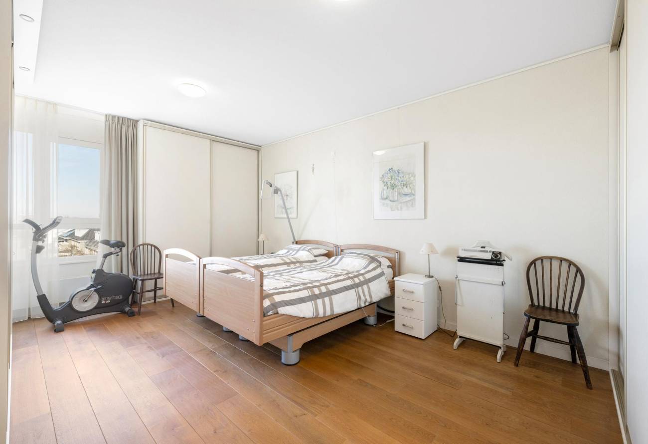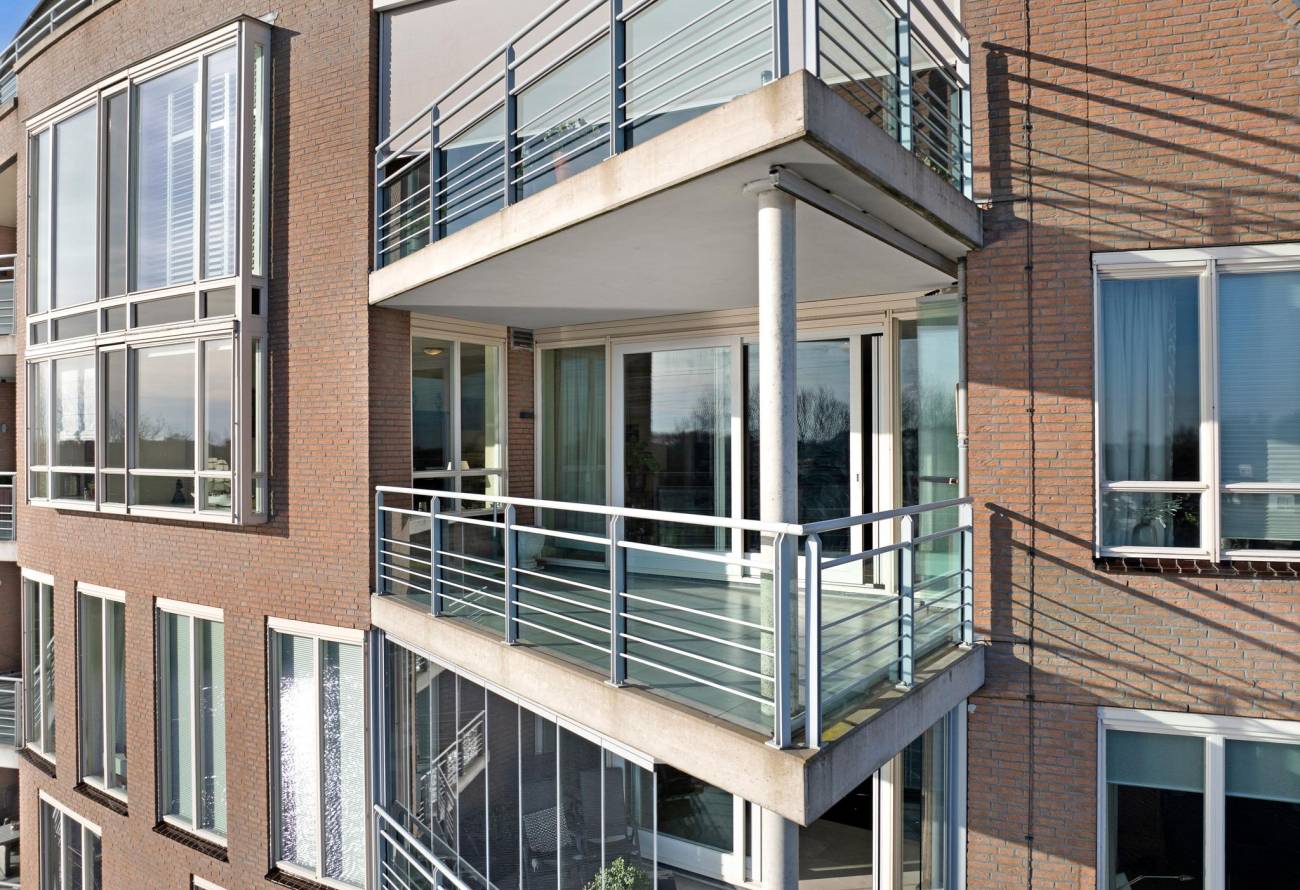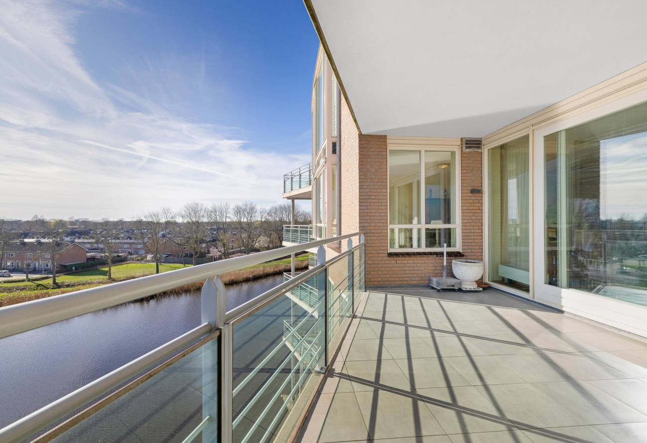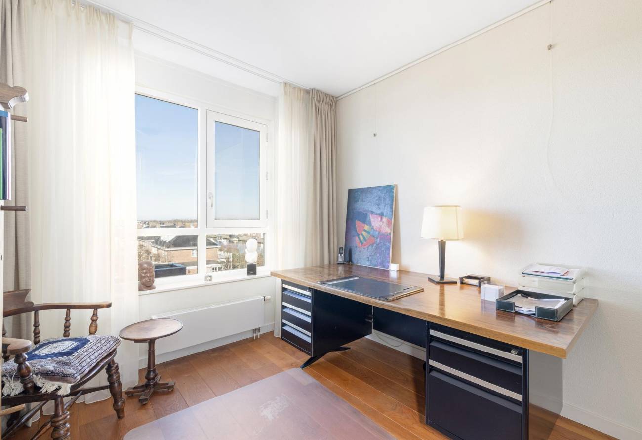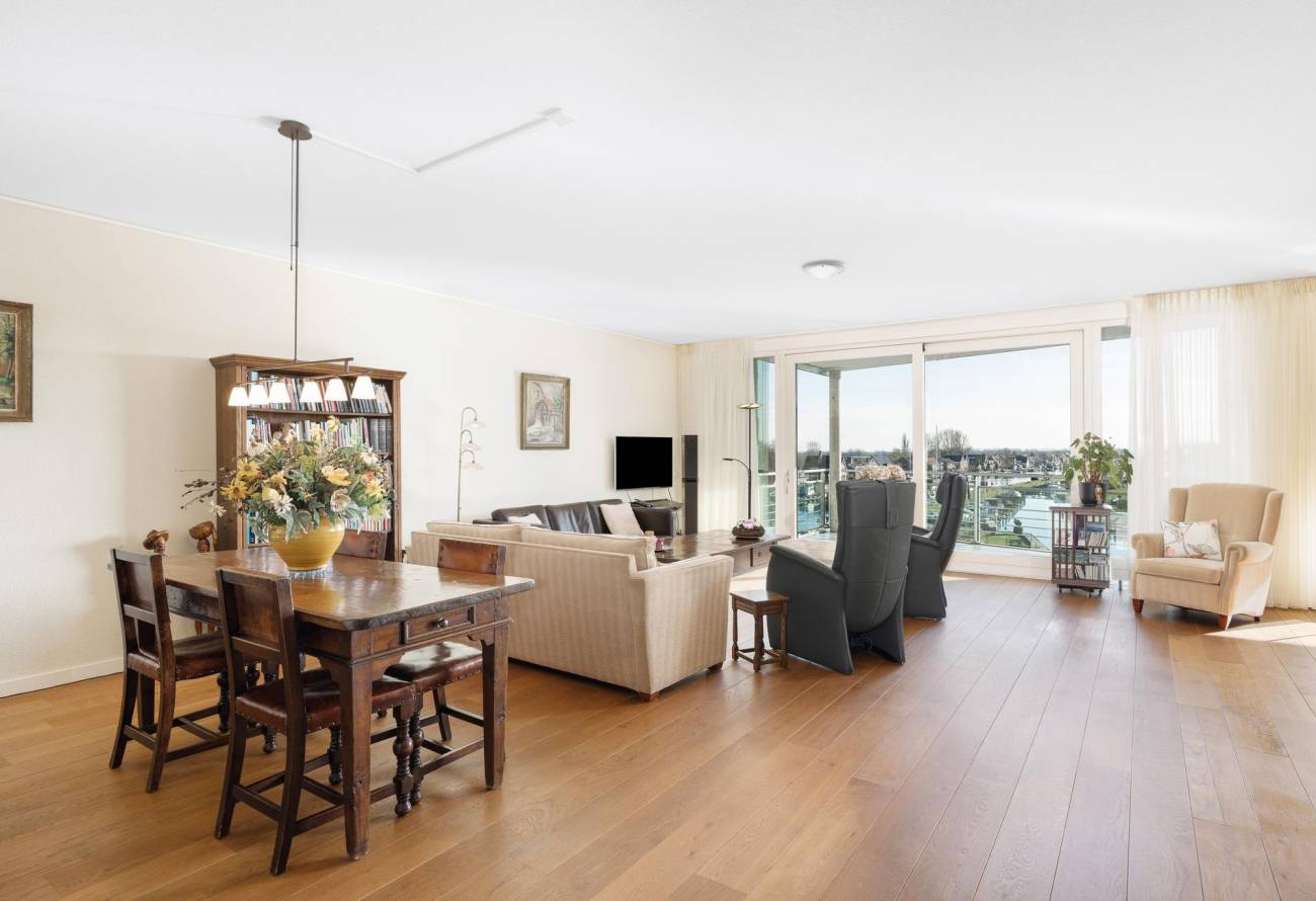 Binnen in de ruime woonkamer vallen licht en ruimte direct op evenals het prachtige uitzicht. De grote ramen laten het zonlicht binnenstromen, waardoor een warme en uitnodigende sfeer ontstaat. De fraaie lichte keuken heeft een spoeleiland is voorzien van diverse inbouwapparatuur en heeft een gezellige eetbar. De naastgelegen bijkeuken is ideaal voor de voorraad en hier zijn de aansluitingen voor de wasapparatuur. Eén van de vele pluspunten van dit appartement is het ruime balkon op het zuiden, dat direct toegankelijk is vanuit de woonkamer.