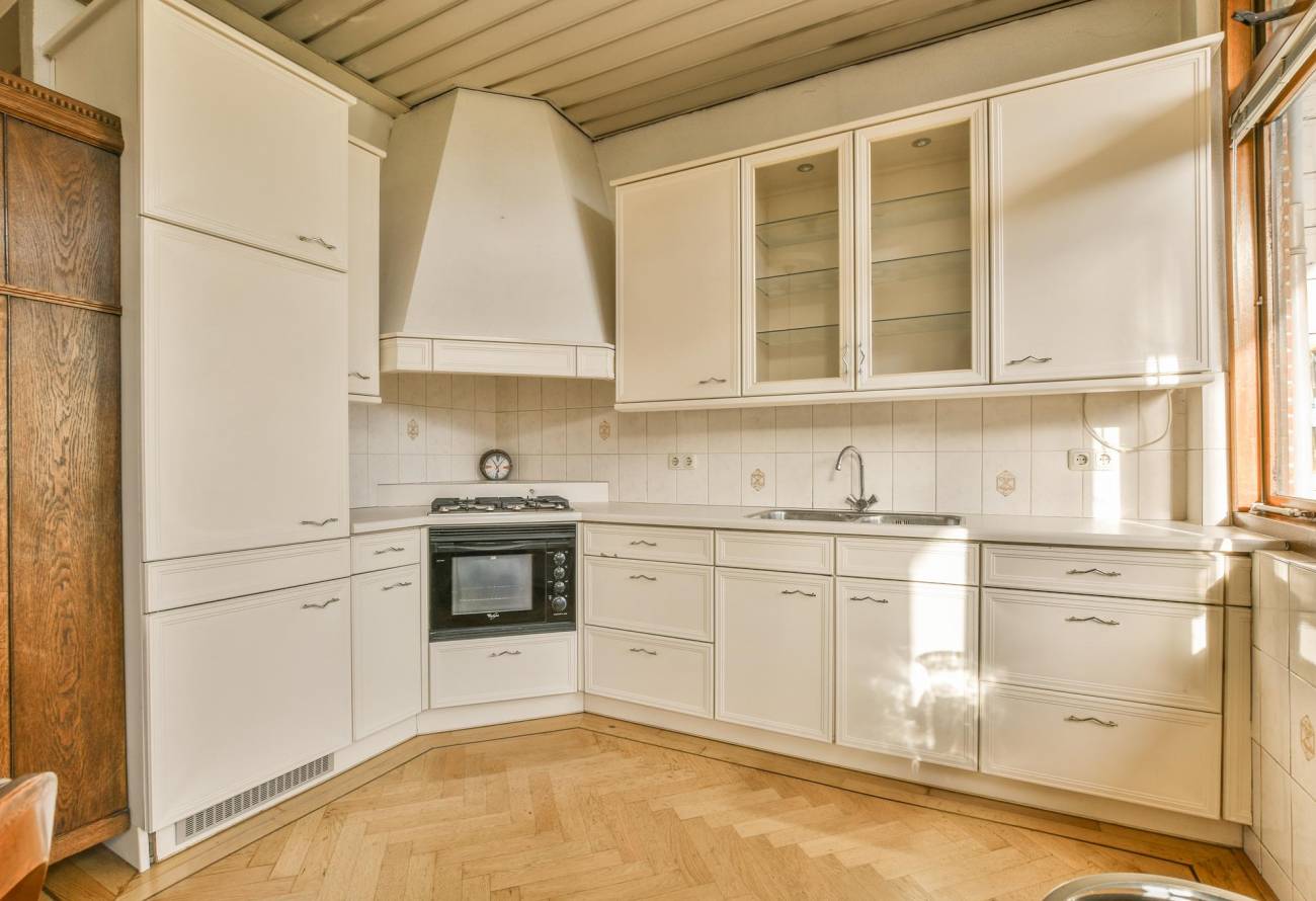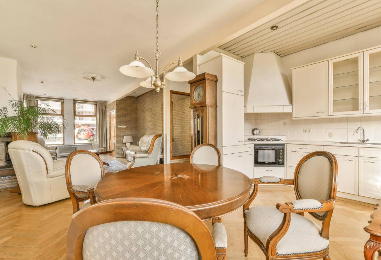 De ruime doorzon woonkamer is voorzien van een visgraat parketvloer, een openhaard in schouw en een open keuken. Vanuit deze eenvoudige keuken is er een deur naar de achtertuin.