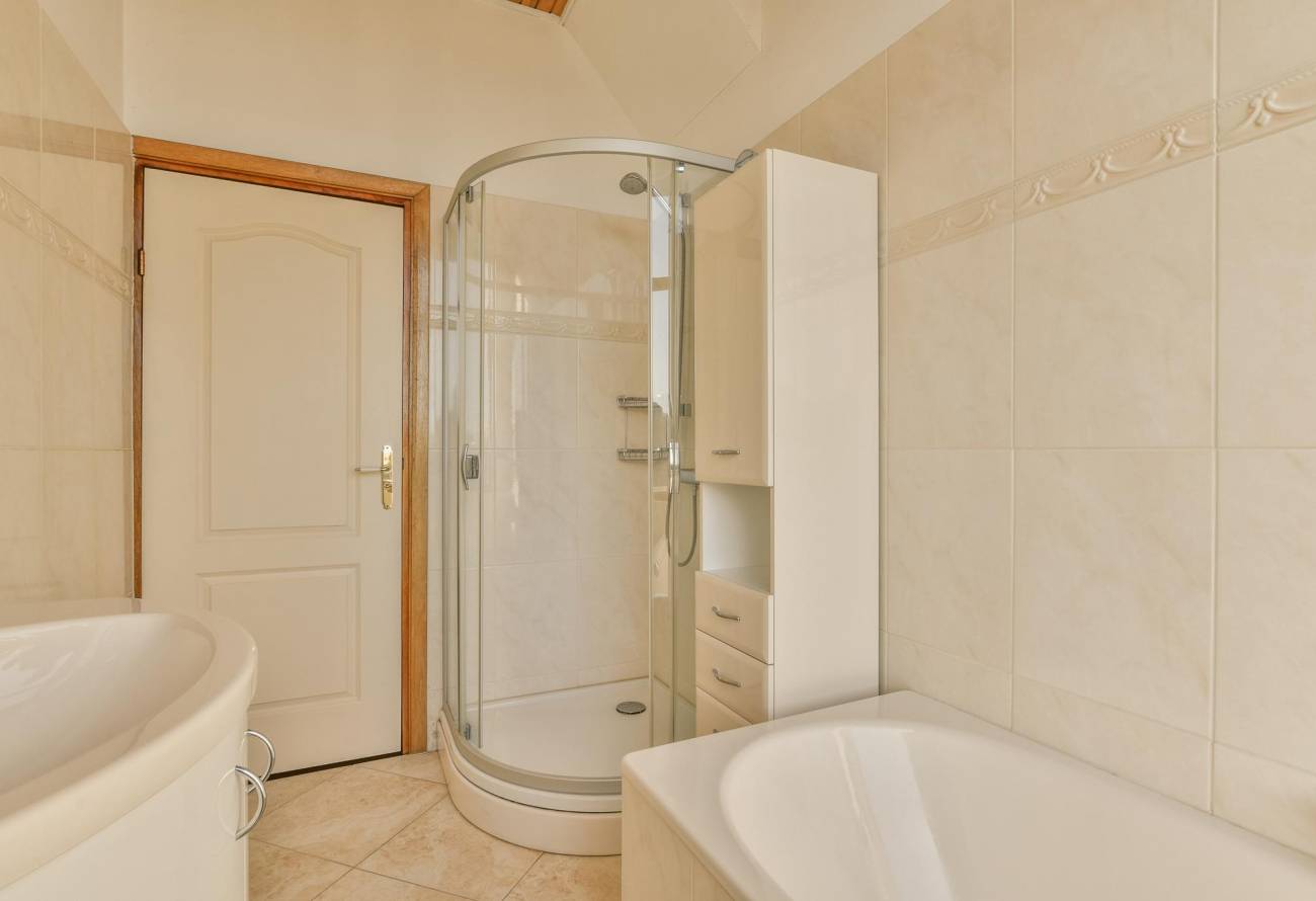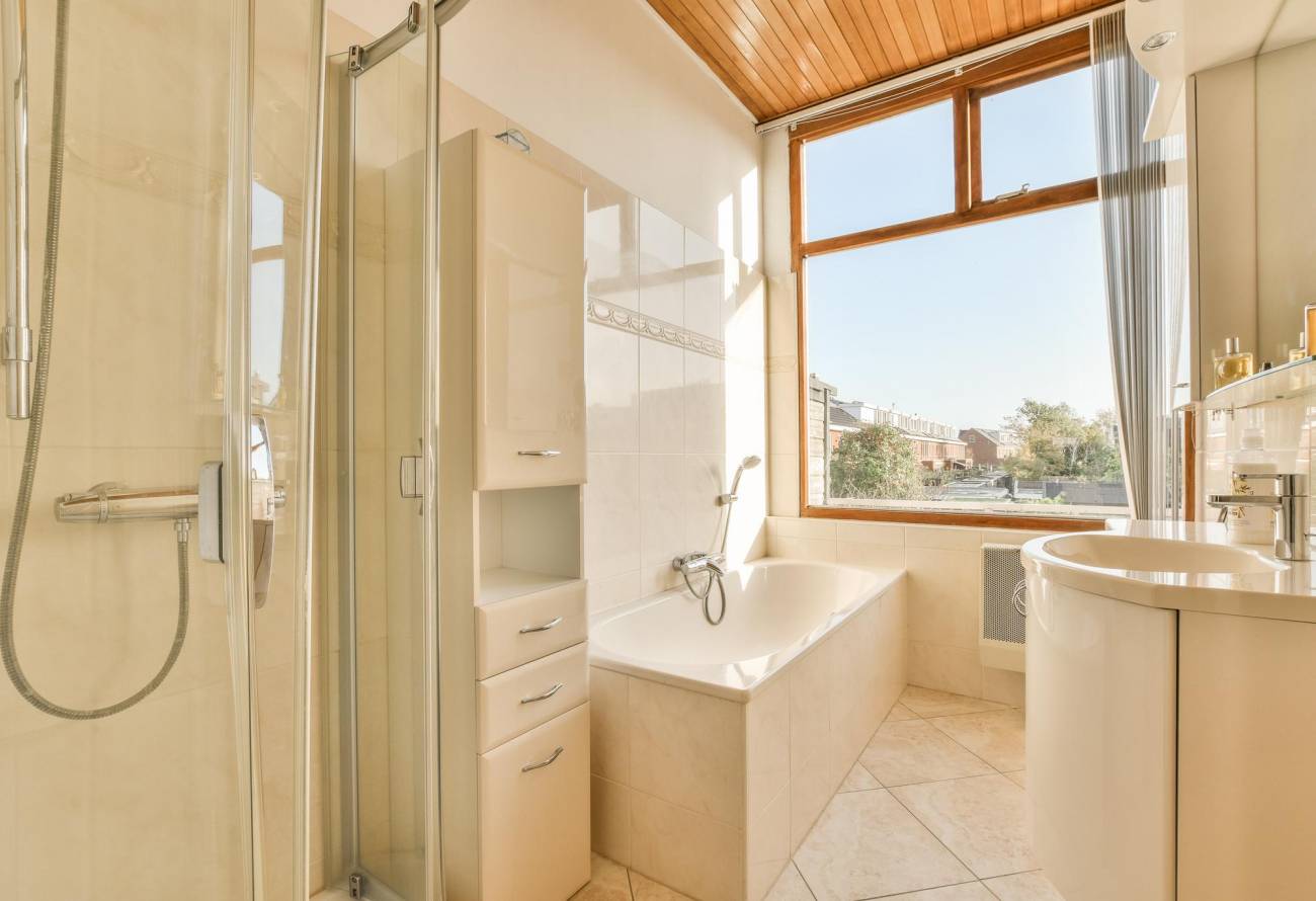 De nette lichte badkamer is voorzien van een ligbad, douchecabine en wastafel in meubel.