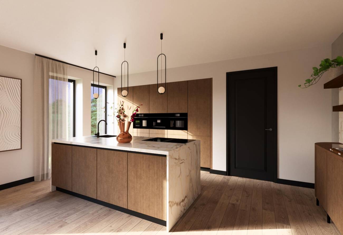 De privé voordeur aan de voorzijde van de villa is voorzien van een glaspartij aan beide zijden en geeft toegang tot de ruime hal met luxe toiletruimte en garderobe. De zeer royale woonkamer met open keuken is totaal 66m² groot en voorzien van veel raampartijen aan drie zijden.