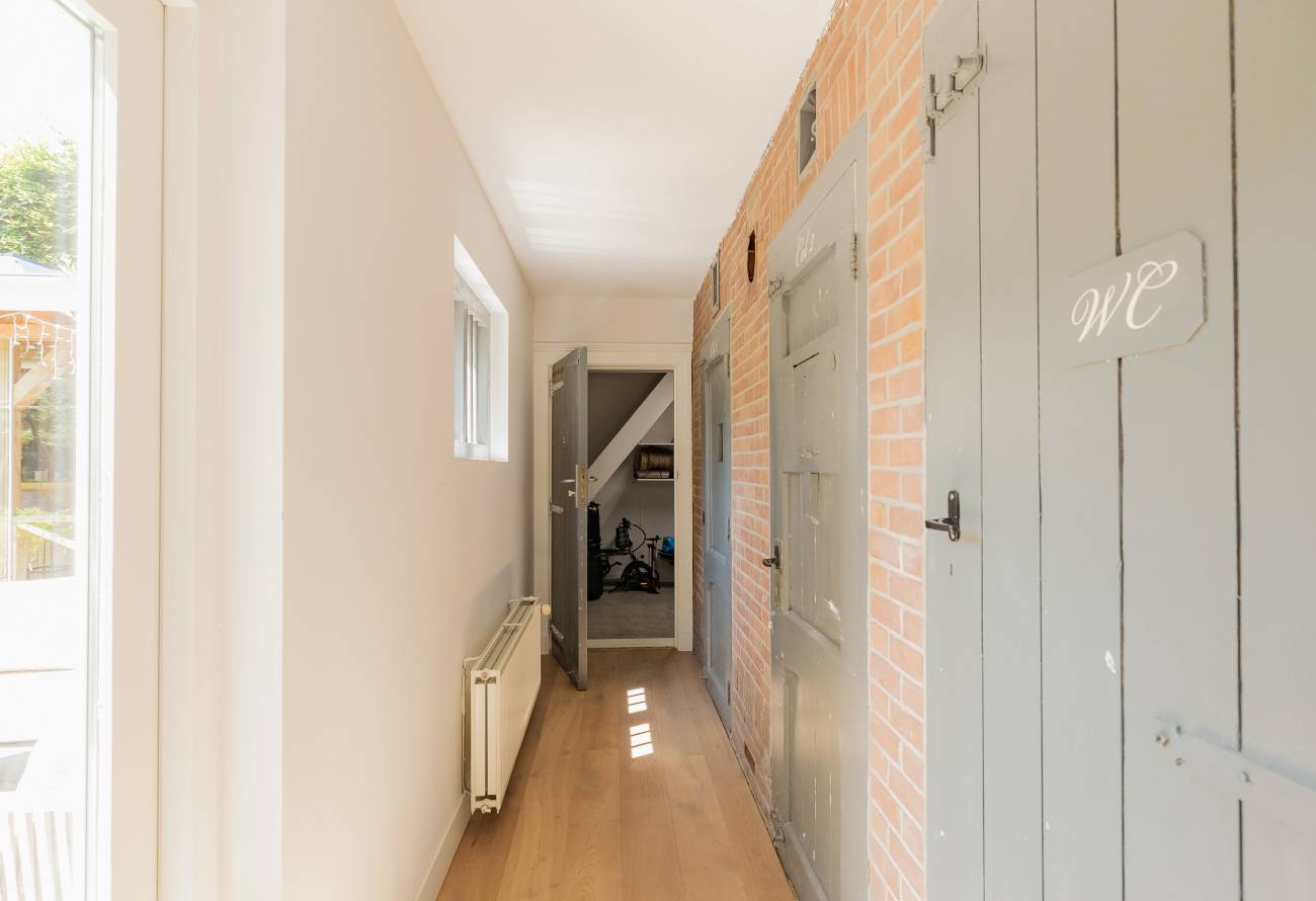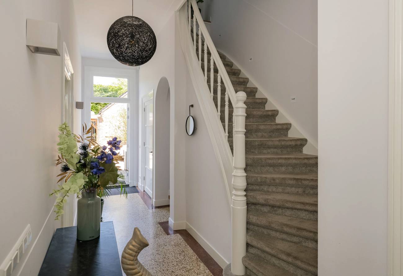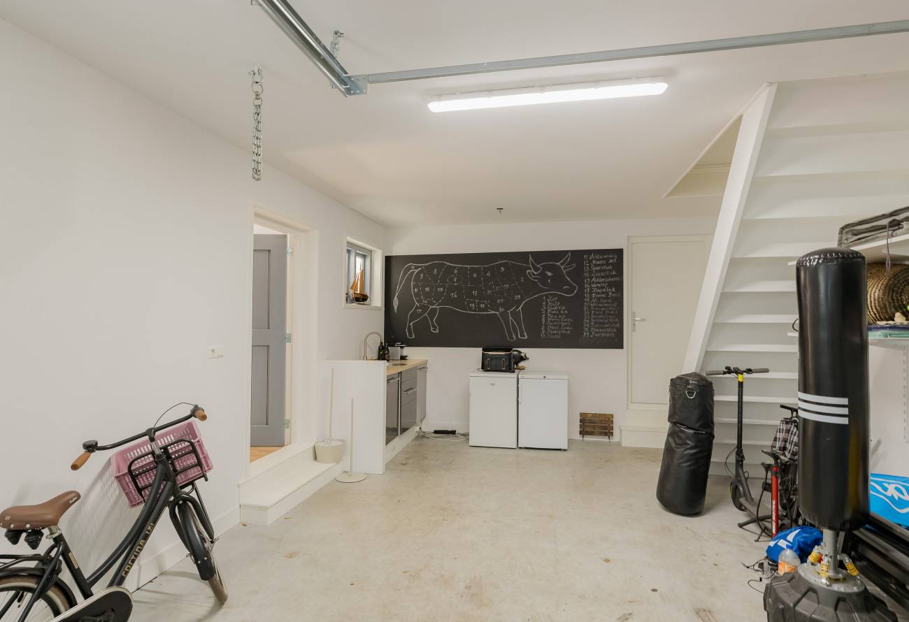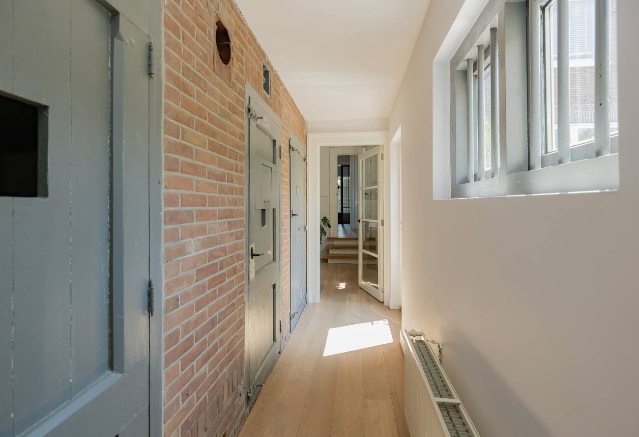 Fraai portaal waarin de markant hoge voordeur, imposant lange hal met de gerestaureerde authentieke granitovloer, garderobe en toiletruimte en een deur naar de tuin. Links van de hal een zeer royale woon-/leefkeuken met luxe keukeninrichting in mat wit uitgevoerd, prachtig kook-/ en spoeleiland met houten eetbar en alle inbouwapparatuur o.a. een fraaie wijnkoeling. Ook een gezellige gashaard en de grote achterpui met veel glas en openslaande deuren naar de tuin ontbreken niet. Rechts van de hal is er een tv-/zitkamer met een gashaard en dubbele deuren geven toegang tot de opkamer. Deze opkamer met een grote op maat gemaakte kastenwand is zeer geschikt als speel-/of werkkamer en heeft een trap naar de grote droge kelder met stahoogte. In het voormalige cellencomplex is een prachtige werkkamer gecreëerd, een bergkamer, een technische ruimte en is er één cel in originele staat behouden gebleven. De inpandig bereikbare garage is groot en o.a. voorzien van een elektrische segment deur met loopdeur en een vaste trap naar ruime bergzolder.