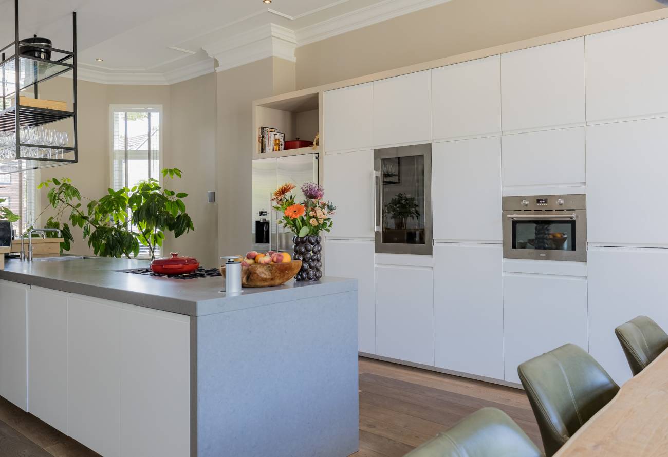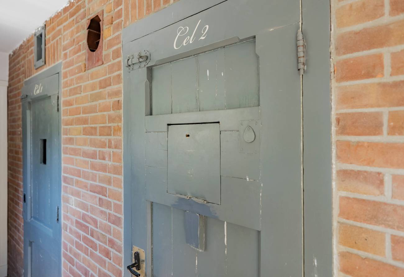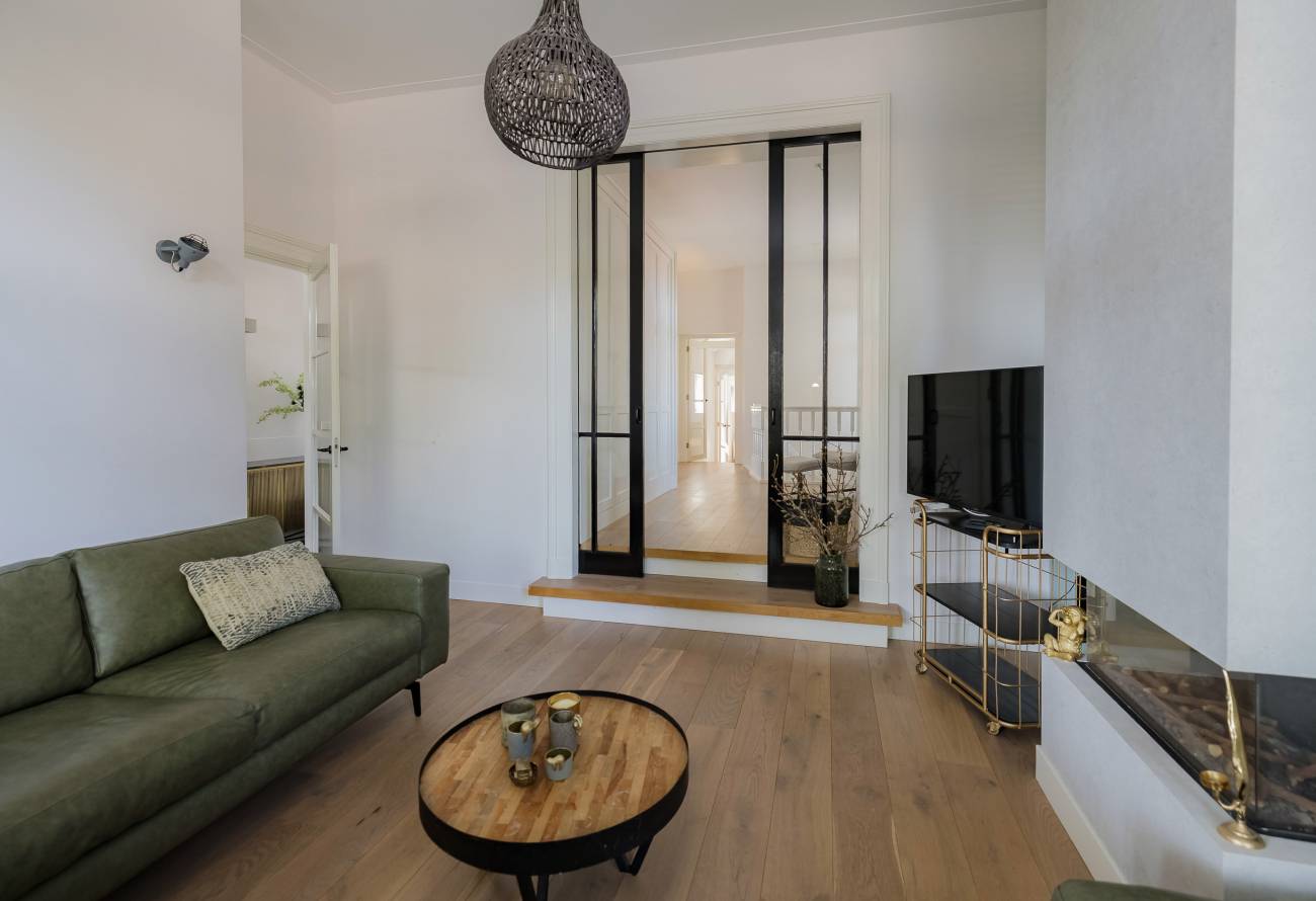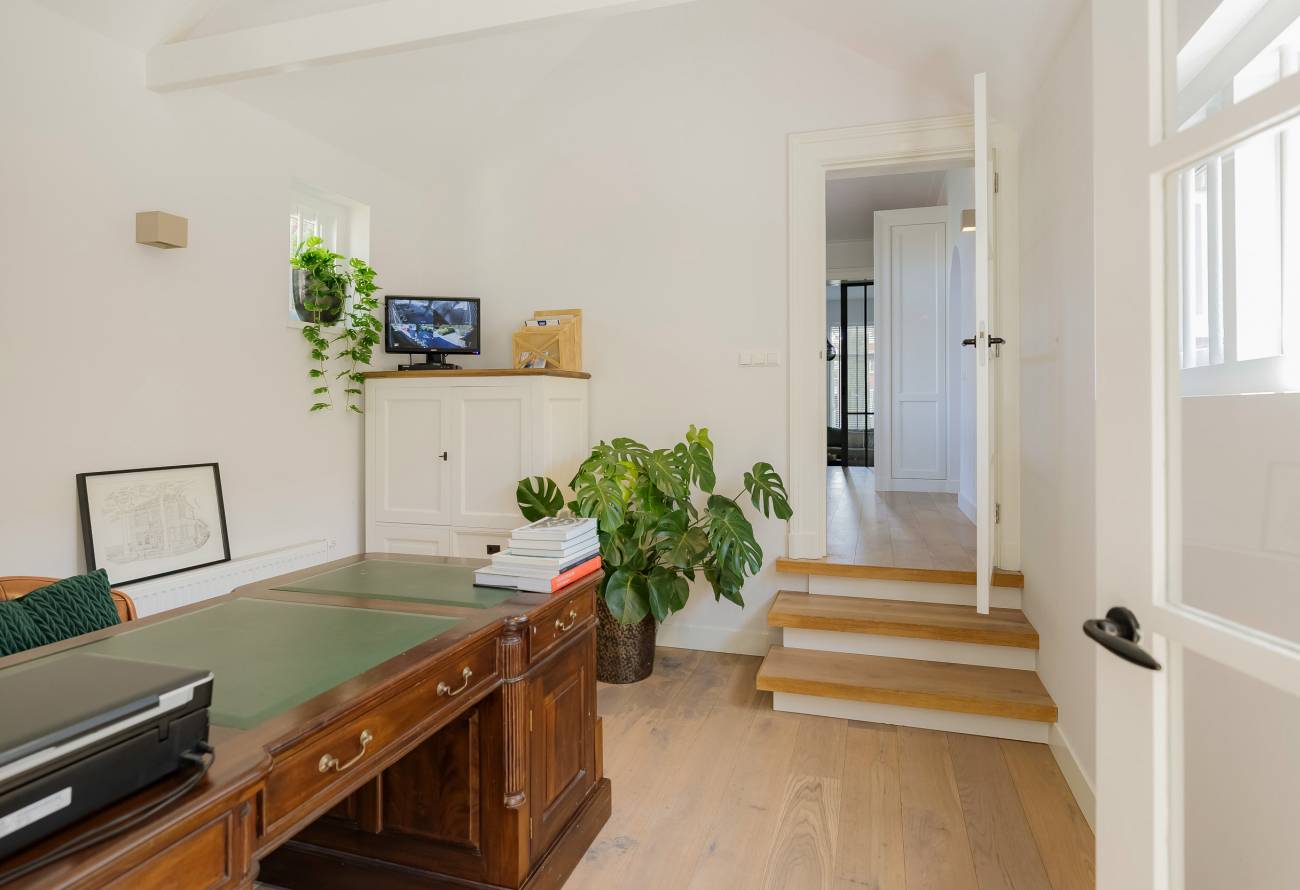 Fraai portaal waarin de markant hoge voordeur, imposant lange hal met de gerestaureerde authentieke granitovloer, garderobe en toiletruimte en een deur naar de tuin. Links van de hal een zeer royale woon-/leefkeuken met luxe keukeninrichting in mat wit uitgevoerd, prachtig kook-/ en spoeleiland met houten eetbar en alle inbouwapparatuur o.a. een fraaie wijnkoeling. Ook een gezellige gashaard en de grote achterpui met veel glas en openslaande deuren naar de tuin ontbreken niet. Rechts van de hal is er een tv-/zitkamer met een gashaard en dubbele deuren geven toegang tot de opkamer. Deze opkamer met een grote op maat gemaakte kastenwand is zeer geschikt als speel-/of werkkamer en heeft een trap naar de grote droge kelder met stahoogte. In het voormalige cellencomplex is een prachtige werkkamer gecreëerd, een bergkamer, een technische ruimte en is er één cel in originele staat behouden gebleven. De inpandig bereikbare garage is groot en o.a. voorzien van een elektrische segment deur met loopdeur en een vaste trap naar ruime bergzolder.