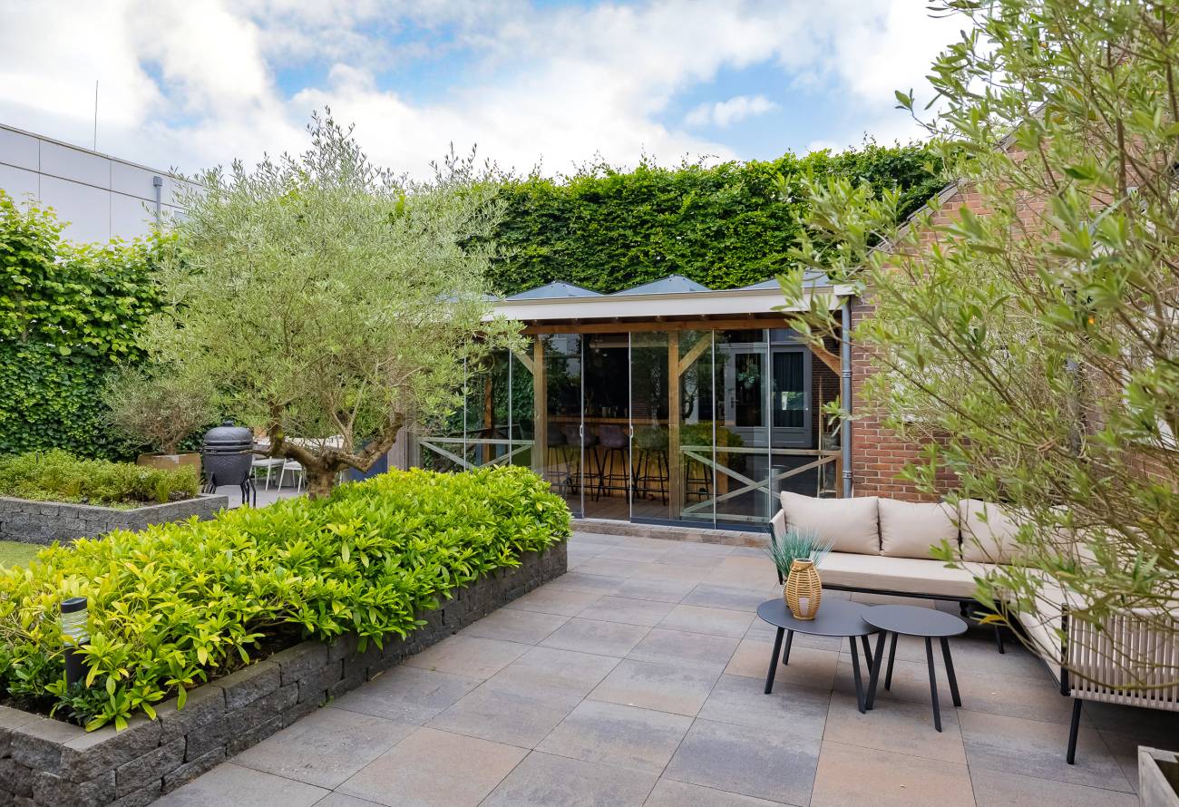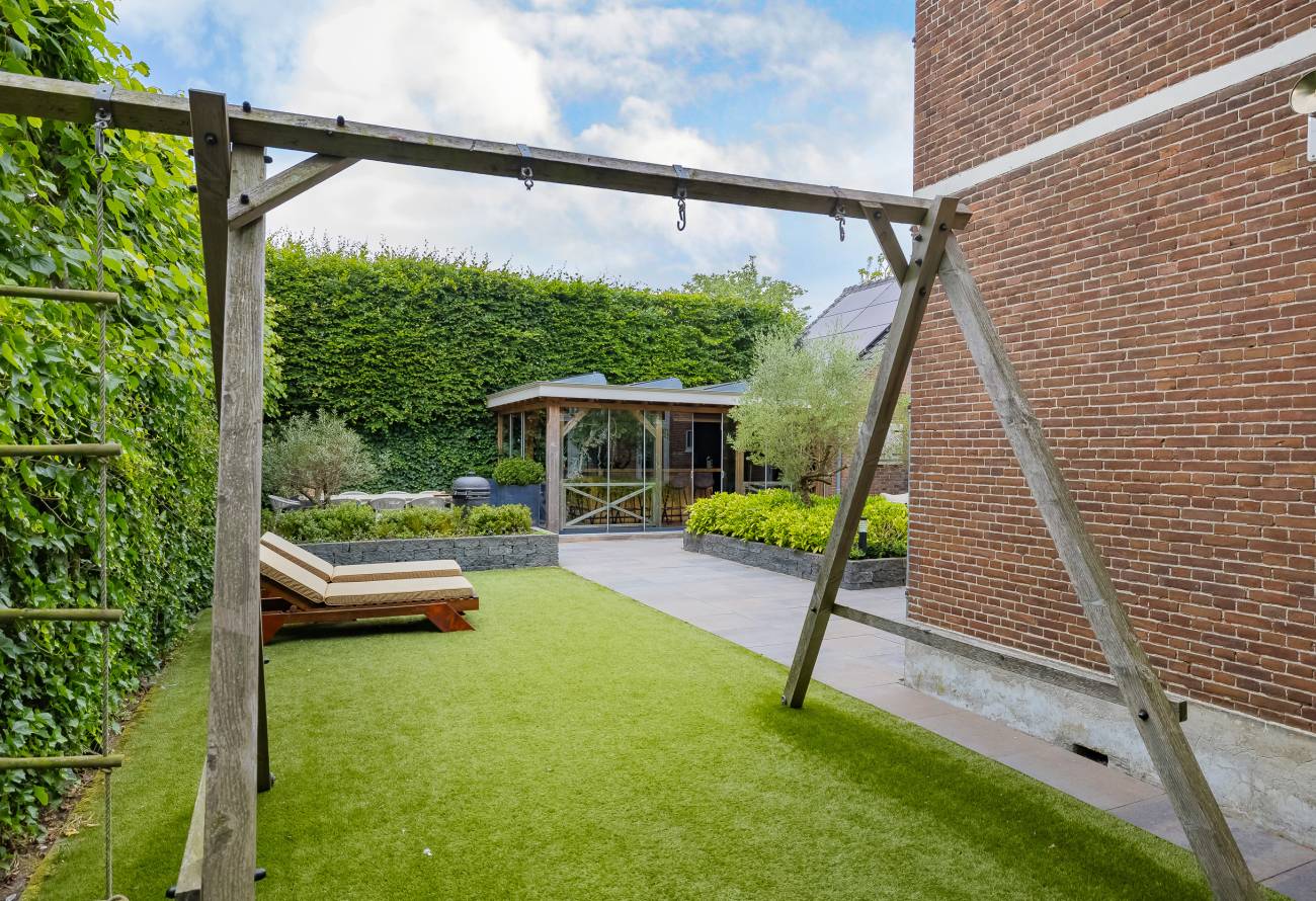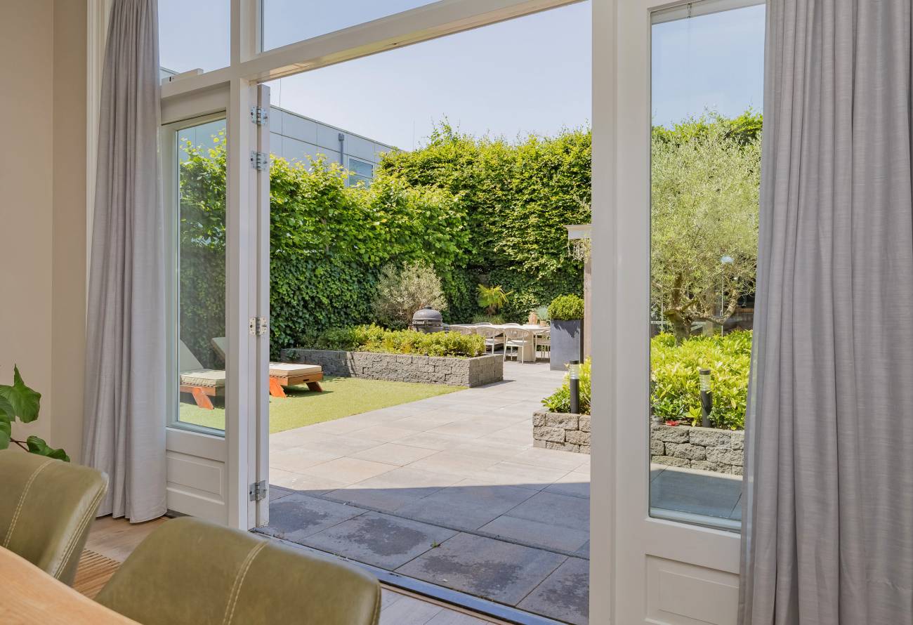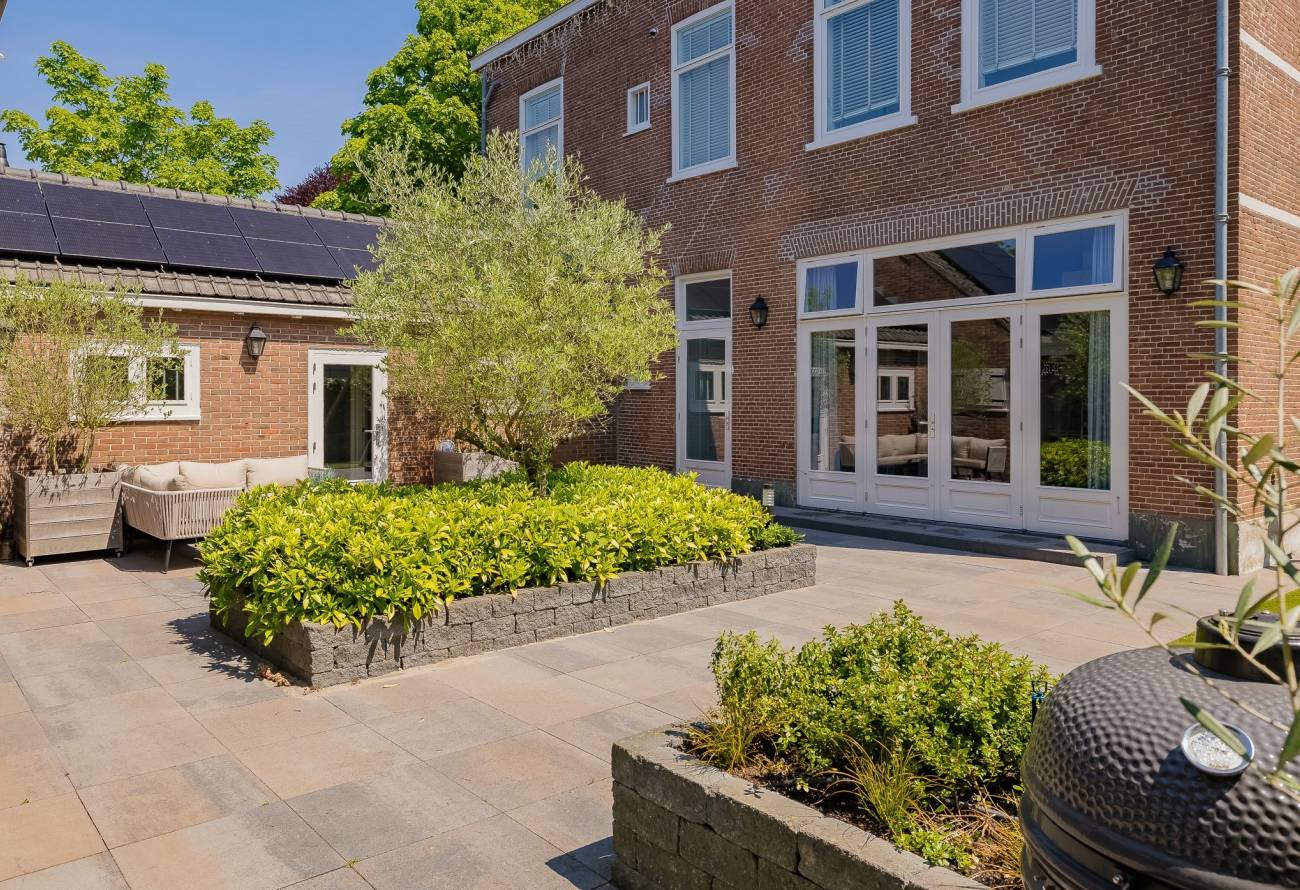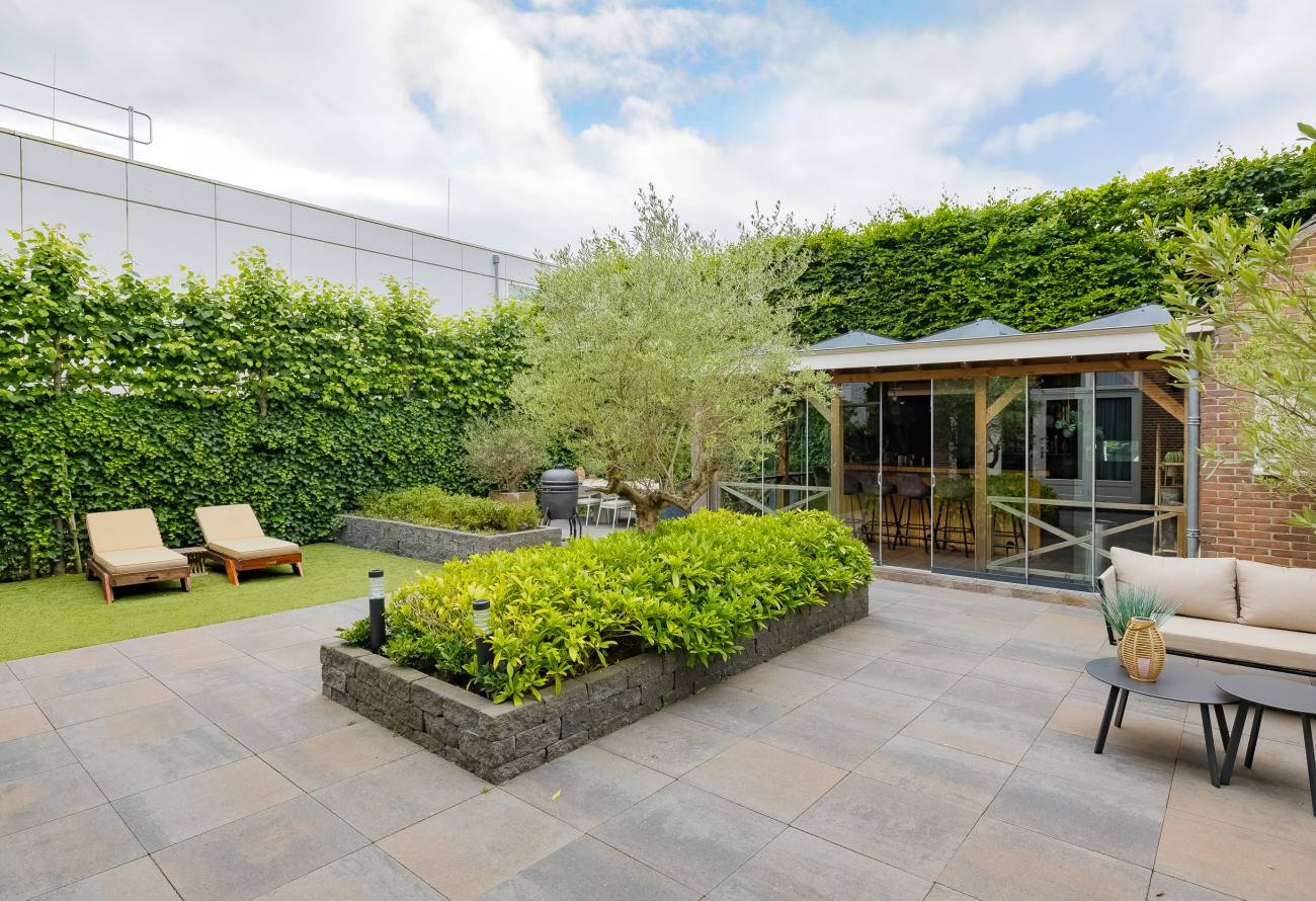 De prachtig aangelegde tuin ligt rondom de woning en heeft o.a. een nieuw in authentieke stijl smeedijzeren hek, verlichting en beregening. De zeer zonnige achtertuin van 13 meter diep en 7.5 meter breed biedt veel privacy en is o.a. voorzien van een grote veranda waarin het ook in de koudere maanden goed toeven is.