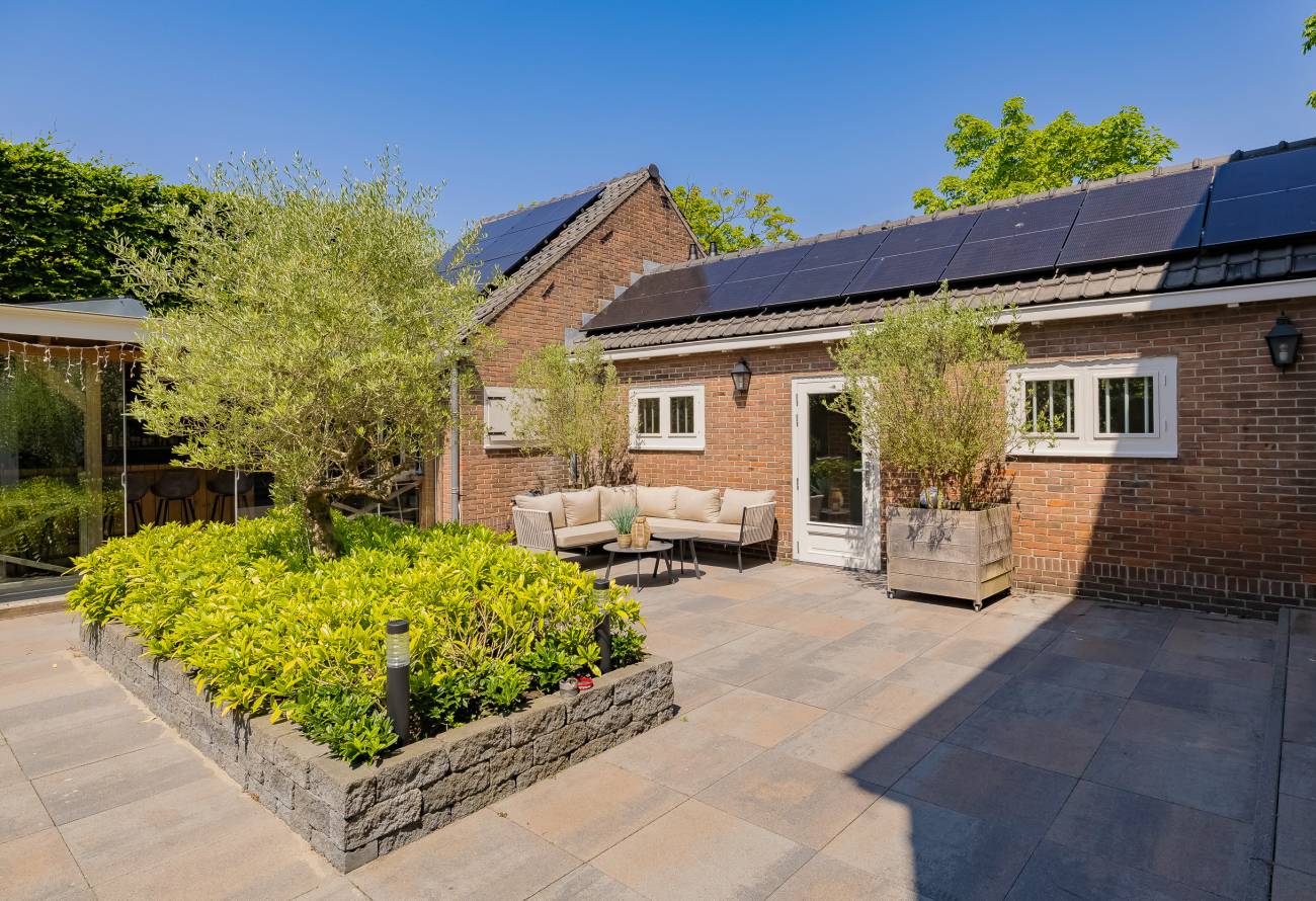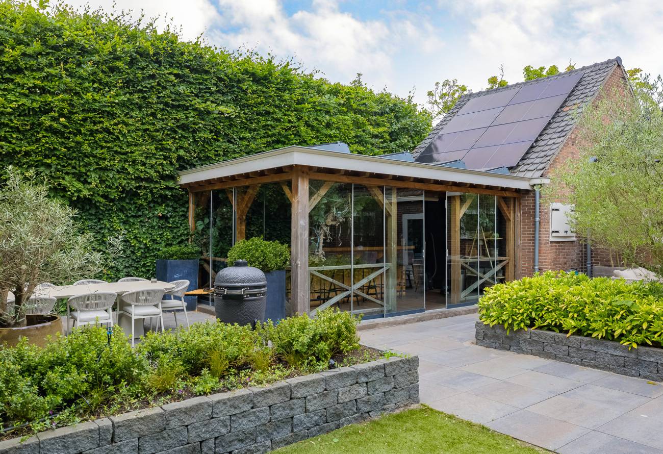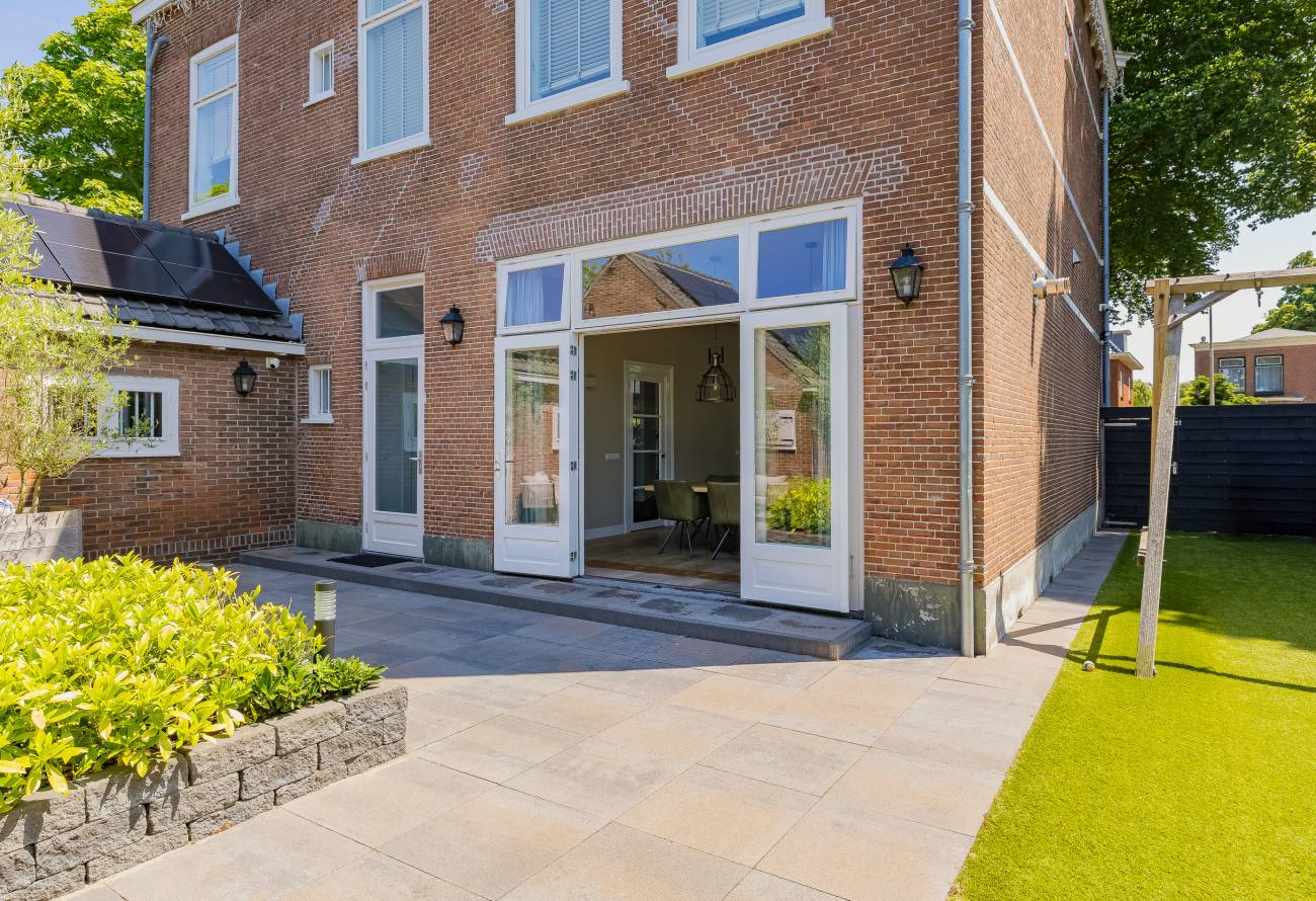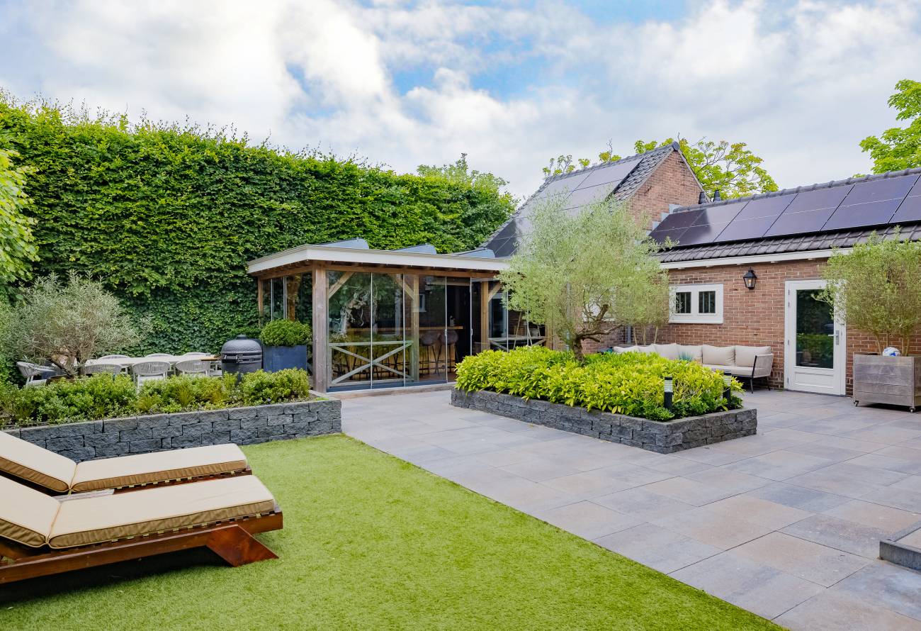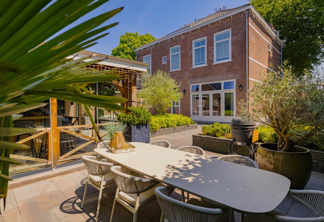 De prachtig aangelegde tuin ligt rondom de woning en heeft o.a. een nieuw in authentieke stijl smeedijzeren hek, verlichting en beregening. De zeer zonnige achtertuin van 13 meter diep en 7.5 meter breed biedt veel privacy en is o.a. voorzien van een grote veranda waarin het ook in de koudere maanden goed toeven is.