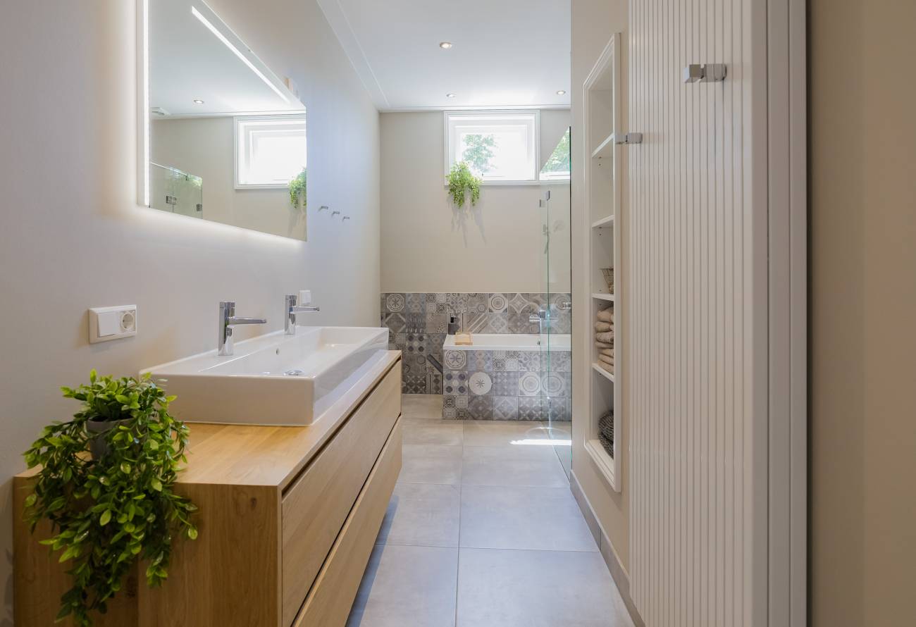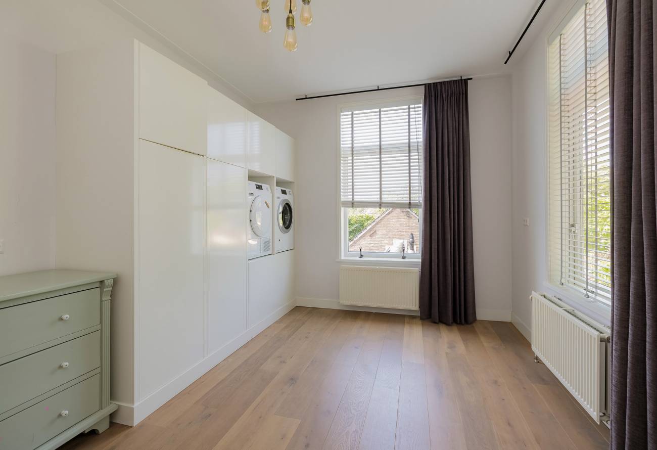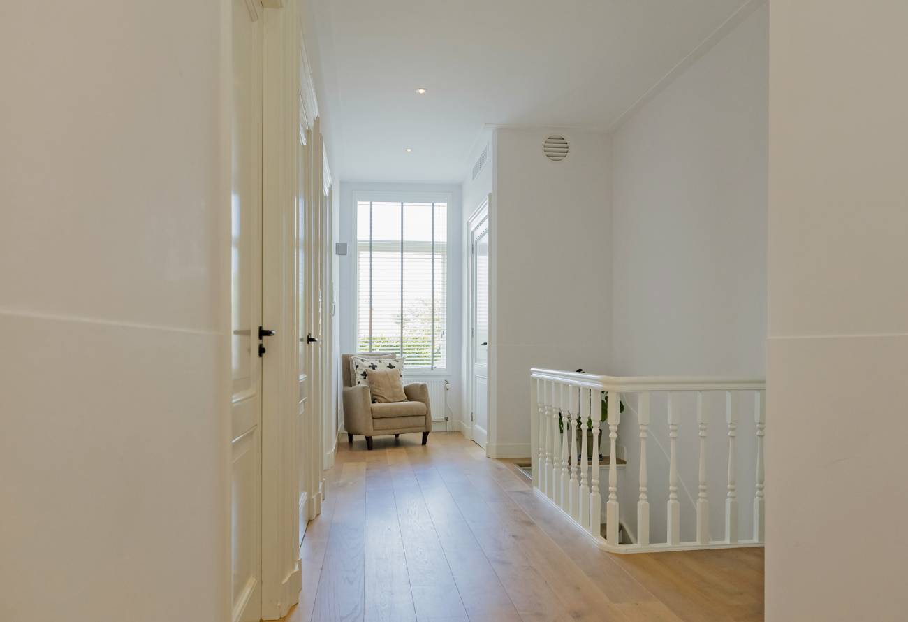 Ook hier een imposant lange hal met deur naar balkon, 3 fantastisch grote slaapkamers met mooie raampartijen, luxe badkamer met inloopdouche, ligbad en brede wastafel met 2 kranen op houten meubel, apart 2e luxe toiletruimte en 4e zeer royale was-/werkkamer.
