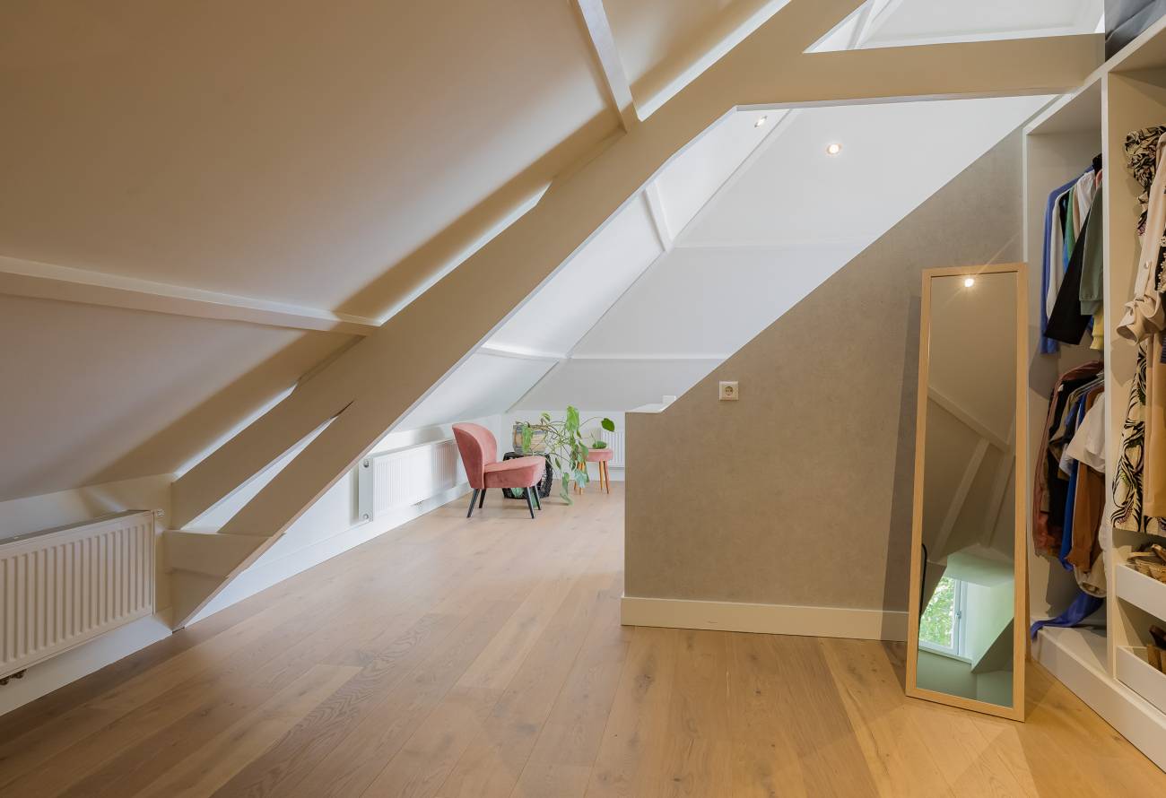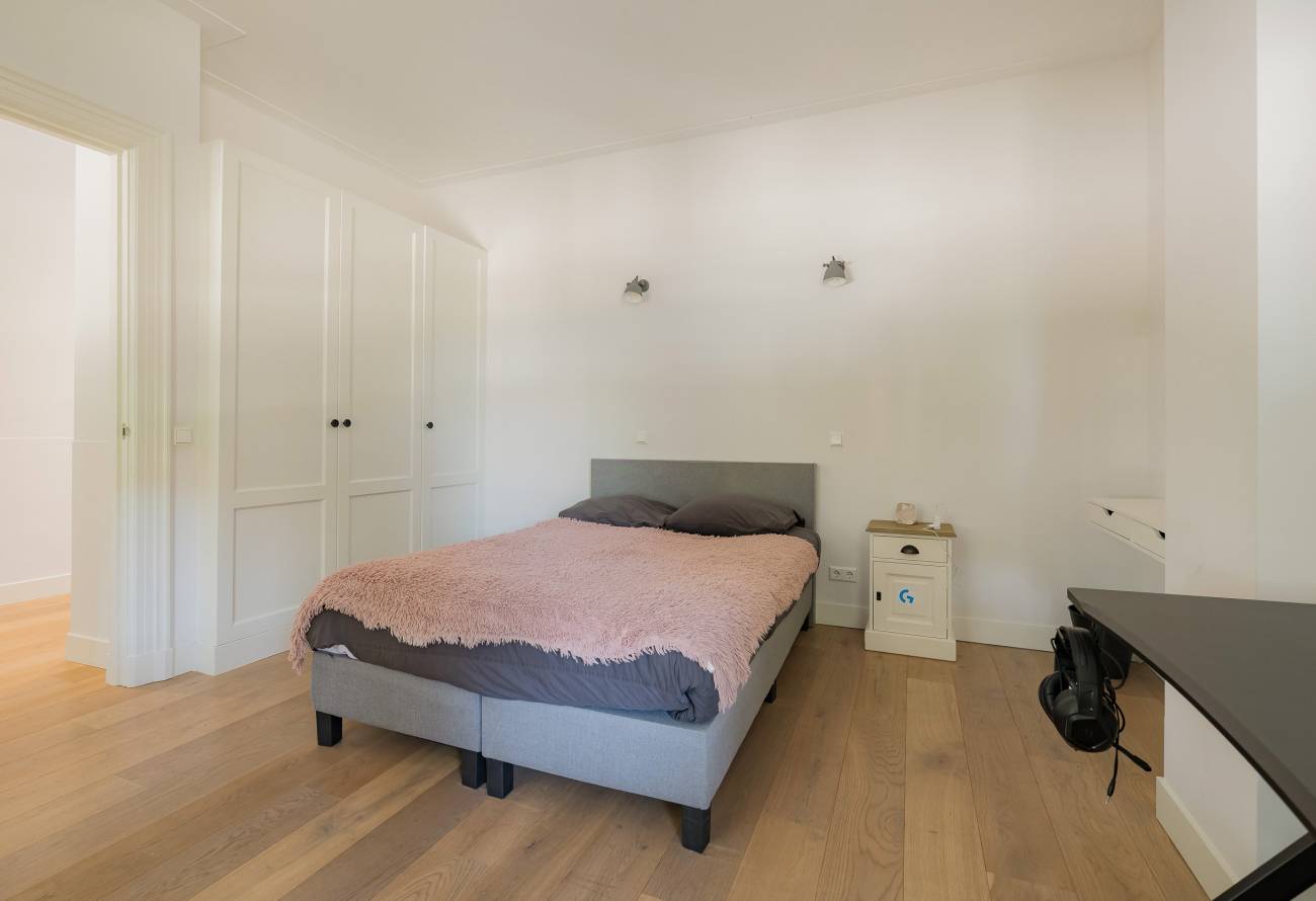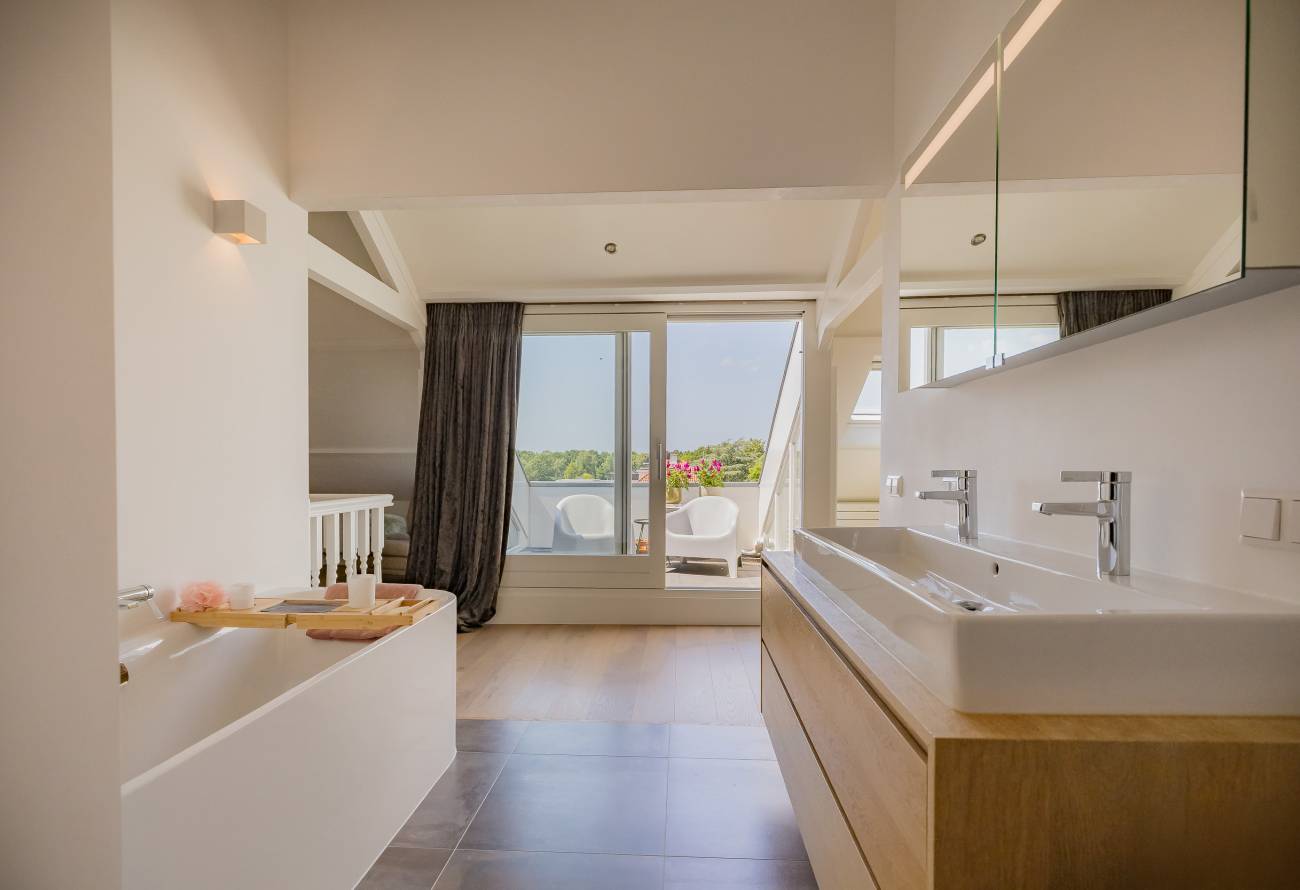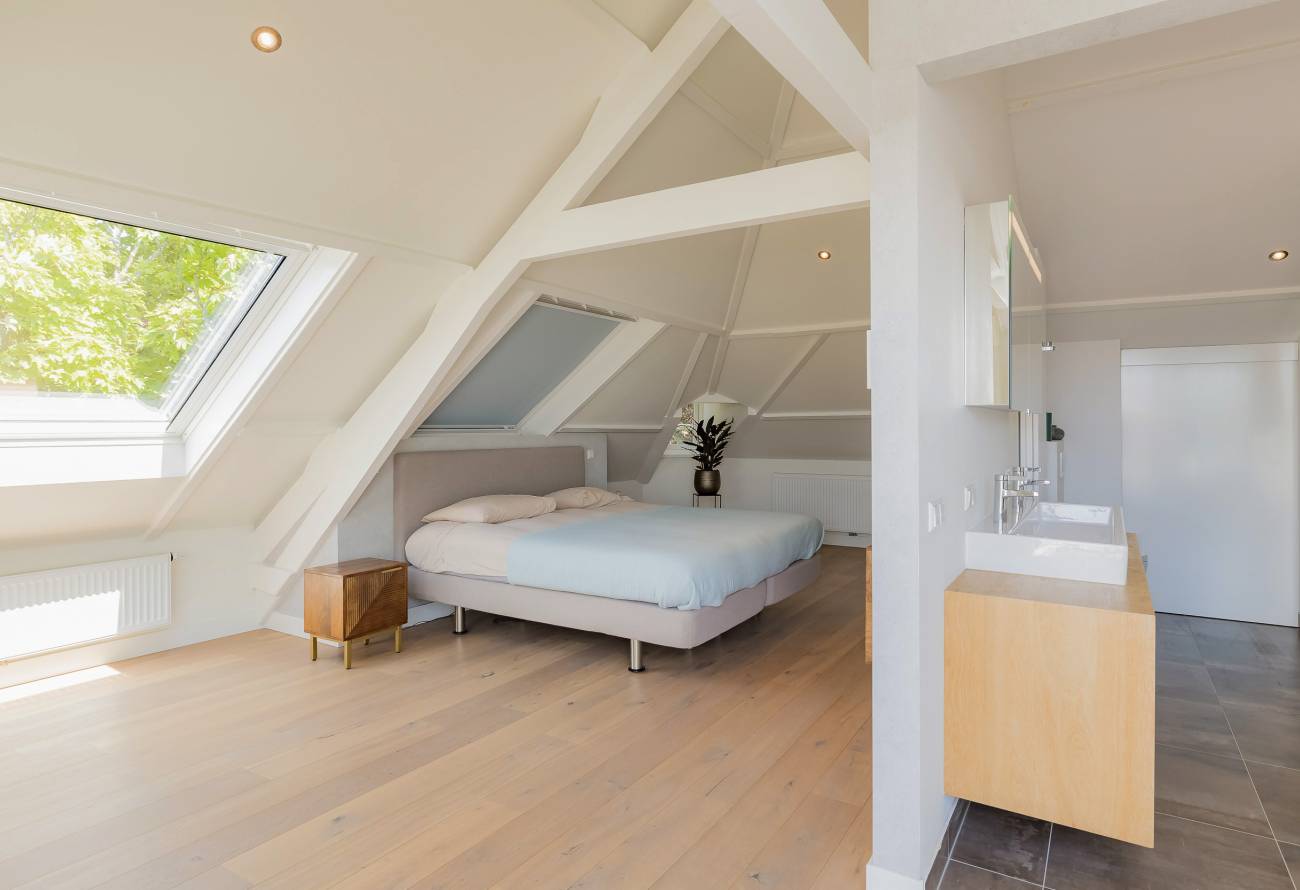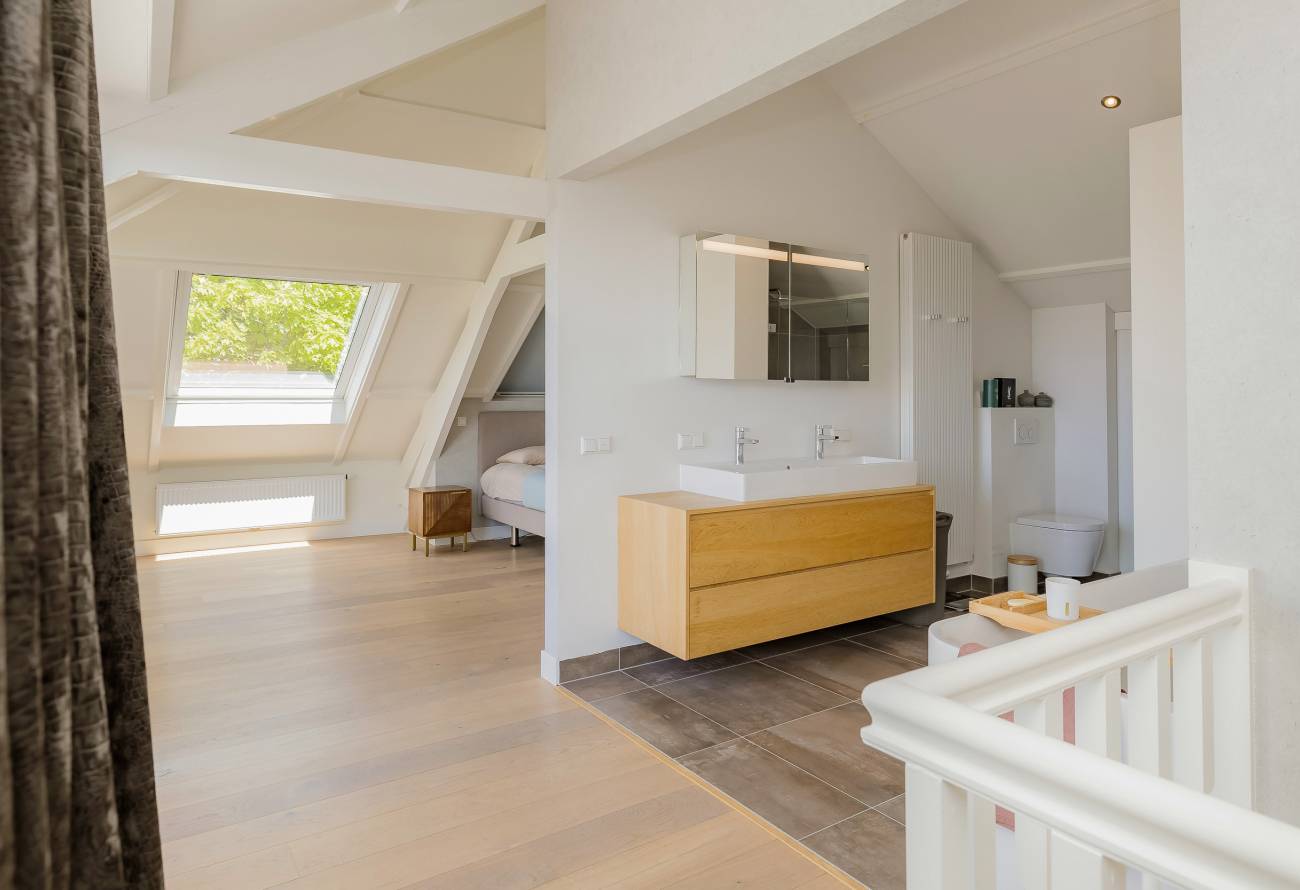 De hoofdslaapkamer bestrijkt de gehele etage en is voorzien van een inpandig balkon/loggia op het westen, inloopgarderobe en een luxe badkamer met ligbad, inloopdouche, 3e toilet en brede wastafel met twee kranen op houten meubel.