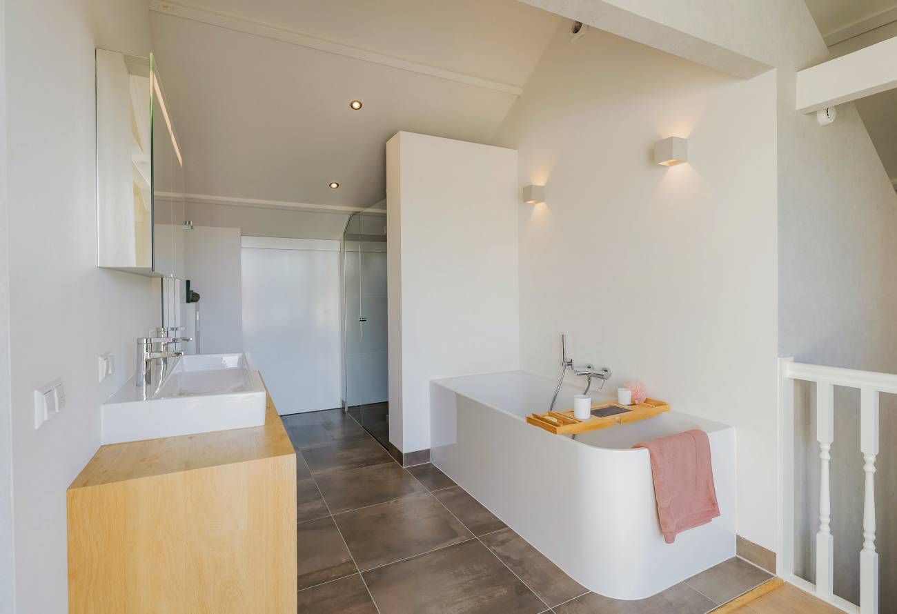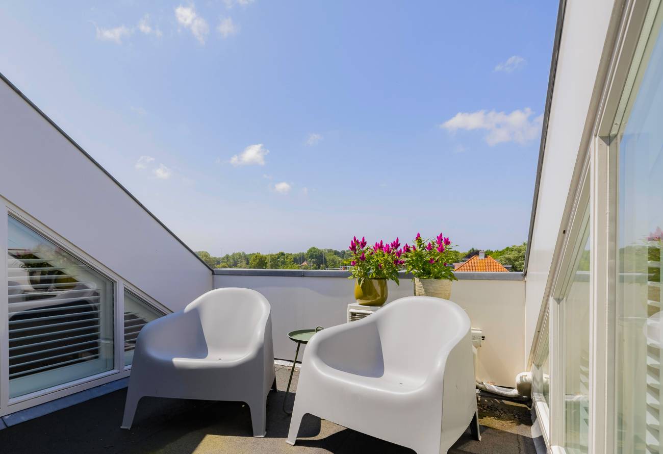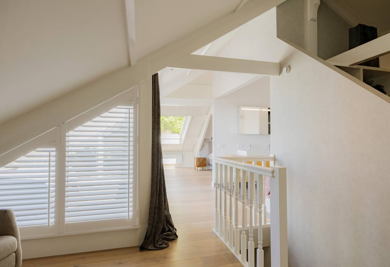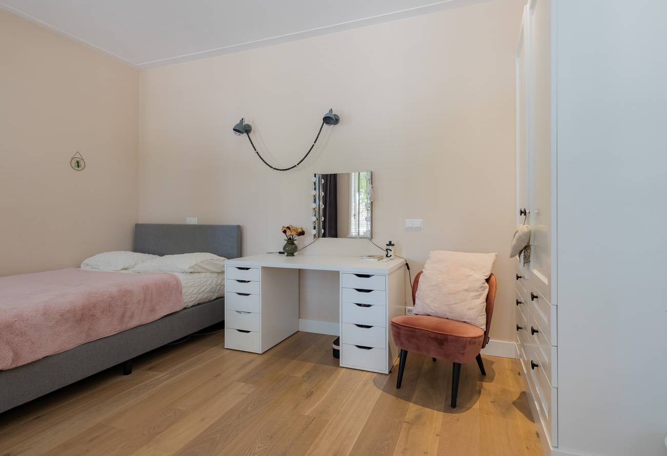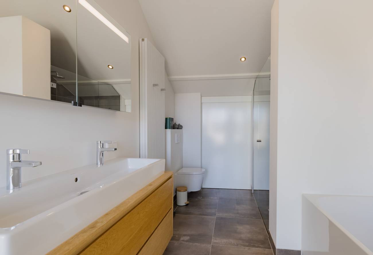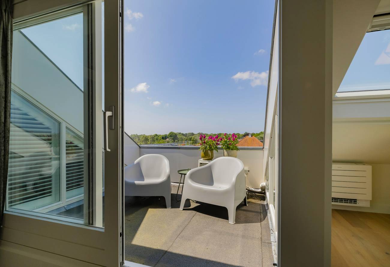 De hoofdslaapkamer bestrijkt de gehele etage en is voorzien van een inpandig balkon/loggia op het westen, inloopgarderobe en een luxe badkamer met ligbad, inloopdouche, 3e toilet en brede wastafel met twee kranen op houten meubel.