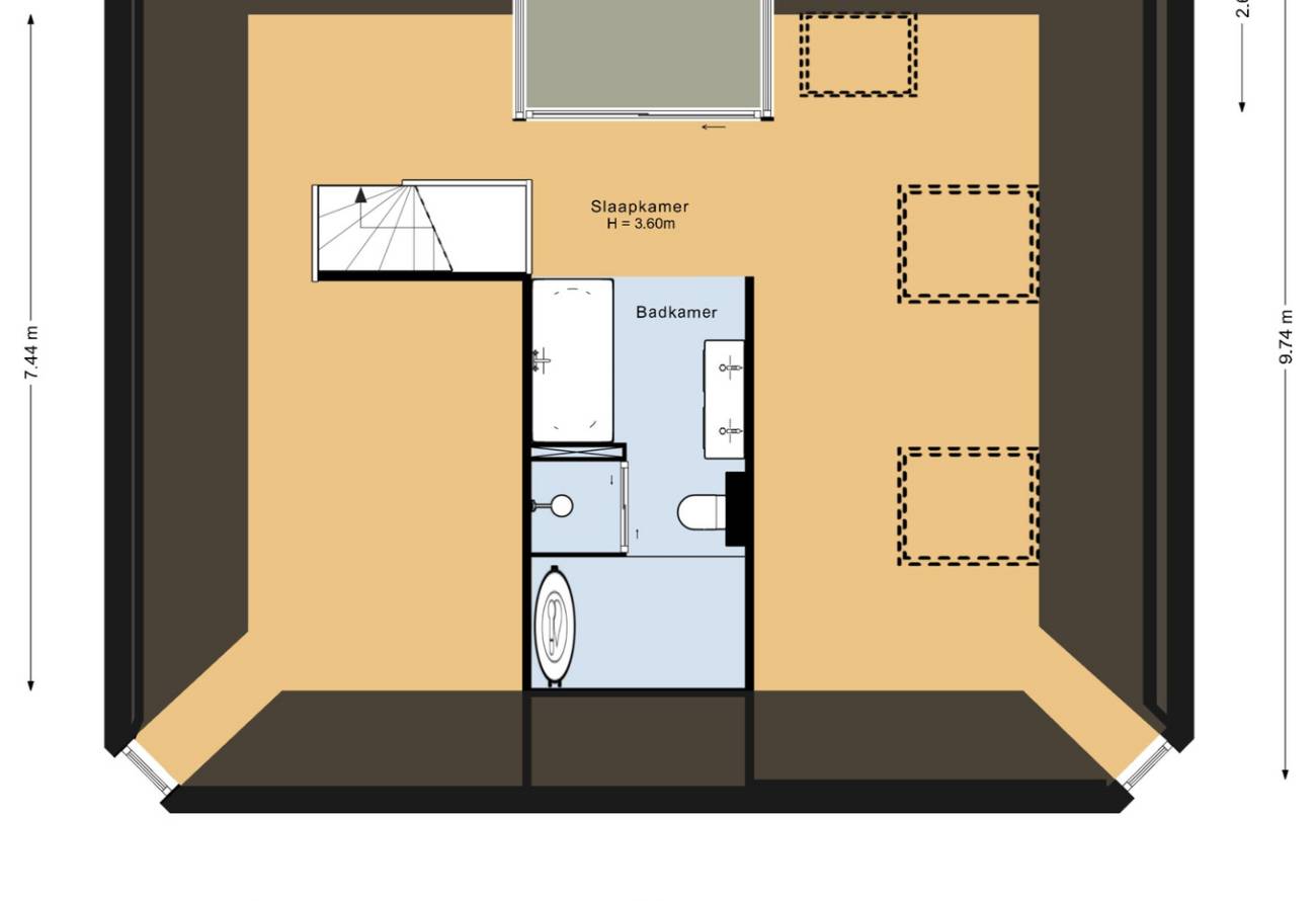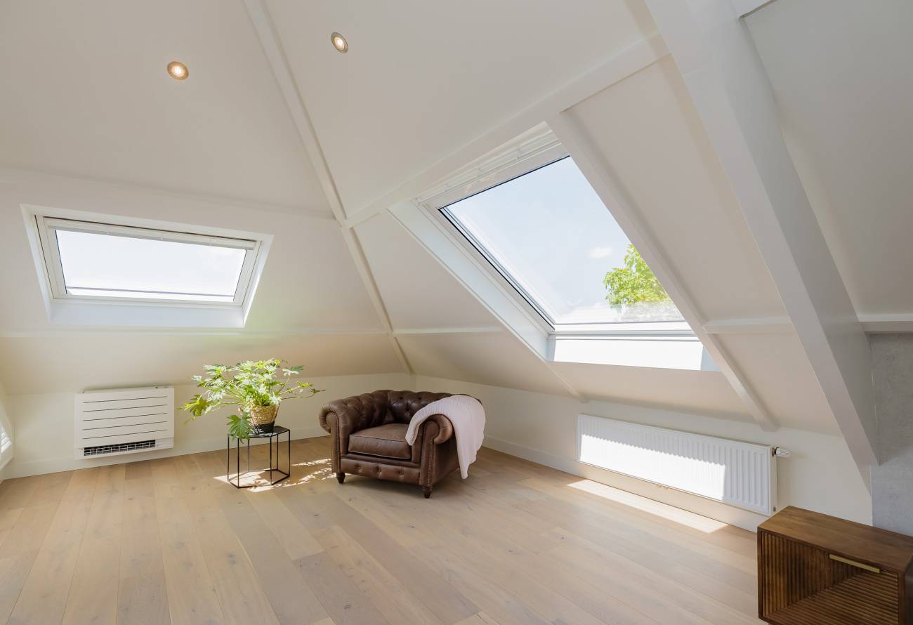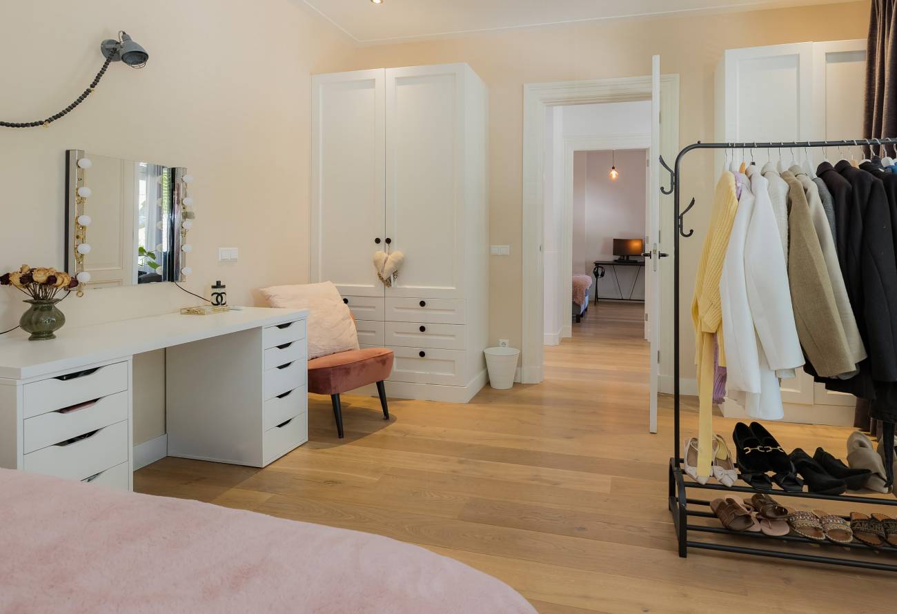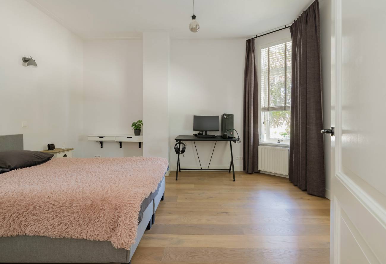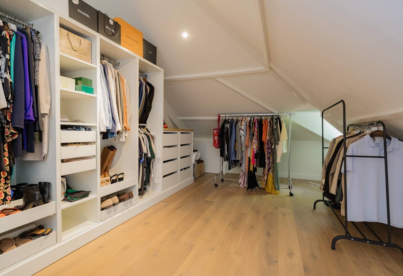 De hoofdslaapkamer bestrijkt de gehele etage en is voorzien van een inpandig balkon/loggia op het westen, inloopgarderobe en een luxe badkamer met ligbad, inloopdouche, 3e toilet en brede wastafel met twee kranen op houten meubel.