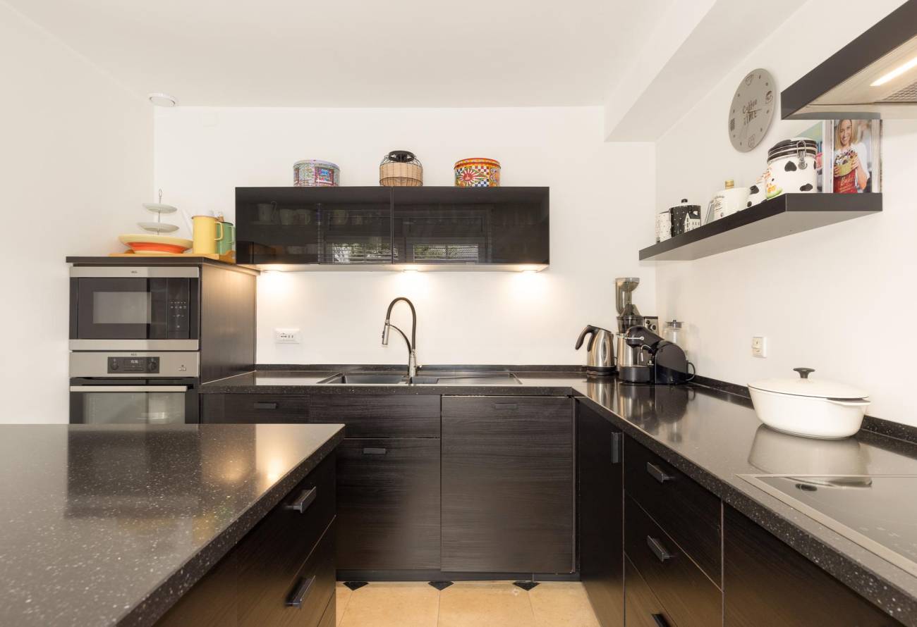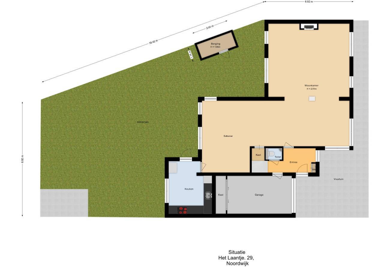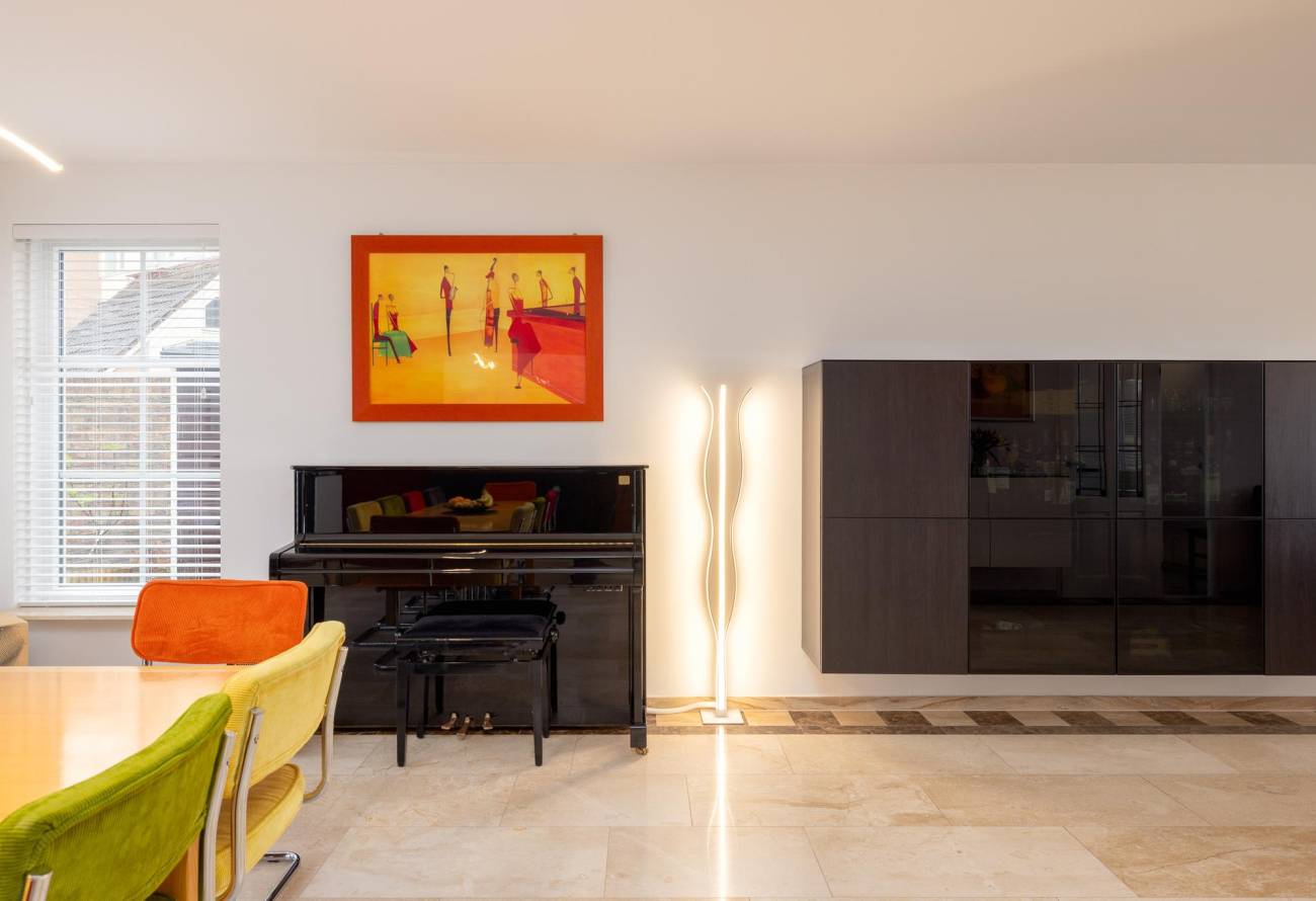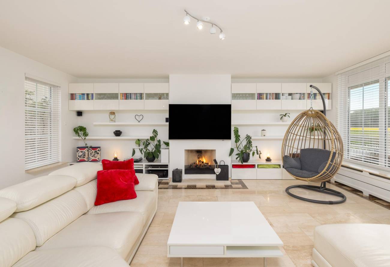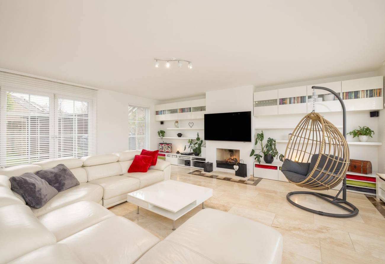 Begane grond: Via de oprit met plaats voor één auto, komt u binnen door de voordeur in de entreehal waaruit u toegang heeft tot de garage/sportruimte, toilet en de woonkamer. De zeer royale L-vormige woonkamer heeft een stenen vloer, gashaard en licht inval van beide zijde met aan de voorzijde een prachtig uitzicht. In de woonkomen treft u ook een ruim eetgedeelte, welke voldoende plaats biedt voor een grote eettafel. Hierachter treft u de lichte keuken (in donkere kleurstelling) welke is voorzien van: een inductie kookplaat, magnetron, hete luchtoven, spoelkraan, vaatwasser en vrij staande koelkast. Vanuit de keuken alsmede de woonkamer heeft u toegang tot de fraai aangelegde groene achtertuin, welke is gelegen in zuidoostelijke richting.