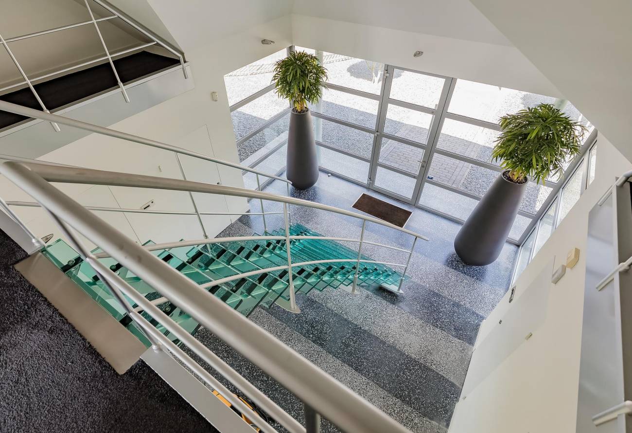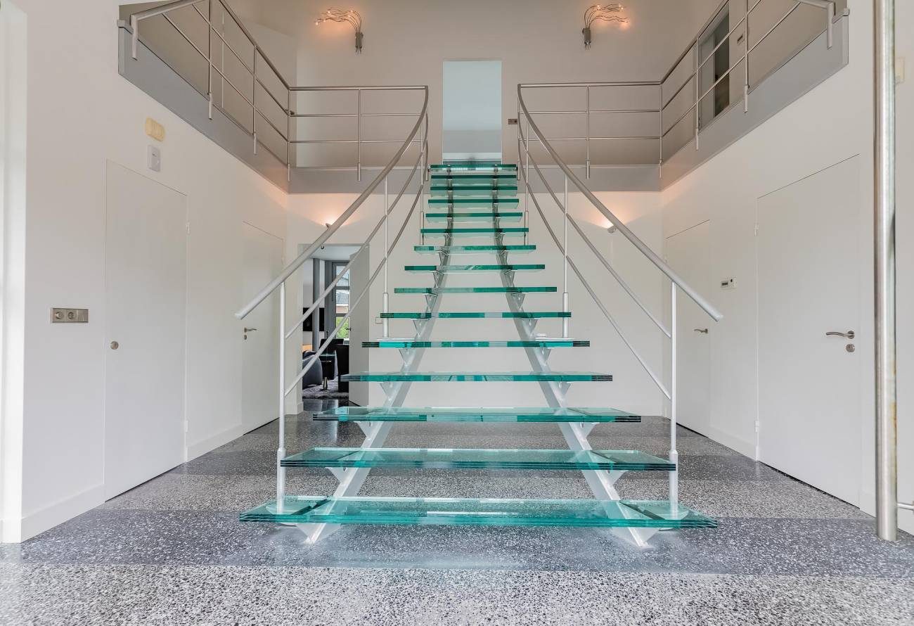Grote lichte hal met vide en de indrukwekkende glazen trap naar boven. De hal is voorzien van getint glas waardoor er geen zicht van buiten naar binnen is.