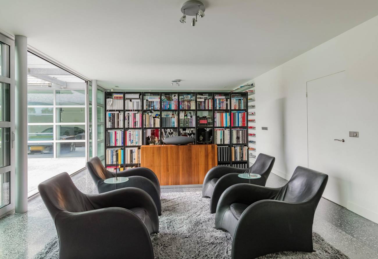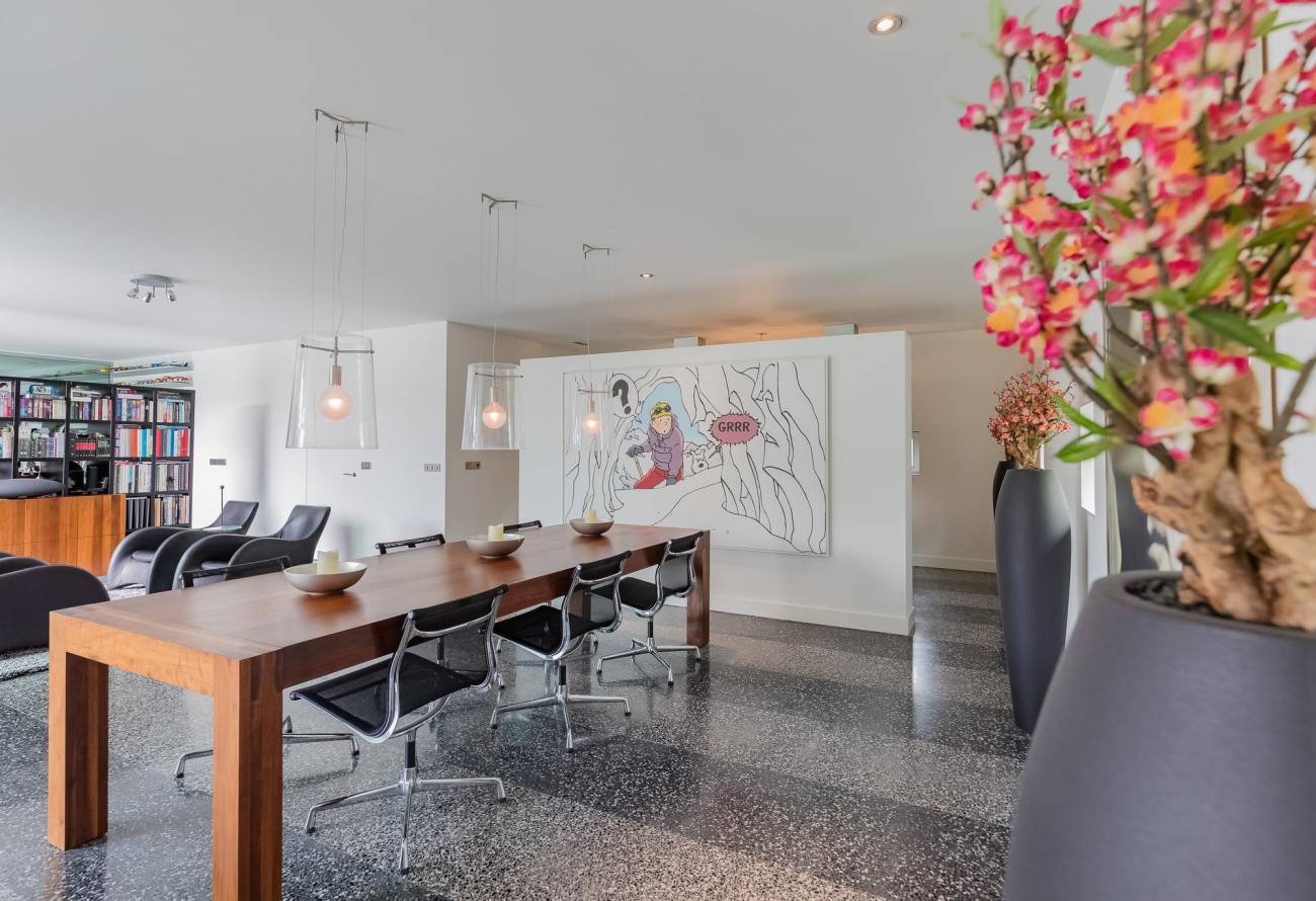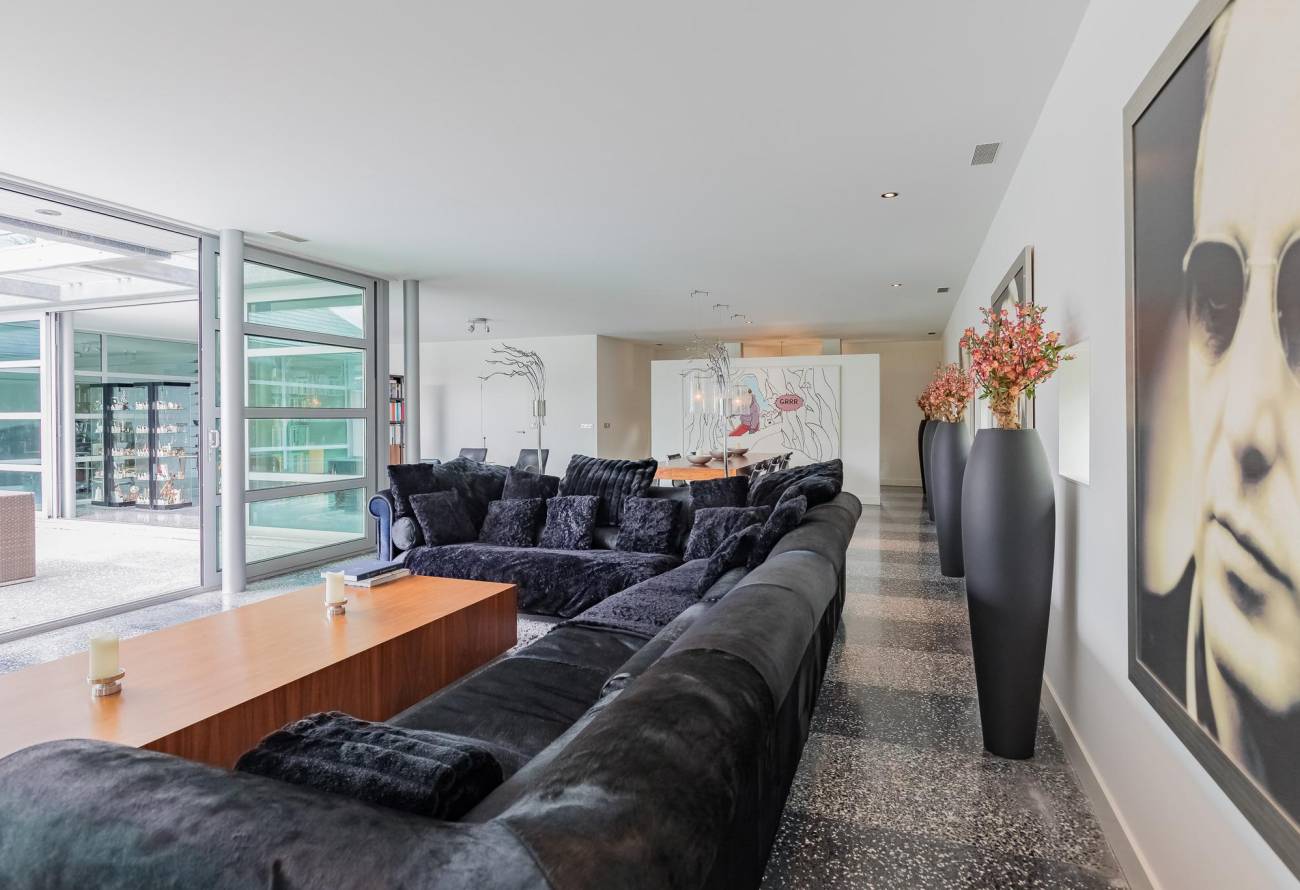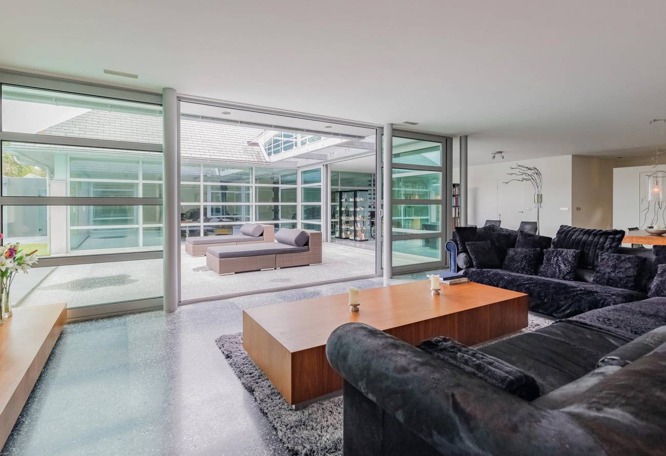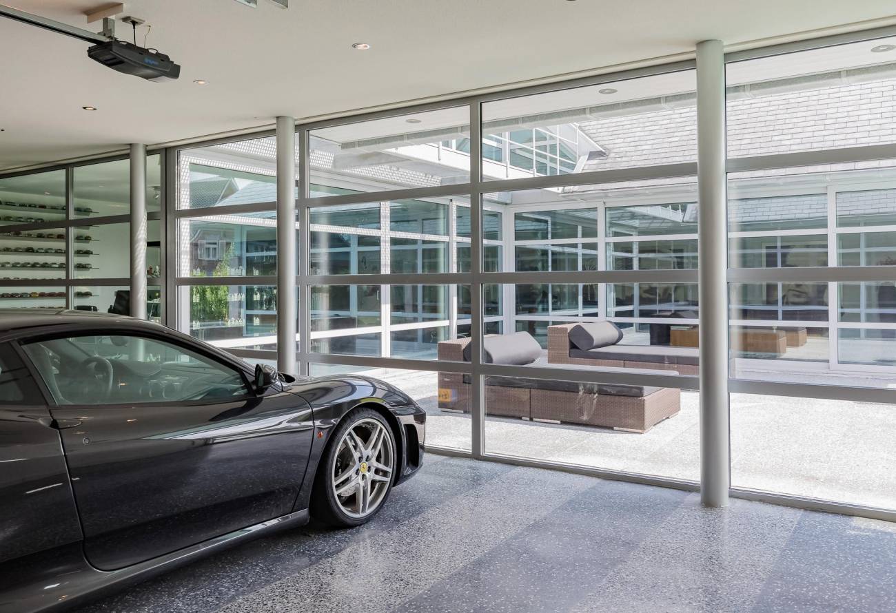 De inpandige garage van 76 m2 is volledig geïsoleerd en ook hier is de terrazzo vloer voorzien van vloerverwarming. De glazen binnenwand is eenvoudig te verwijderen zodat de gehele begane grond één ruimte wordt. Het woonoppervlak komt hiermee op 356m2 (€ 7.008,43 m2)