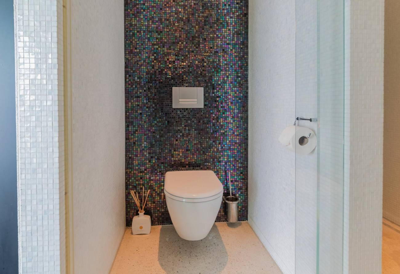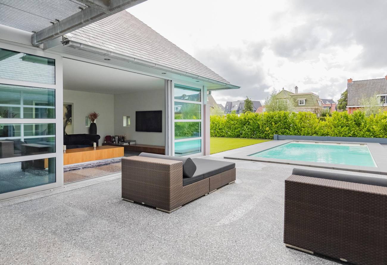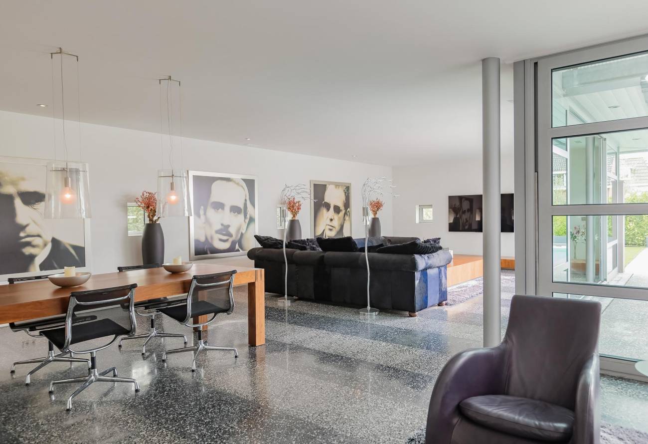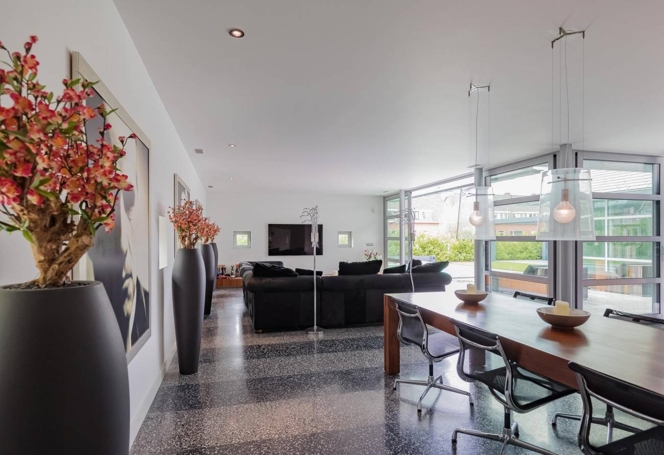 De gehele begane grond is voorzien van een terrazzovloer met vloerverwarming. Om de binnen/buiten beleving te versterken geven grote schuifpuien toegang tot de tuin en is de Terrazzovloer naar buiten doorgetrokken.