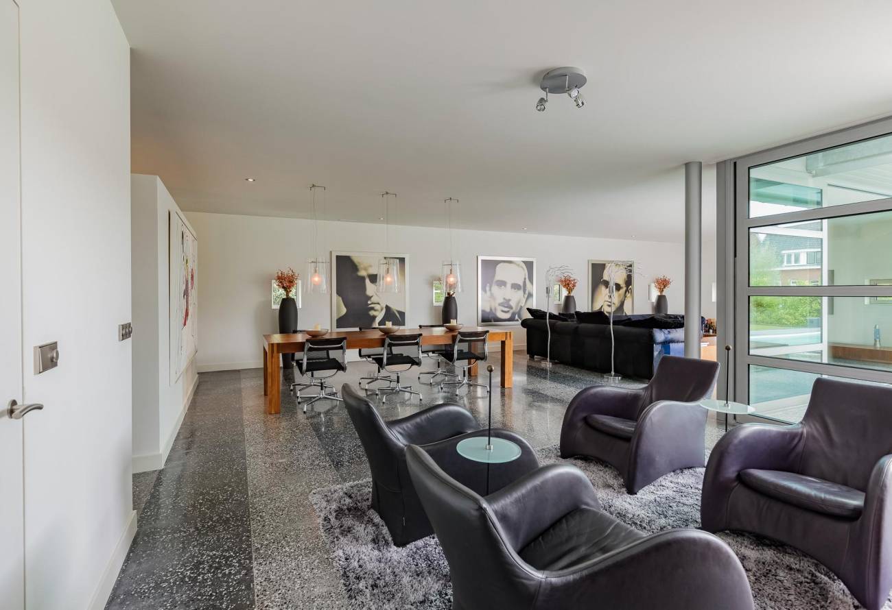 De grote woonkamer heeft een overspanning van wel 18 meter. Genoeg ruimte voor een royale zithoek en een grote eettafel voor gezellige diners.