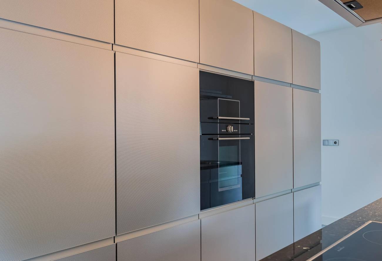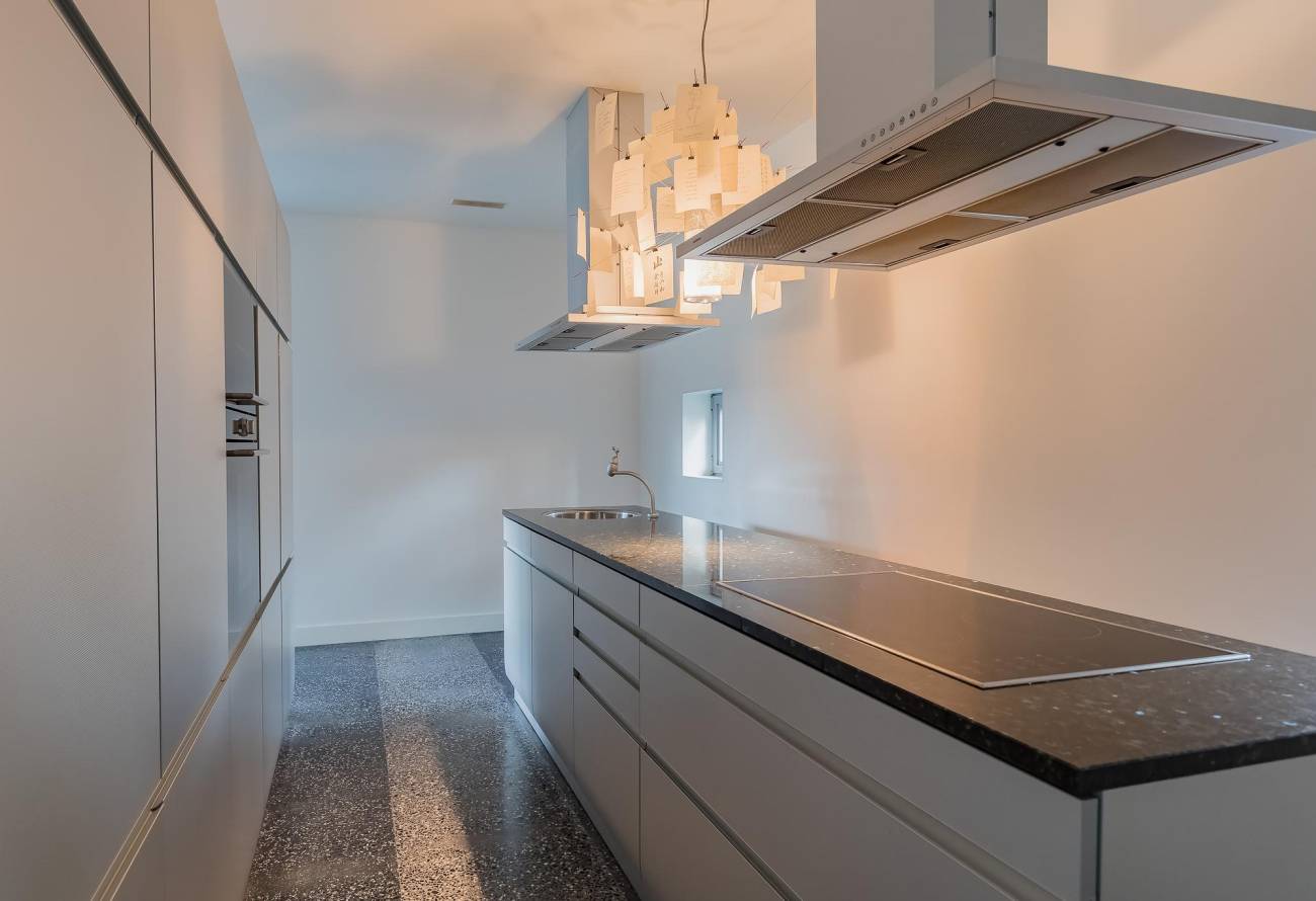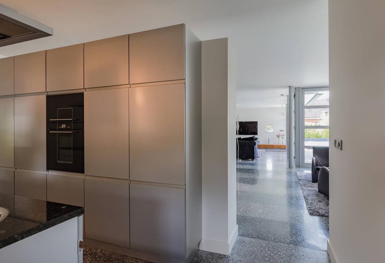 De keuken, waar de symmetrie ook terugkomt, is voorzien van luxe inbouwapparatuur en als roomdivider afgescheiden van de eetkamer.