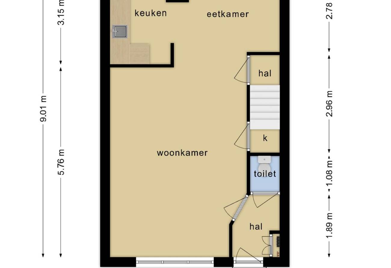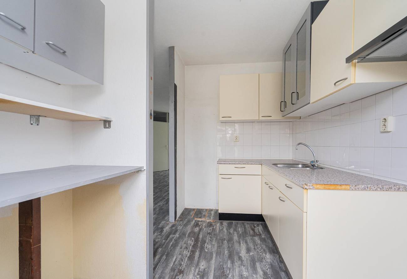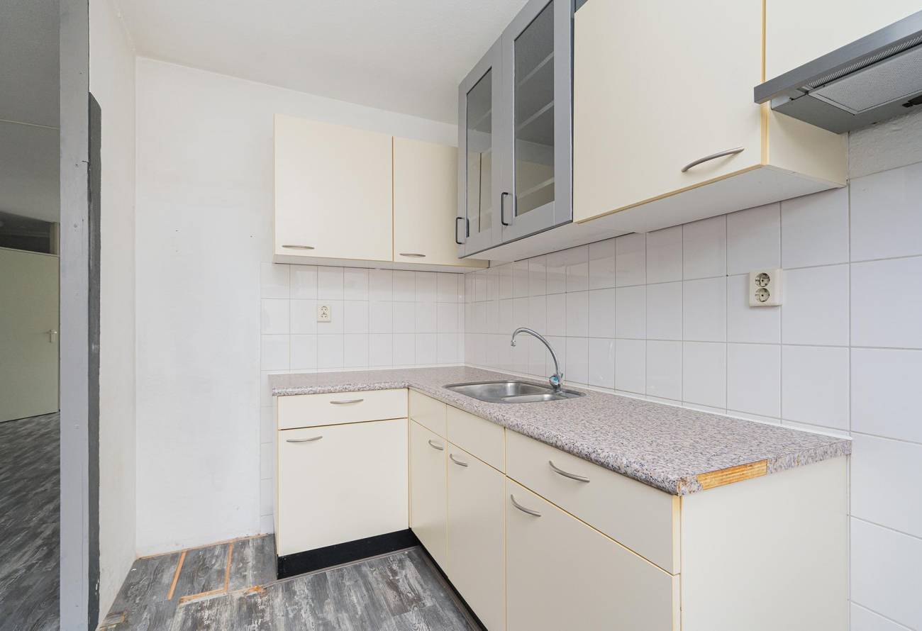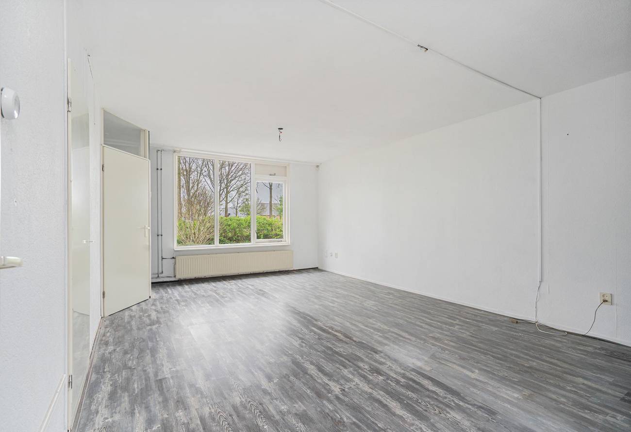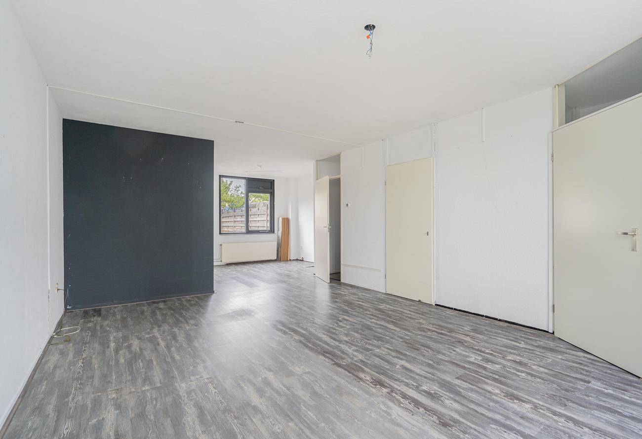 Entree naar hal met toilet en deur naar de  royale lichte (doorzon) woonkamer met vrij zicht aan voorzijde. De half openkeuken in L-opstelling is in de hoek van de kamer gesitueerd en is voorzien van een eenvoudige inrichting. Er is toegang (via deur) tot de tuin met zonneterras. Tegenover de keuken is er ruimte voor het plaatsen van een eettafel, verder is er ook vanuit hier een deur naar de tuin.