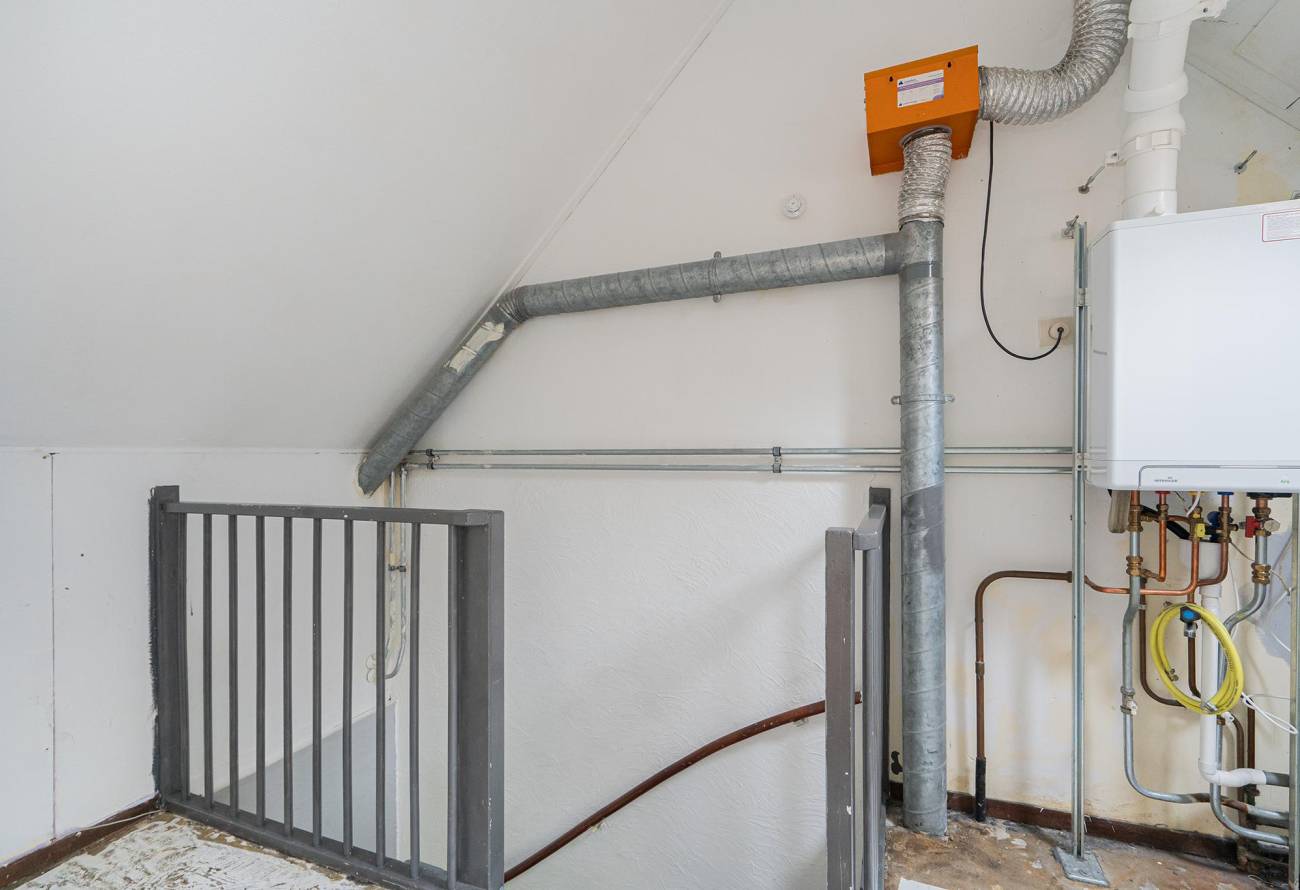 Vaste trap naar ruime voorzolder met Velux dakraam, nieuwe c.v. installatie (Intergas 2022), mechanische ventilatie en aansluiting voor wasapparatuur. Tevens is hier een 4e slaapkamer met groot Velux dakraam, extra handig hier zijn de knieschotten onder de kap.