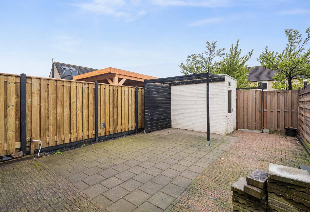 Aan de achterzijde is een royale  vrijstaande stenen berging met elektra. De achtertuin is 10 meter diep en voorzien van betegeling en een achterom.
