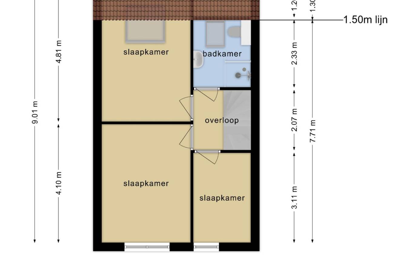 Vanuit de woonkamer is er een deur naar halletje met trap naar de overloop van de 1e etage met drie slaapkamers en een badkamer. De  1e slaapkamer is aan de voorzijde gelegen, de andere 2 slaapkamers zijn aan de achterzijde, waarvan 1 met nieuw Velux dakraam. De eenvoudig ingerichte badkamer (voorzijde) is voorzien van een  doucheruimte, ligbad, wastafel en 2e toilet.