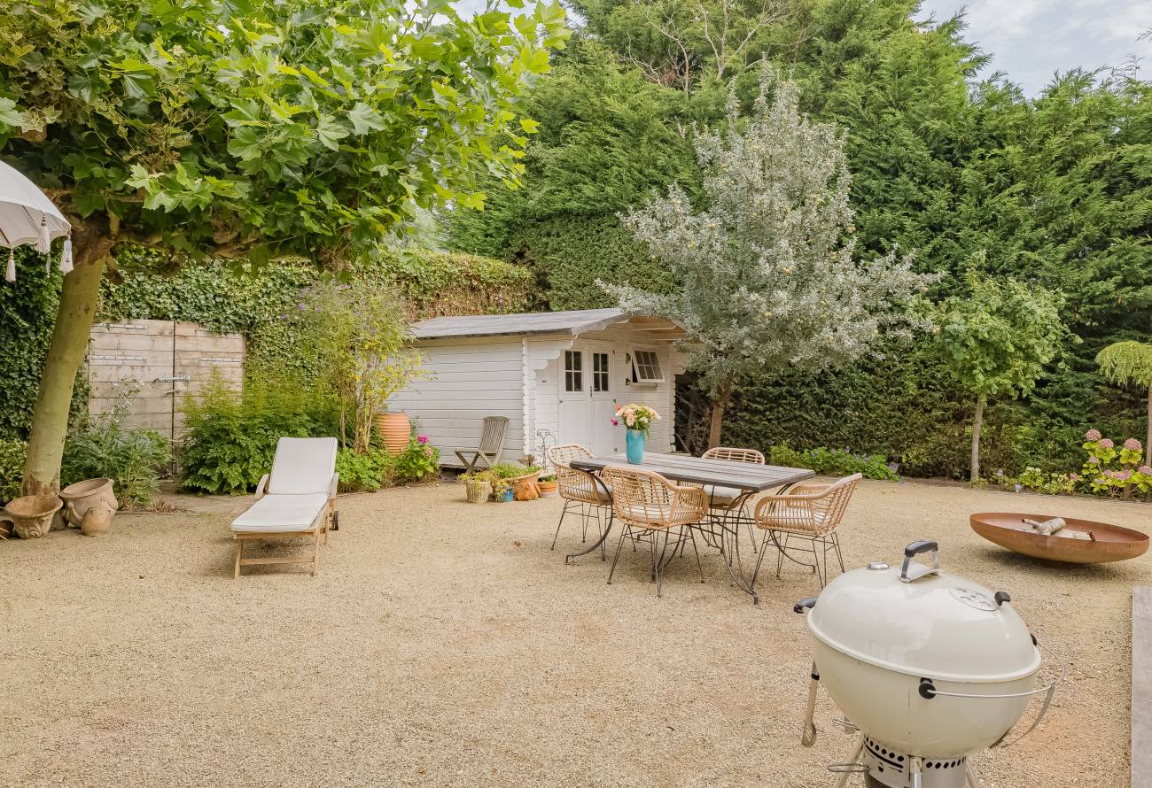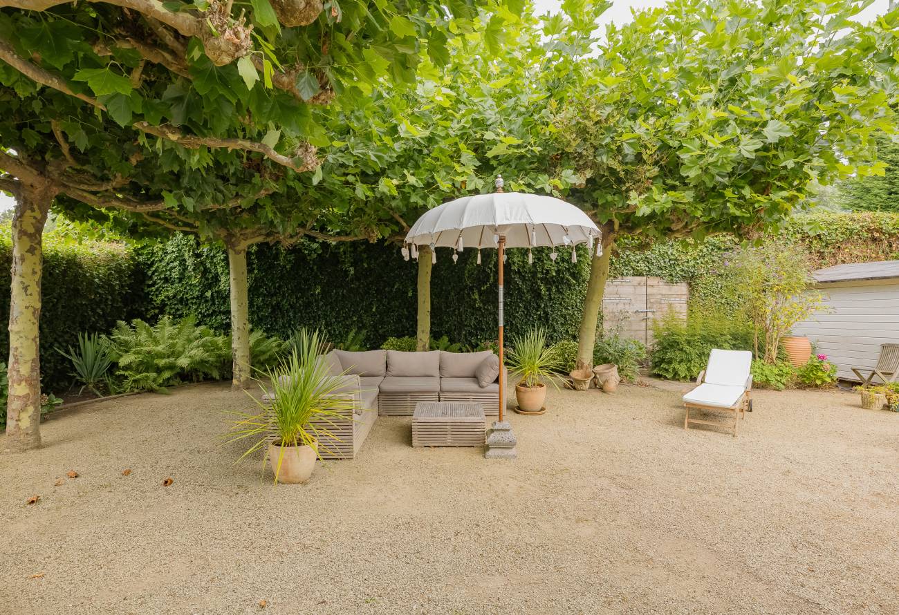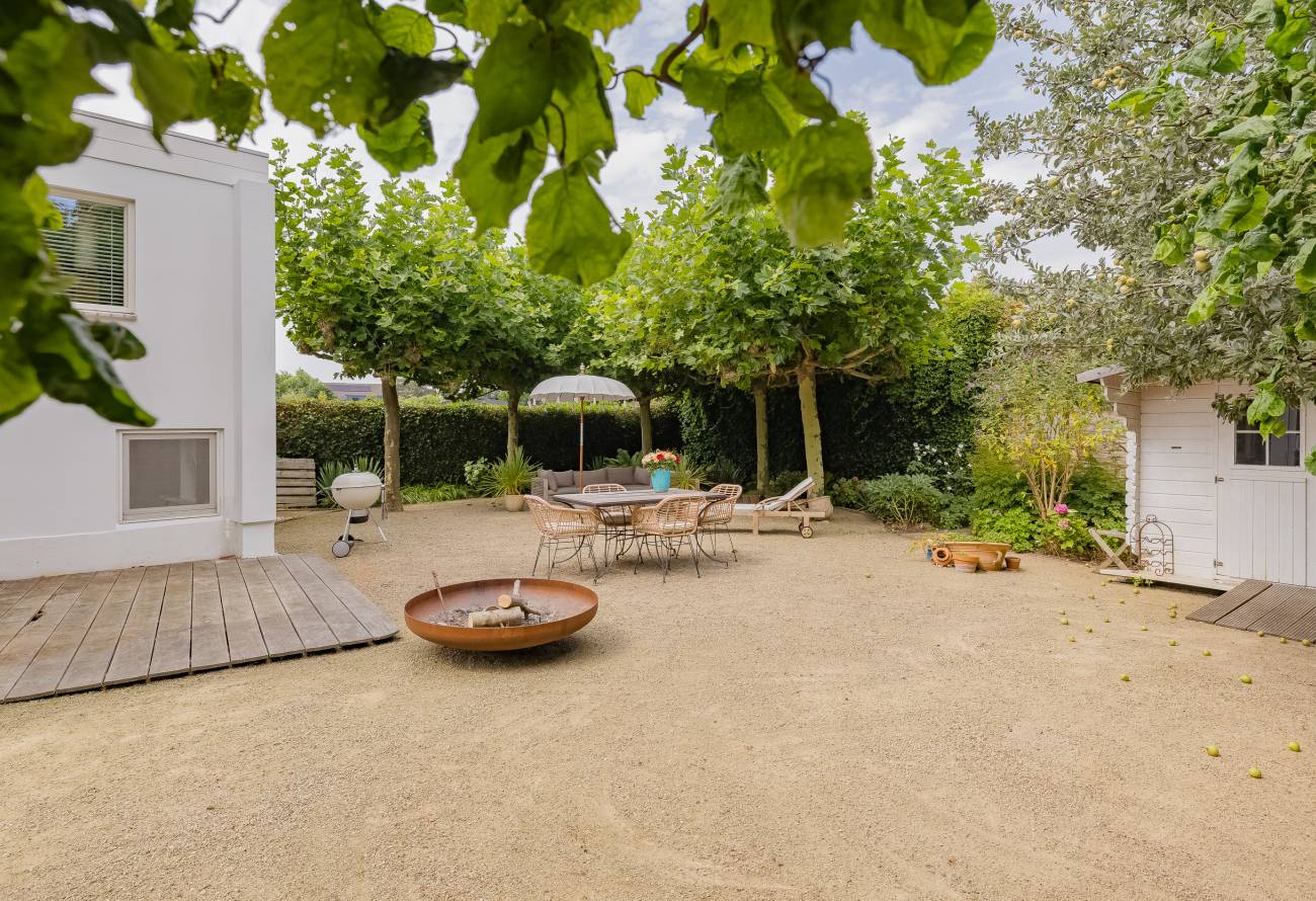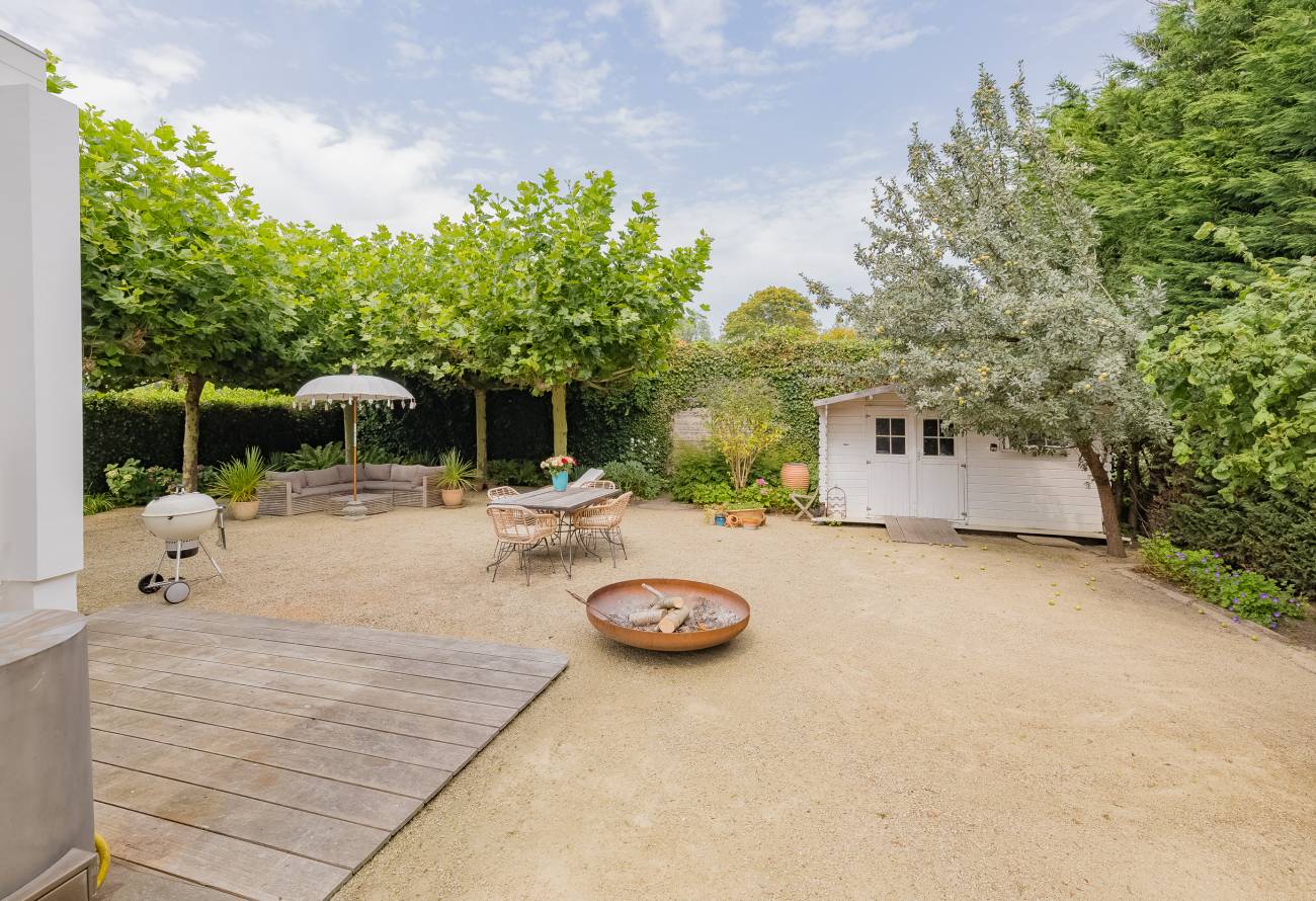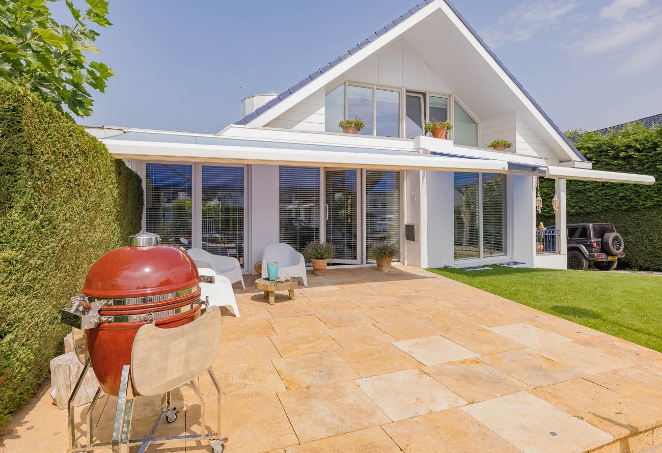 Vanuit de voortuin heb je heerlijk uitzicht over het water en onder de grote zonneschermen bij zonnig weer is het aangenaam in de schaduw zitten. In de riante achtertuin is er veel privacy door groen en bomen. Er is een blokhut en door het grotendeels met grint bedekte tuin is het ook nog zeer onderhoudsvriendelijk. Het verhoogde terras/veranda heeft een gezellige haard en via een trap is er toegang tot de tuin.