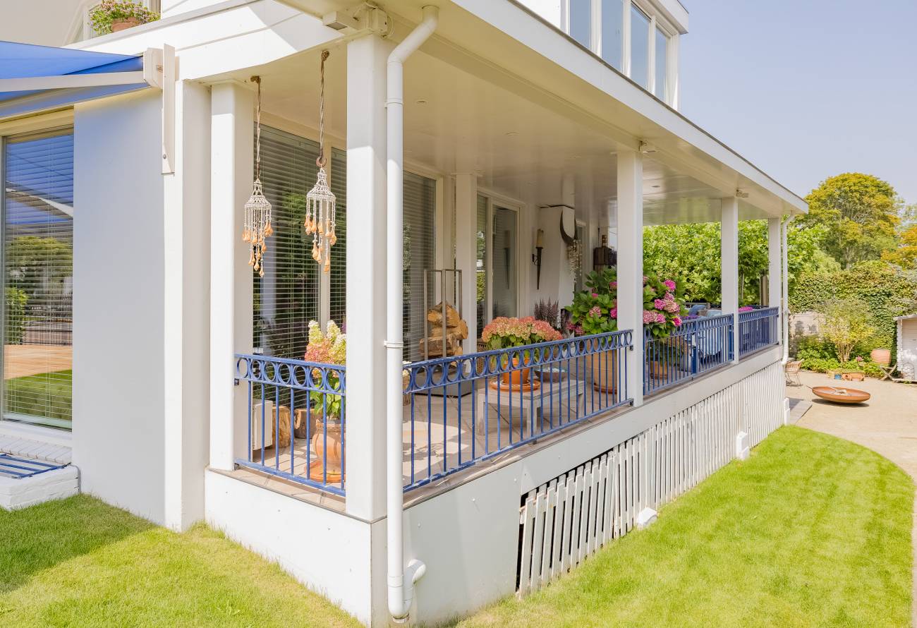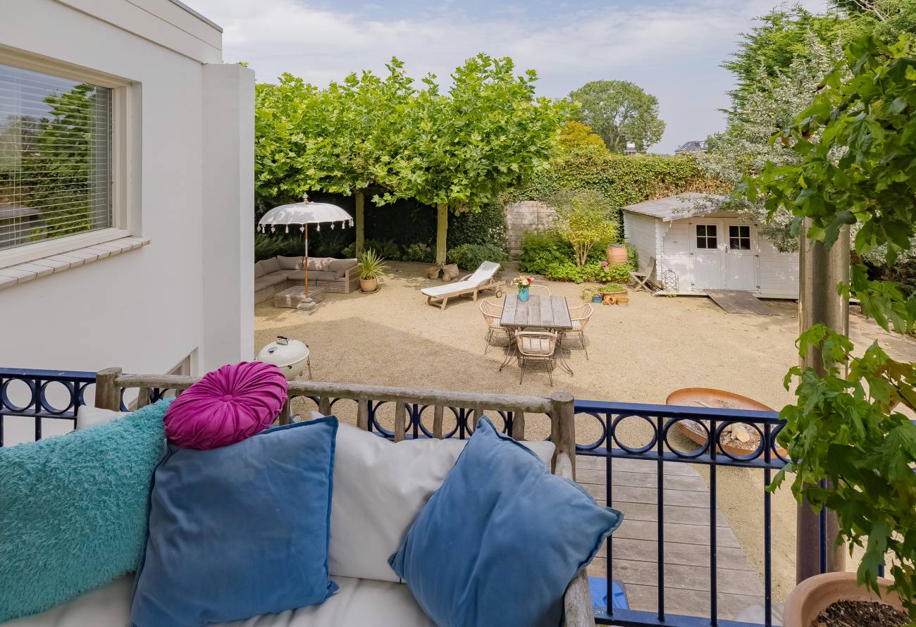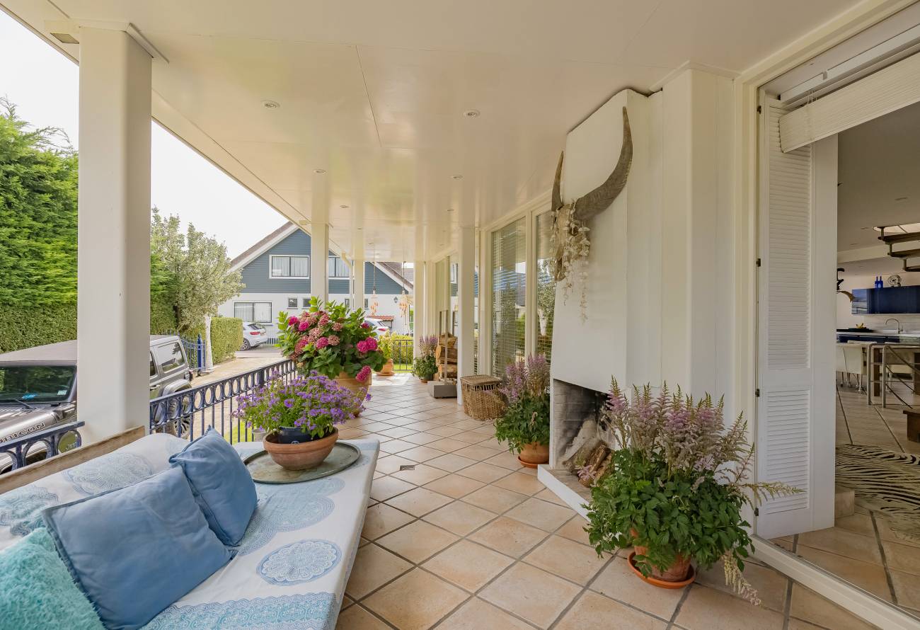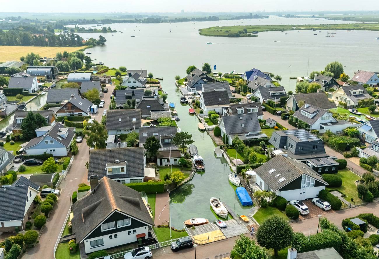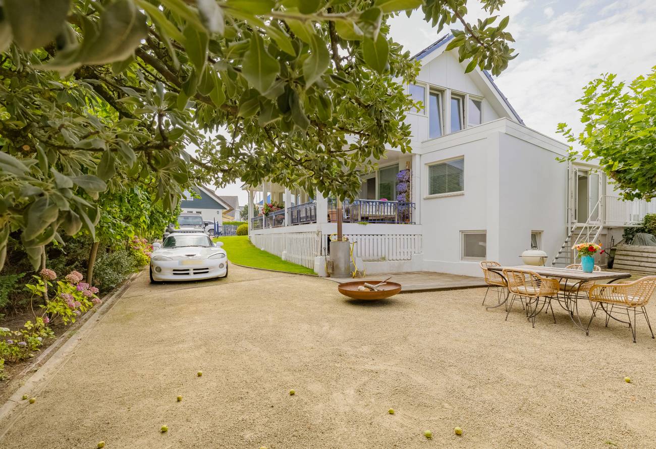 Vanuit de voortuin heb je heerlijk uitzicht over het water en onder de grote zonneschermen bij zonnig weer is het aangenaam in de schaduw zitten. In de riante achtertuin is er veel privacy door groen en bomen. Er is een blokhut en door het grotendeels met grint bedekte tuin is het ook nog zeer onderhoudsvriendelijk. Het verhoogde terras/veranda heeft een gezellige haard en via een trap is er toegang tot de tuin.
