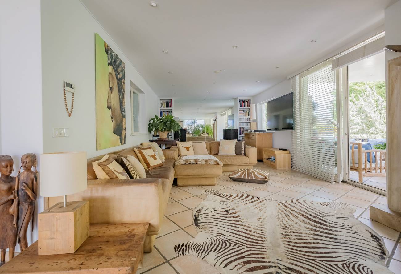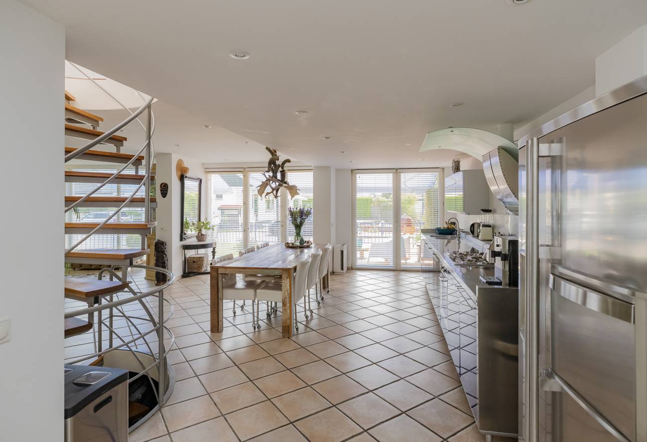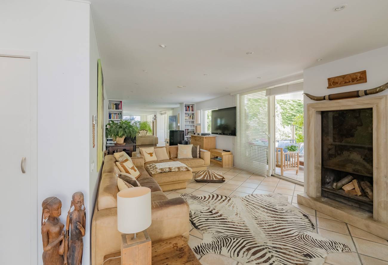 Je komt via de voortuin binnen in een ruime en lichte living met fraaie openhaard in schouw, een moderne open keuken in rechte opstelling en grote schuifpuien naar het verhoogde terras aan de achterzijde. De ideale plek voor lange zomeravonden en gezellige diners. Er is een schuifpui naar de handige bijkeuken met opstelling van wassen en drogen. Vanuit hier is er ook een deur naar het verhoogde terras.
