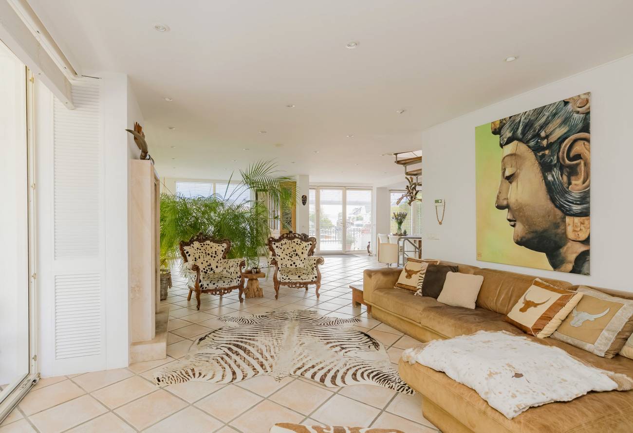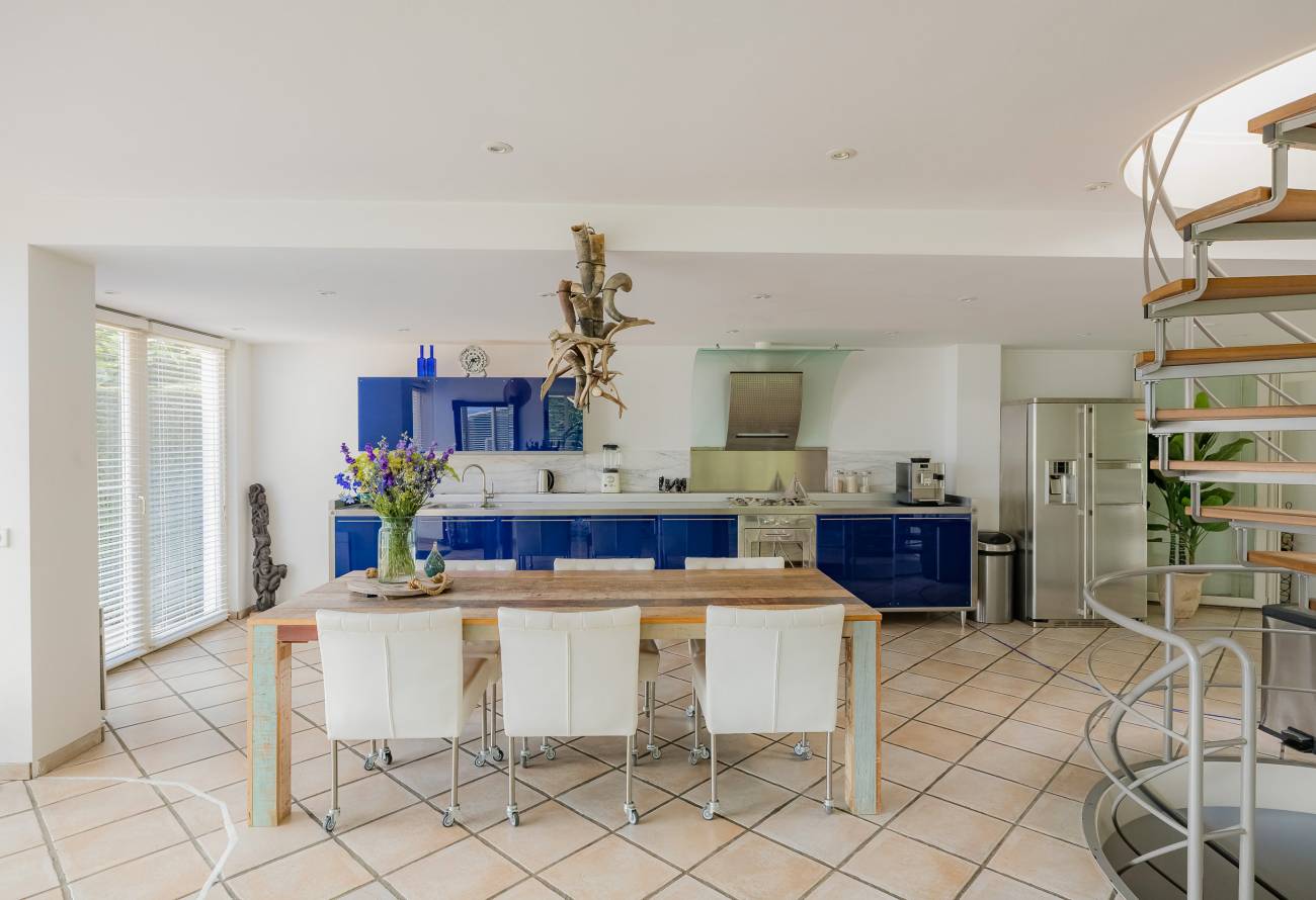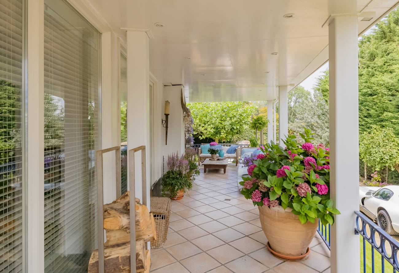 Je komt via de voortuin binnen in een ruime en lichte living met fraaie openhaard in schouw, een moderne open keuken in rechte opstelling en grote schuifpuien naar het verhoogde terras aan de achterzijde. De ideale plek voor lange zomeravonden en gezellige diners. Er is een schuifpui naar de handige bijkeuken met opstelling van wassen en drogen. Vanuit hier is er ook een deur naar het verhoogde terras.