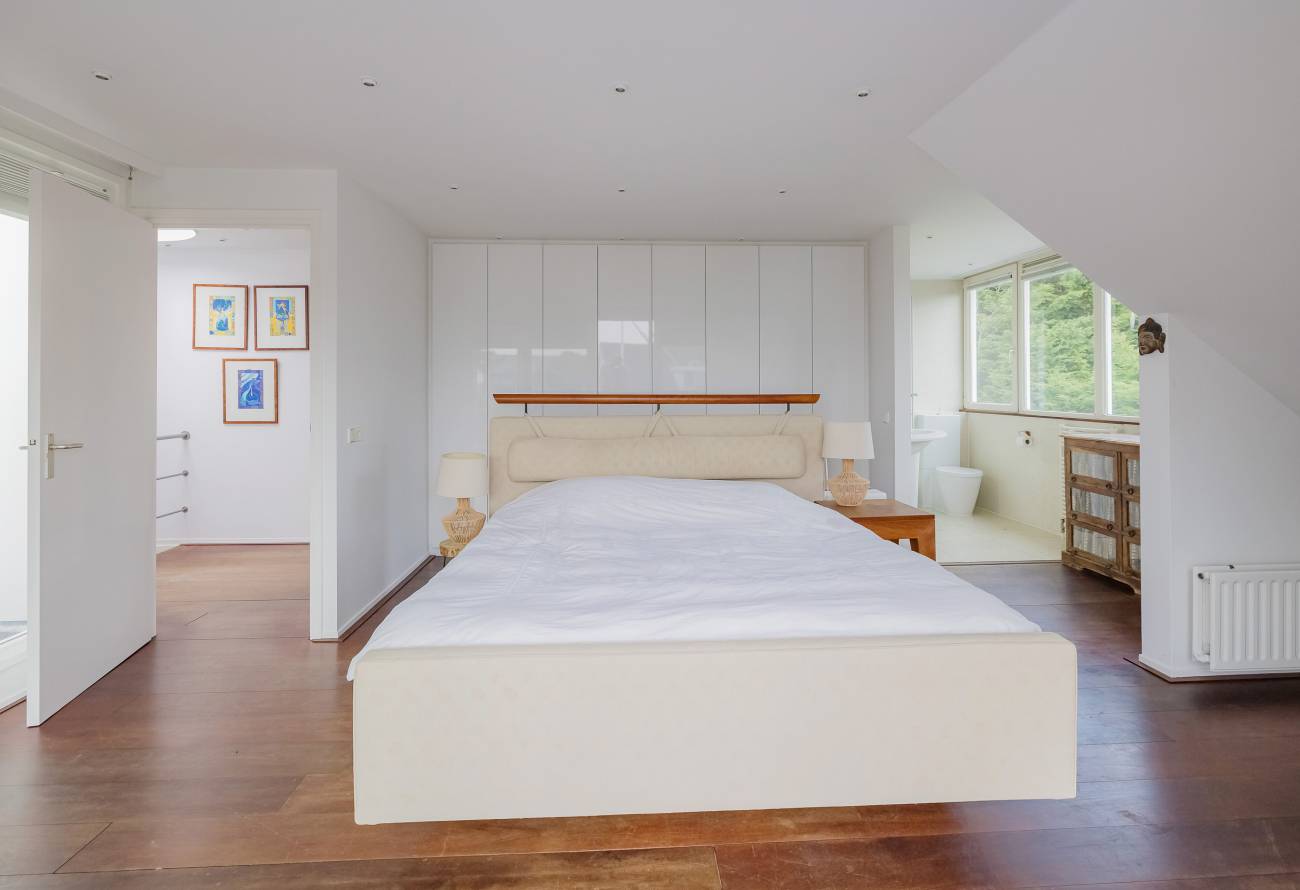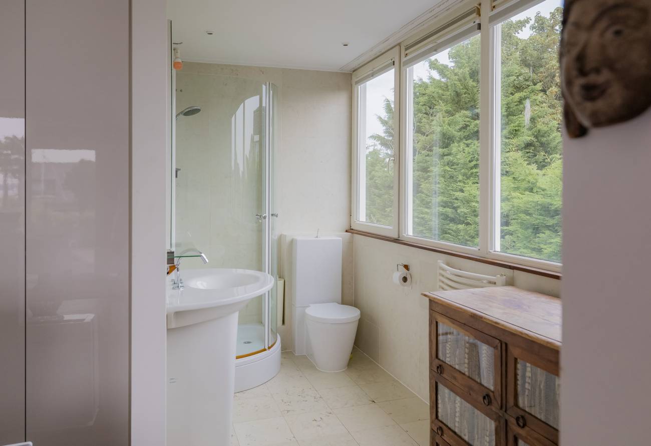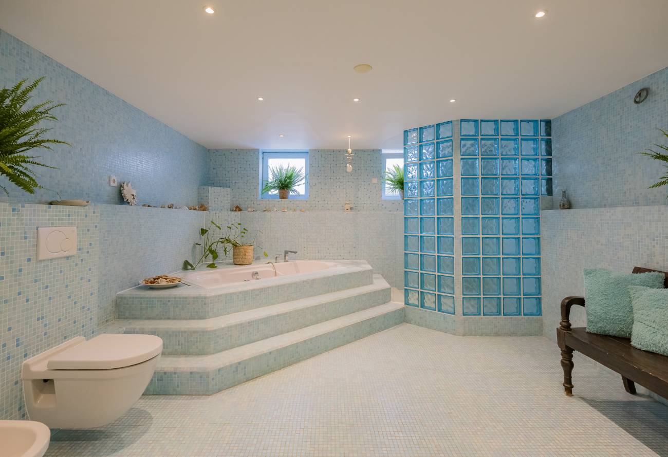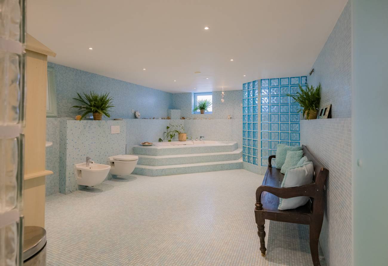 Verrassend grote ruimte met een zeer royale badkamer met ligbad op een verhoging, aparte douche, toilet, bidet en dubbele wastafel, perfect voor ultiem ontspannen. Het souterrain beschikt bovendien over een eigen fitnessruimte.