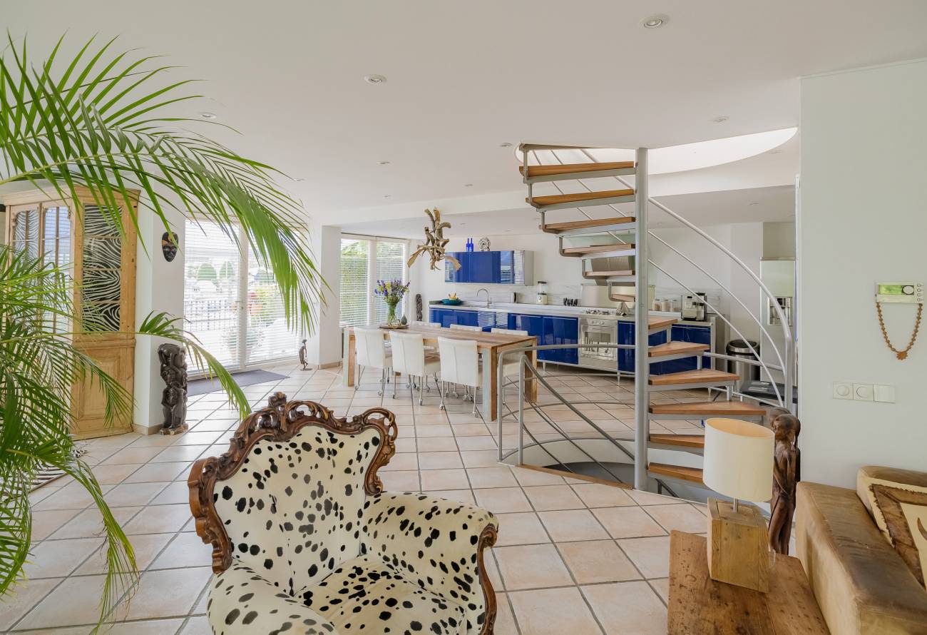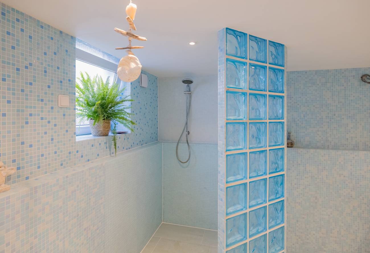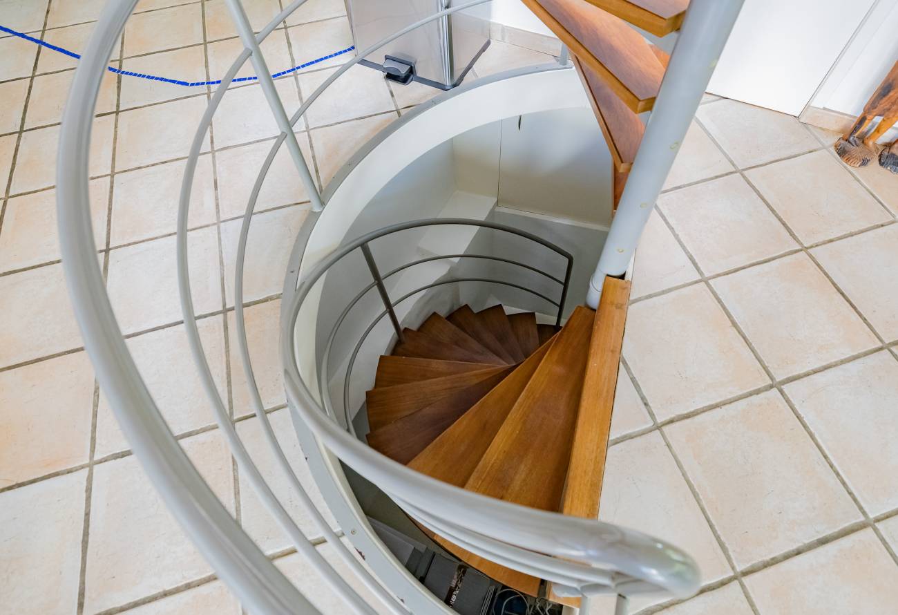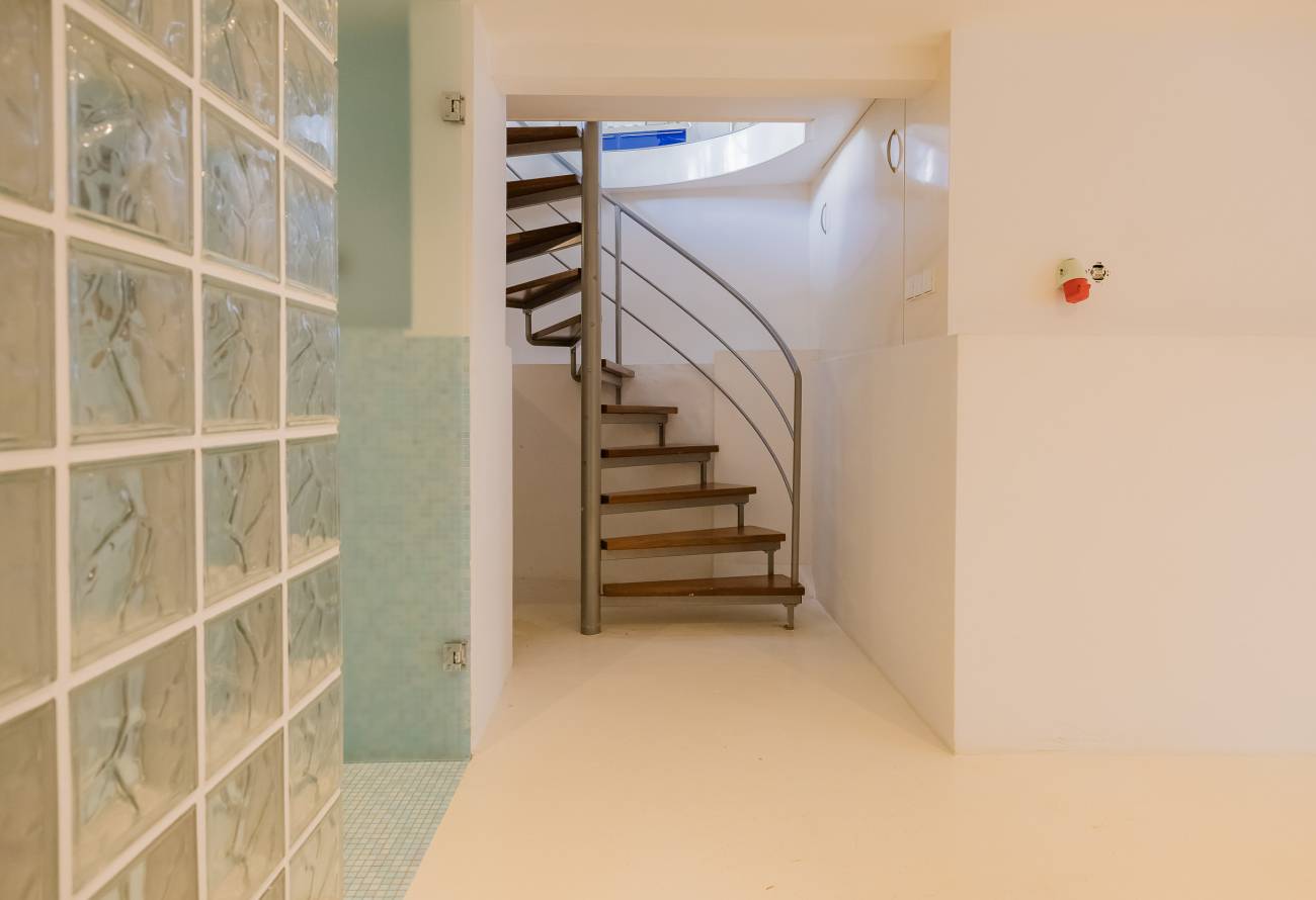 Verrassend grote ruimte met een zeer royale badkamer met ligbad op een verhoging, aparte douche, toilet, bidet en dubbele wastafel, perfect voor ultiem ontspannen. Het souterrain beschikt bovendien over een eigen fitnessruimte.