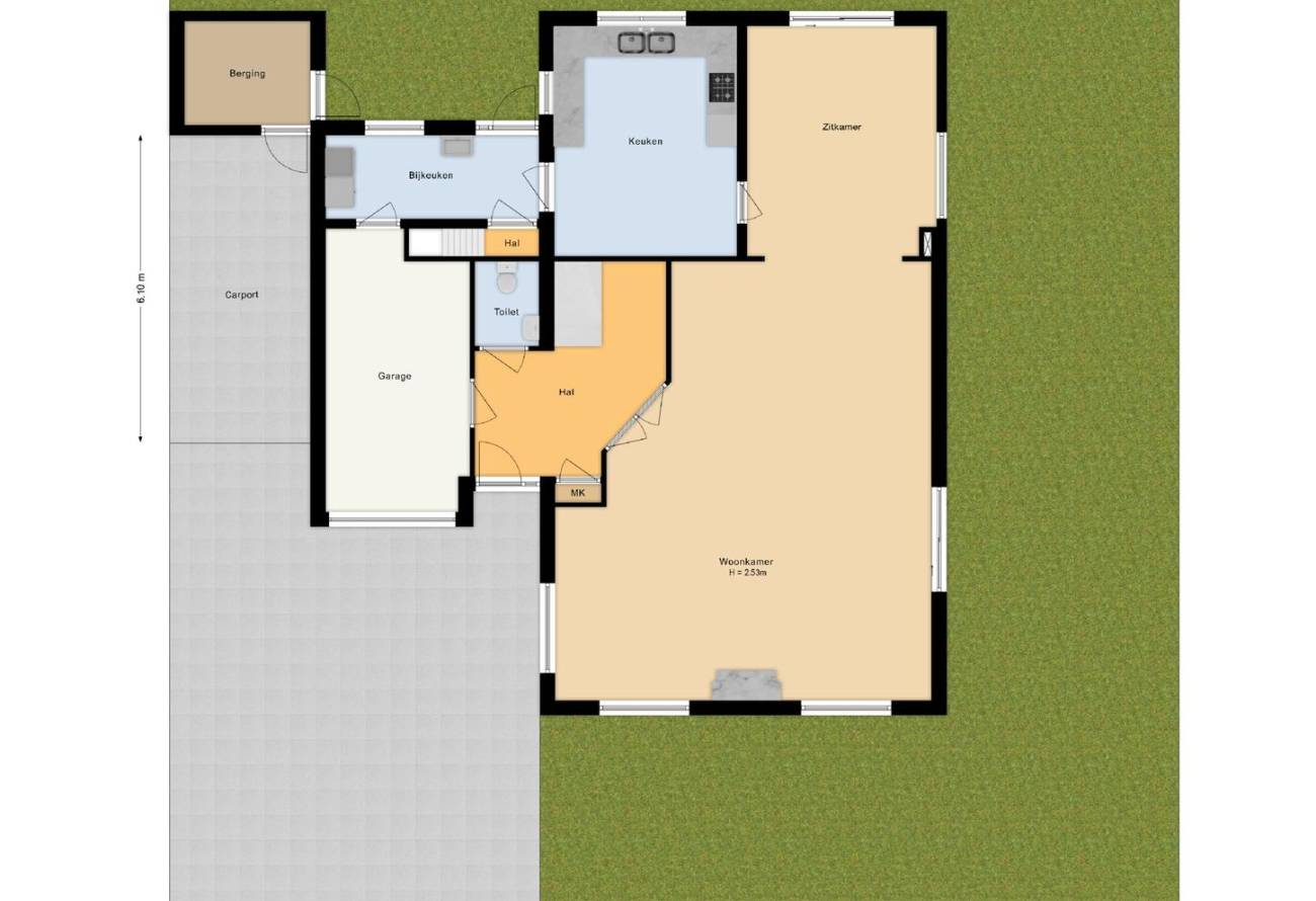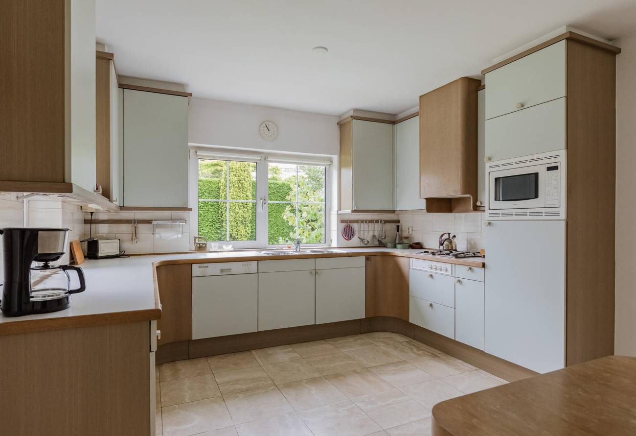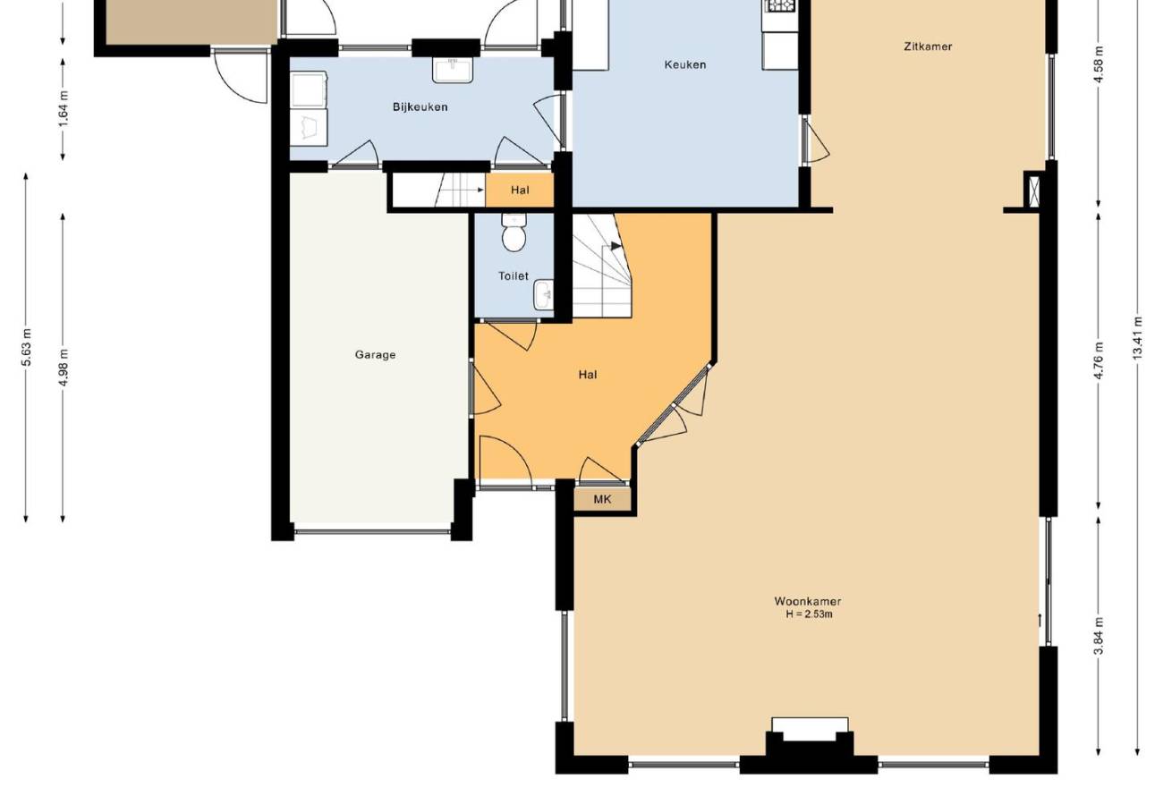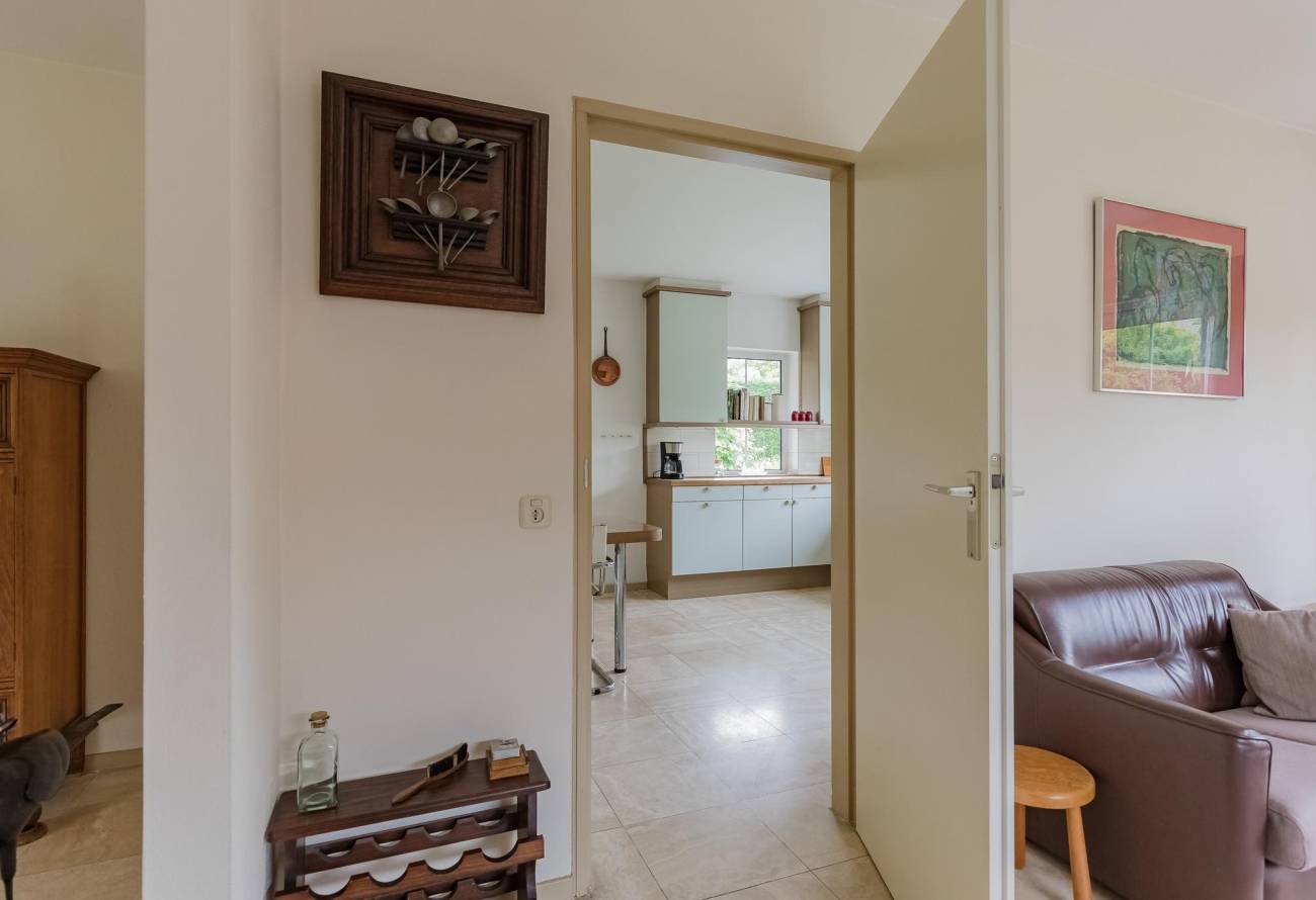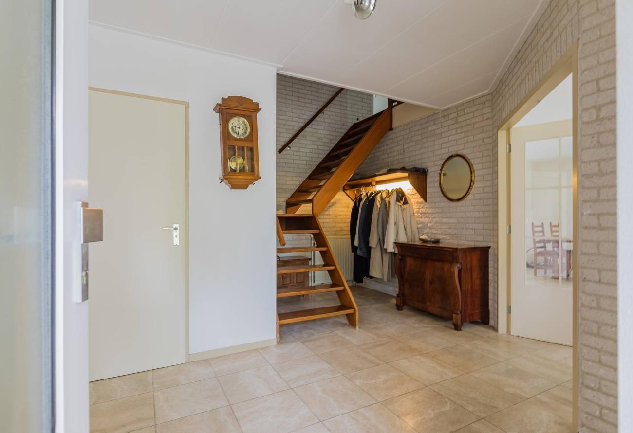 Begane grond: entree, meterkast, toilet, open trap, toegangsdeur naar de garage, openslaande deuren naar de woonkamer, royale living met open hard en schuifpui naar de tuin, eetkamer, ruime keuken met toegang tot praktische bijkeuken en kelder, 2e toegangsdeur naar de garage via de bijkeuken.