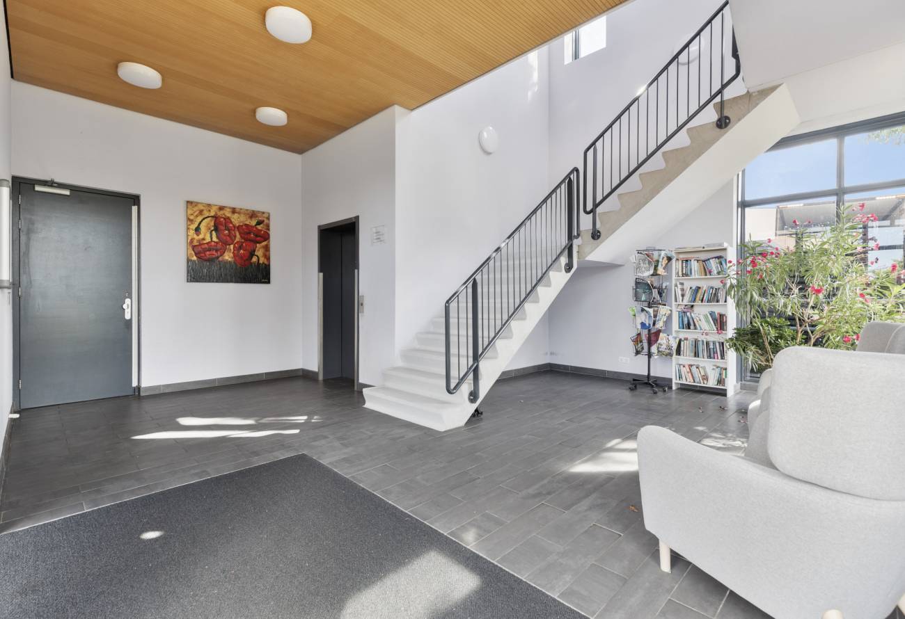 Via de hoofdingang met bellentableau en brievenbussen kan je met de lift of met de trap naar de binnentuin en hoger naar het appartement.