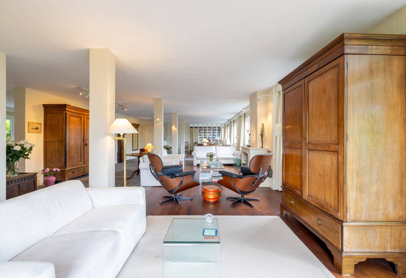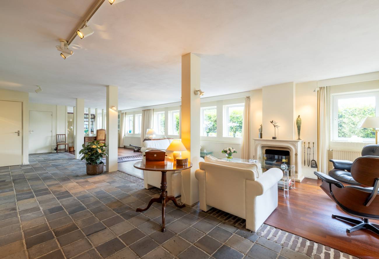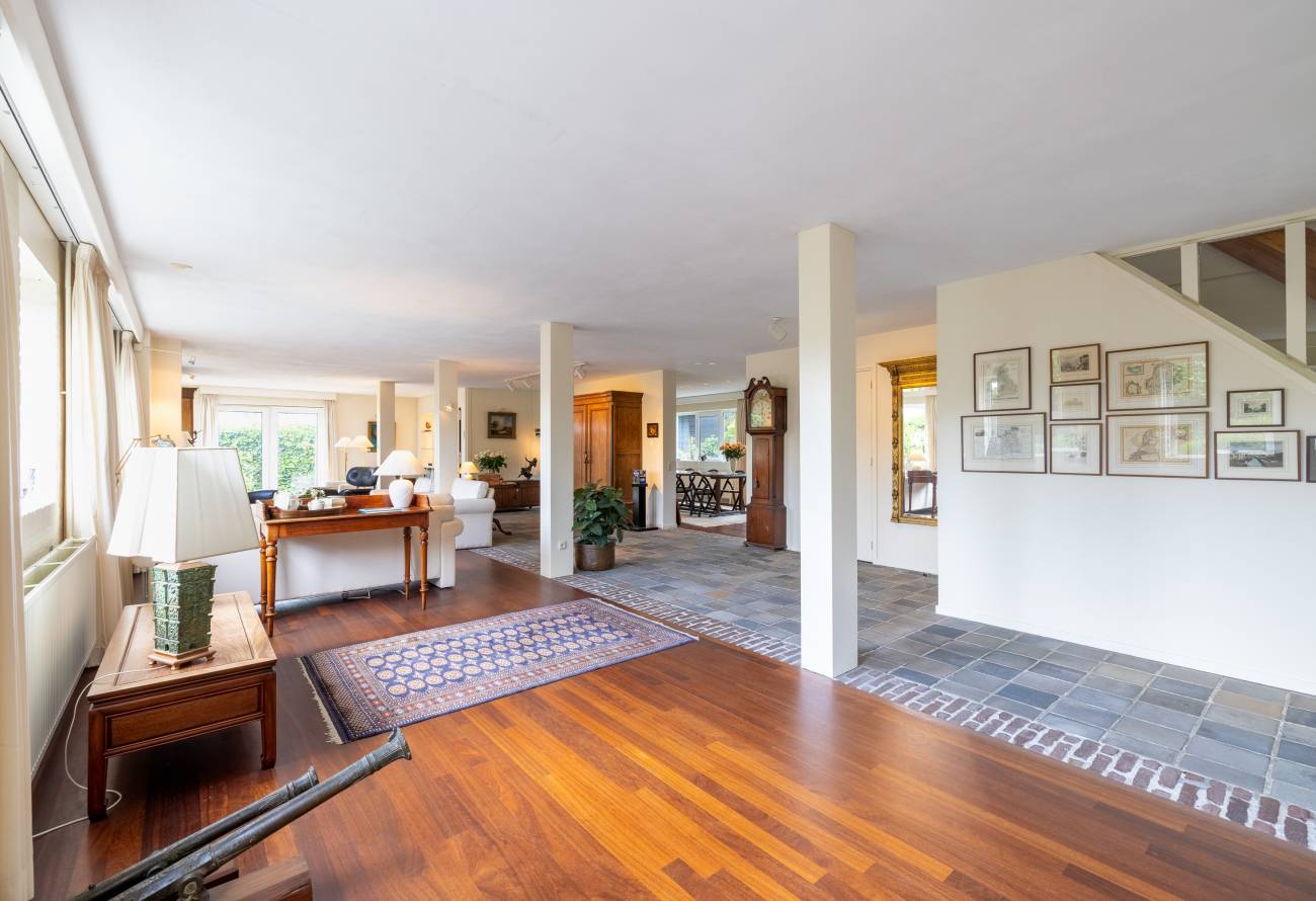 Bij binnenkomst via de ruime entree met garderobe, toilet en kastenwand betreed je de royale woonkamer met open haard en meerdere zithoeken.