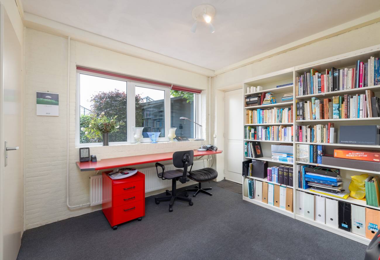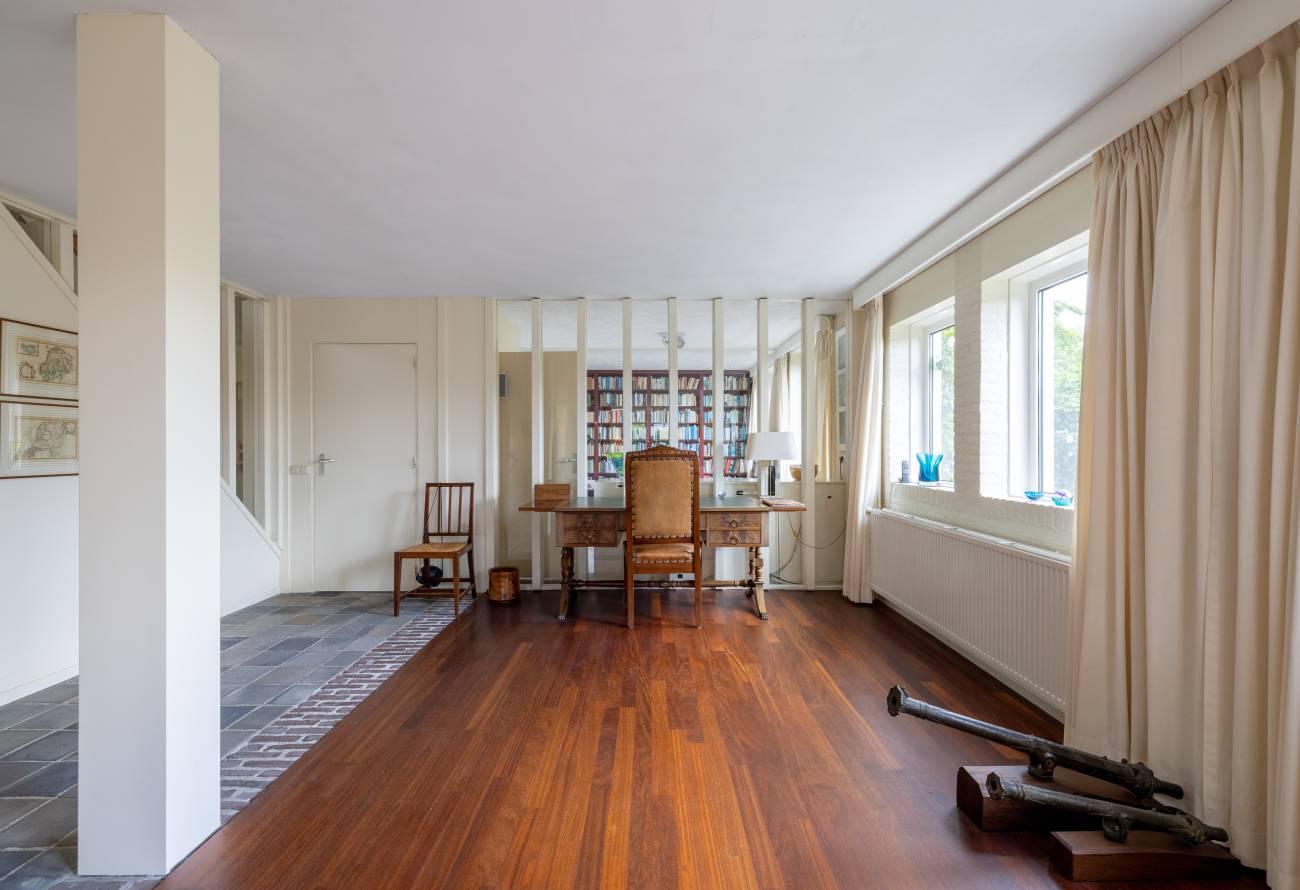 Daarnaast is er een aparte eetkamer. Aan de voor- en achterzijde van de woning zijn ruimtes die uitstekend geschikt zijn voor een kantoor of praktijk aan huis, elk met eigen entree. Hier bevindt zich ook een tweede toilet.