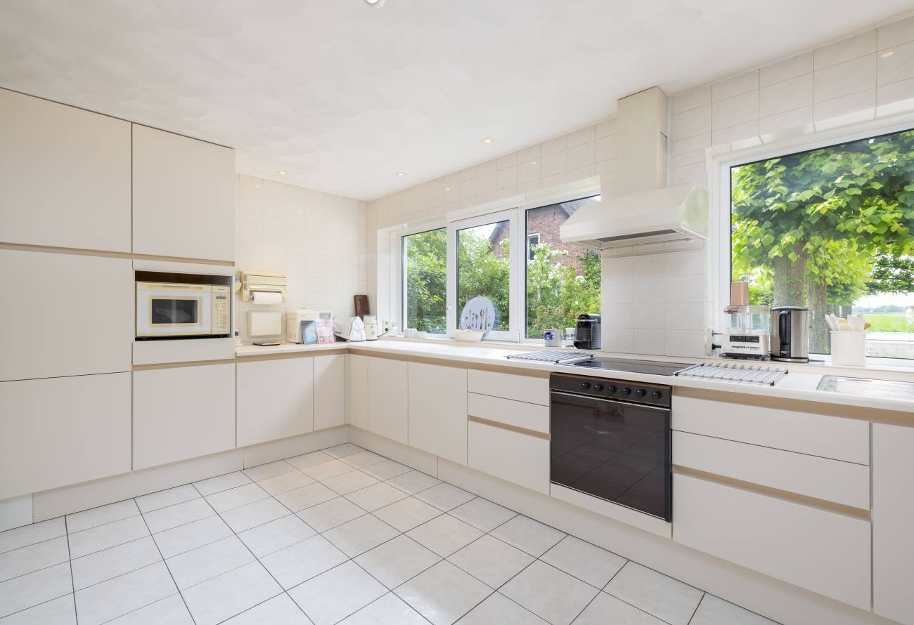 Aangrenzend bevindt zich een aparte hobbykamer en een TV-kamer met zicht op de tuin. De ruime keuken, voorzien van alle benodigde apparatuur. Vanuit de keuken kijk je uit op zowel het binnenplein als op de weilanden.