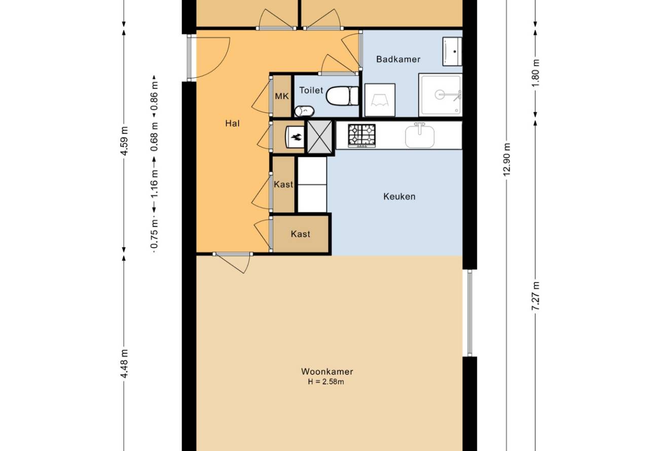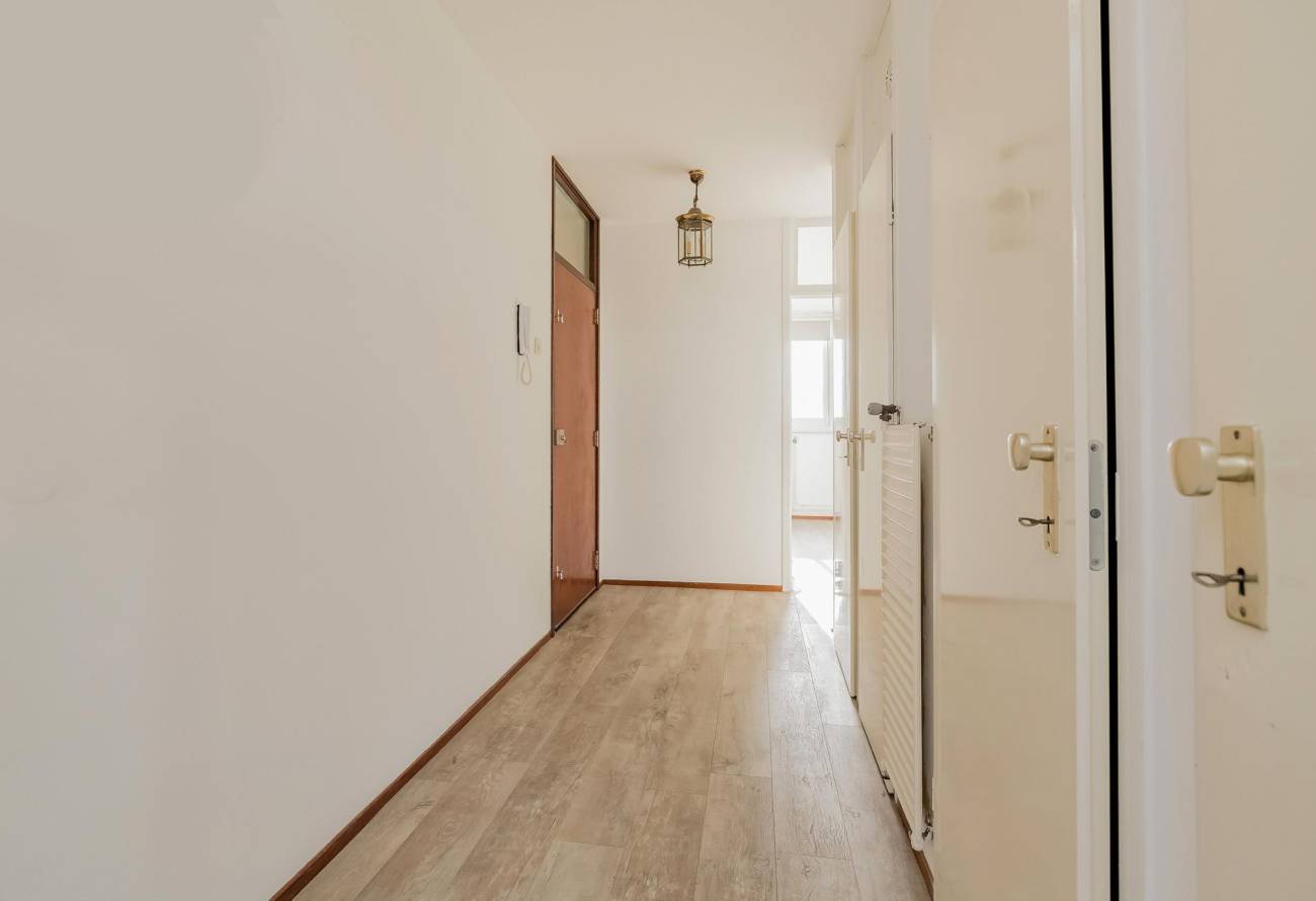 Entree hal met separaat toilet en fontein, opbergkasten en cv-opstelling. Lichte en ruime woonkamer met open keuken. De keuken is voorzien van een koelkast met vriesvak, gaskookplaat, oven, afzuigkap en vaatwasser. De woonkamer biedt toegang tot het royale balkon welke geniet van het prachtige uitzicht. Het gehele appartement is voorzien van een nette pvc-vloer.