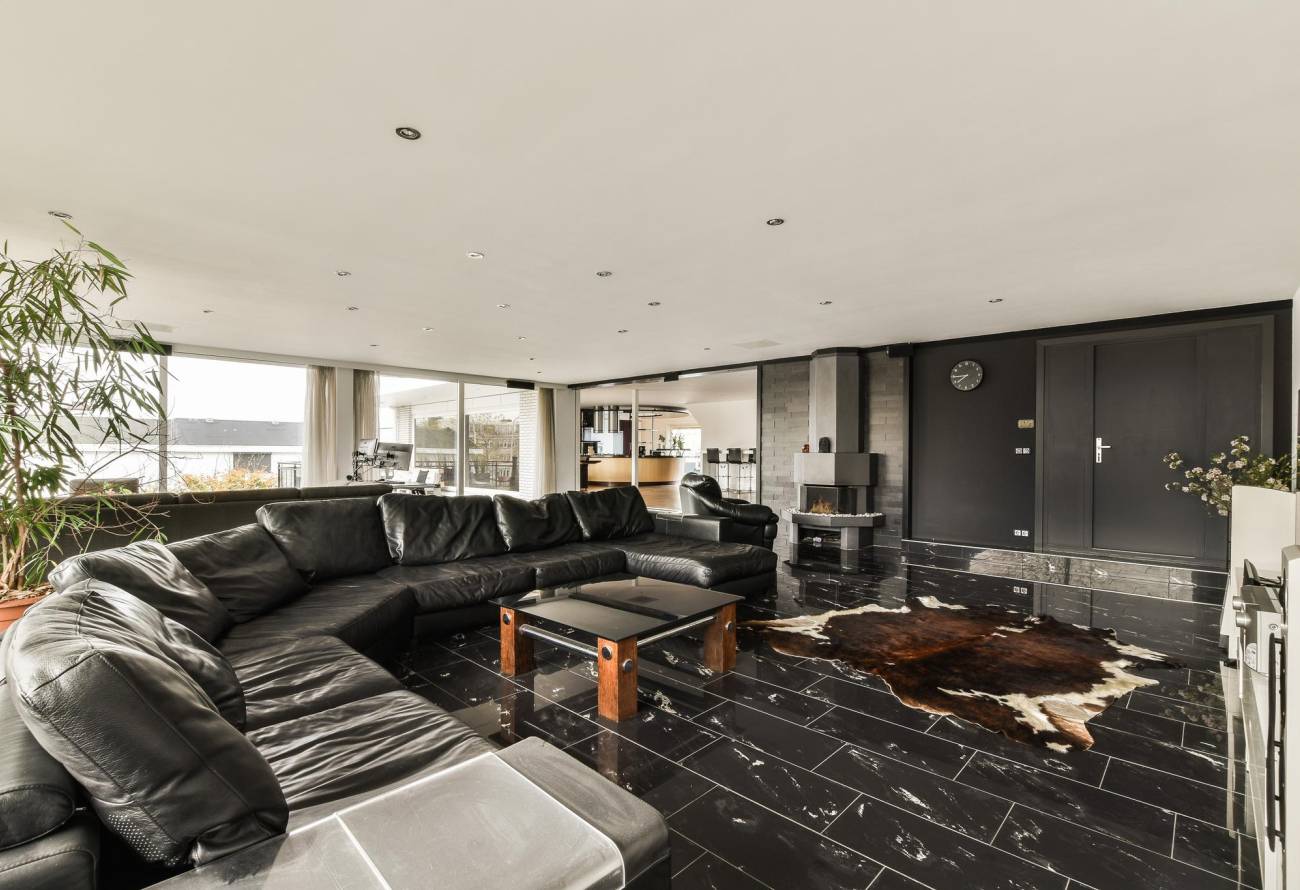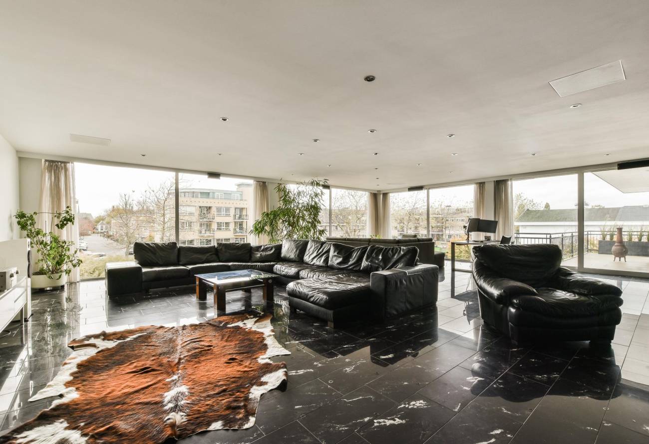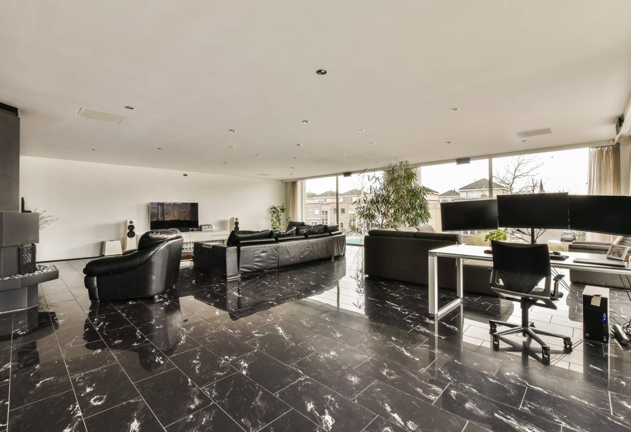 De woonkamer is verder voorzien van een donkere granieten vloer, luchtbehandeling en vrij uitzicht over de haven van Hillegom.