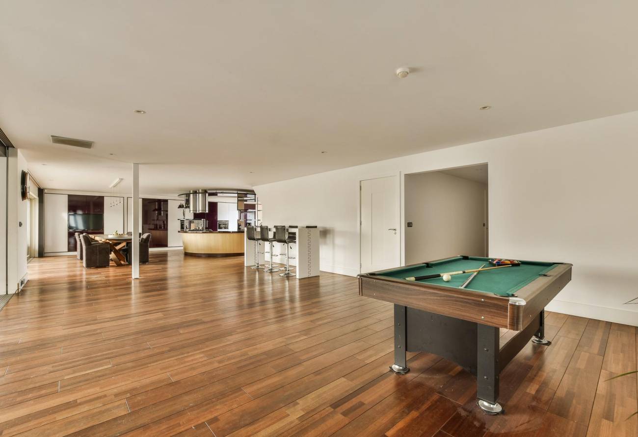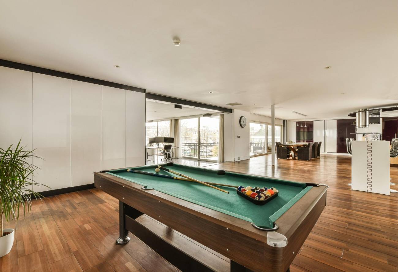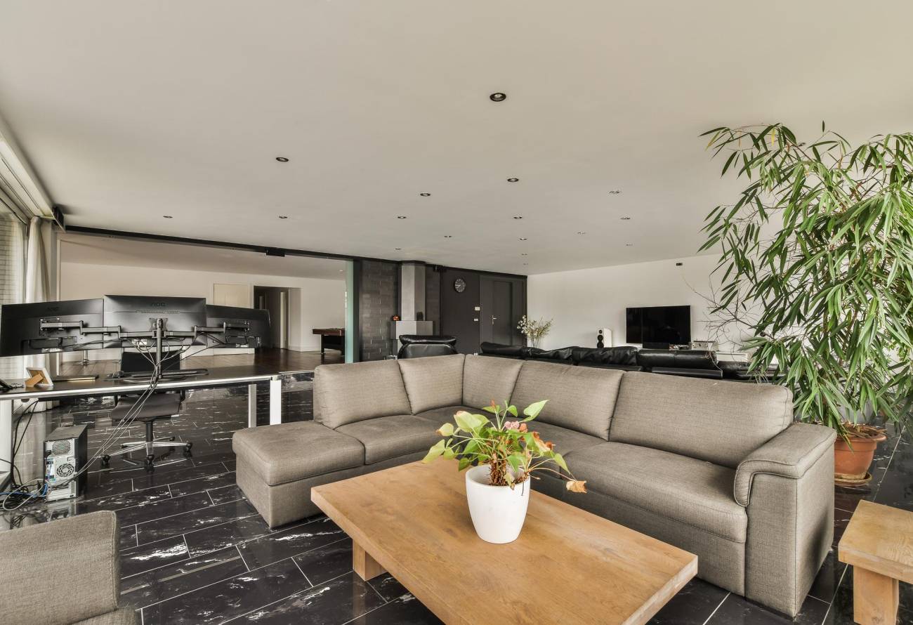 De woonkamer is verder voorzien van een donkere granieten vloer, luchtbehandeling en vrij uitzicht over de haven van Hillegom.