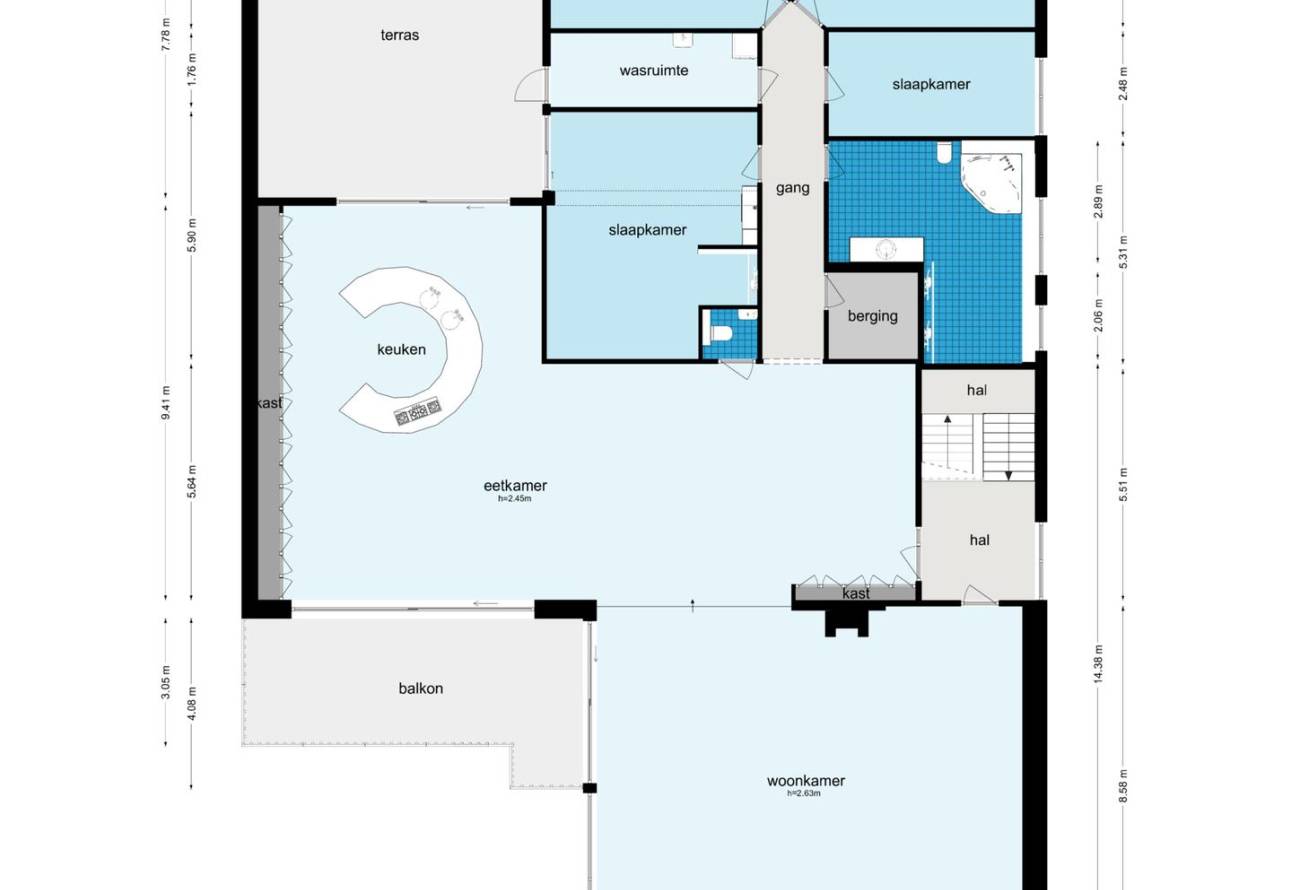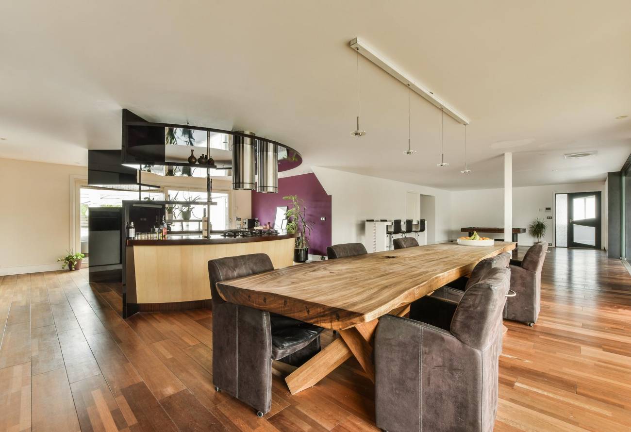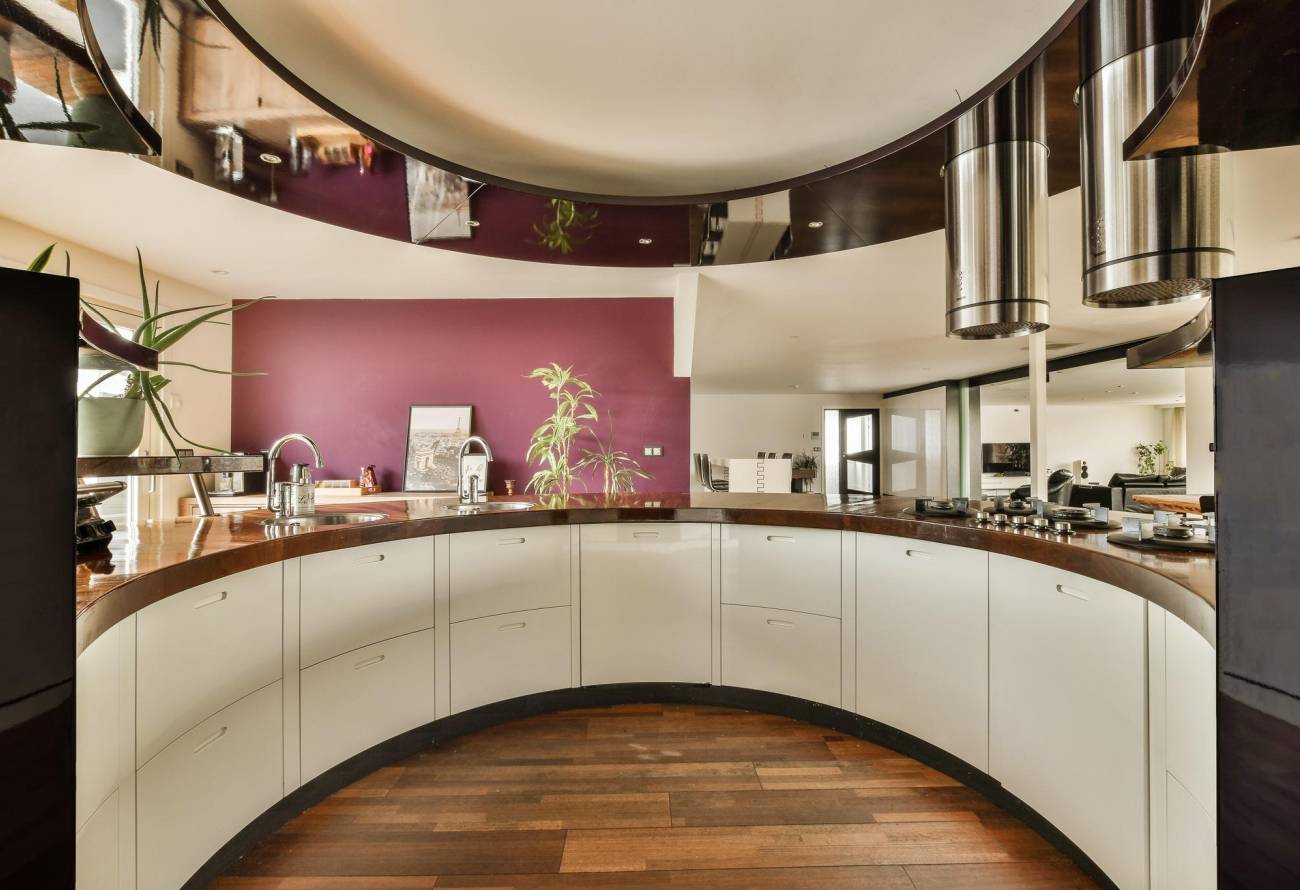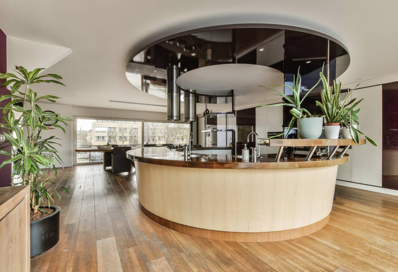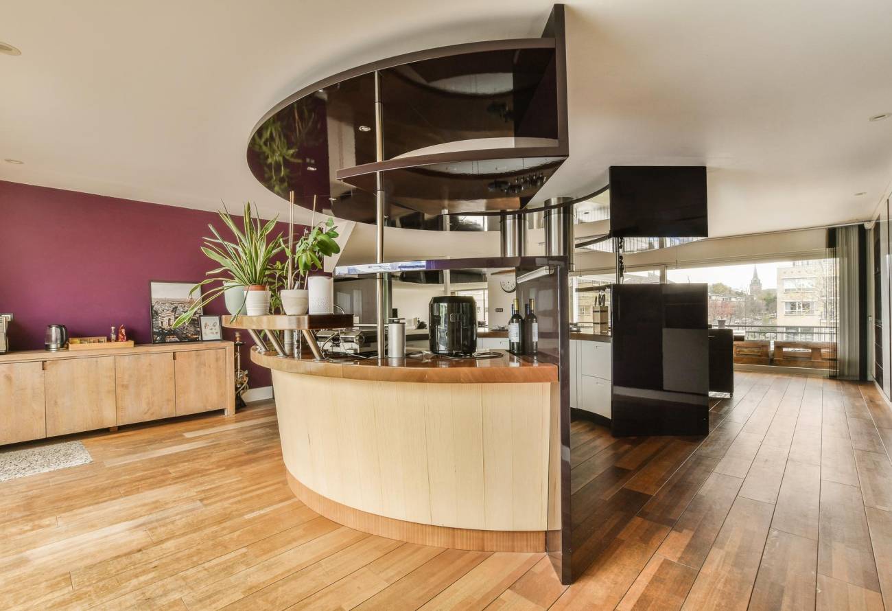 De prachtige, speelse woonkeuken is in het eetgedeelte gesitueerd en heeft een unieke ronde vorm, welke ook gebruikt kan worden als eetbar, gezellig voor de snelle hap of een borrel. Deze keuken is voorzien van allerhande inbouwapparatuur.