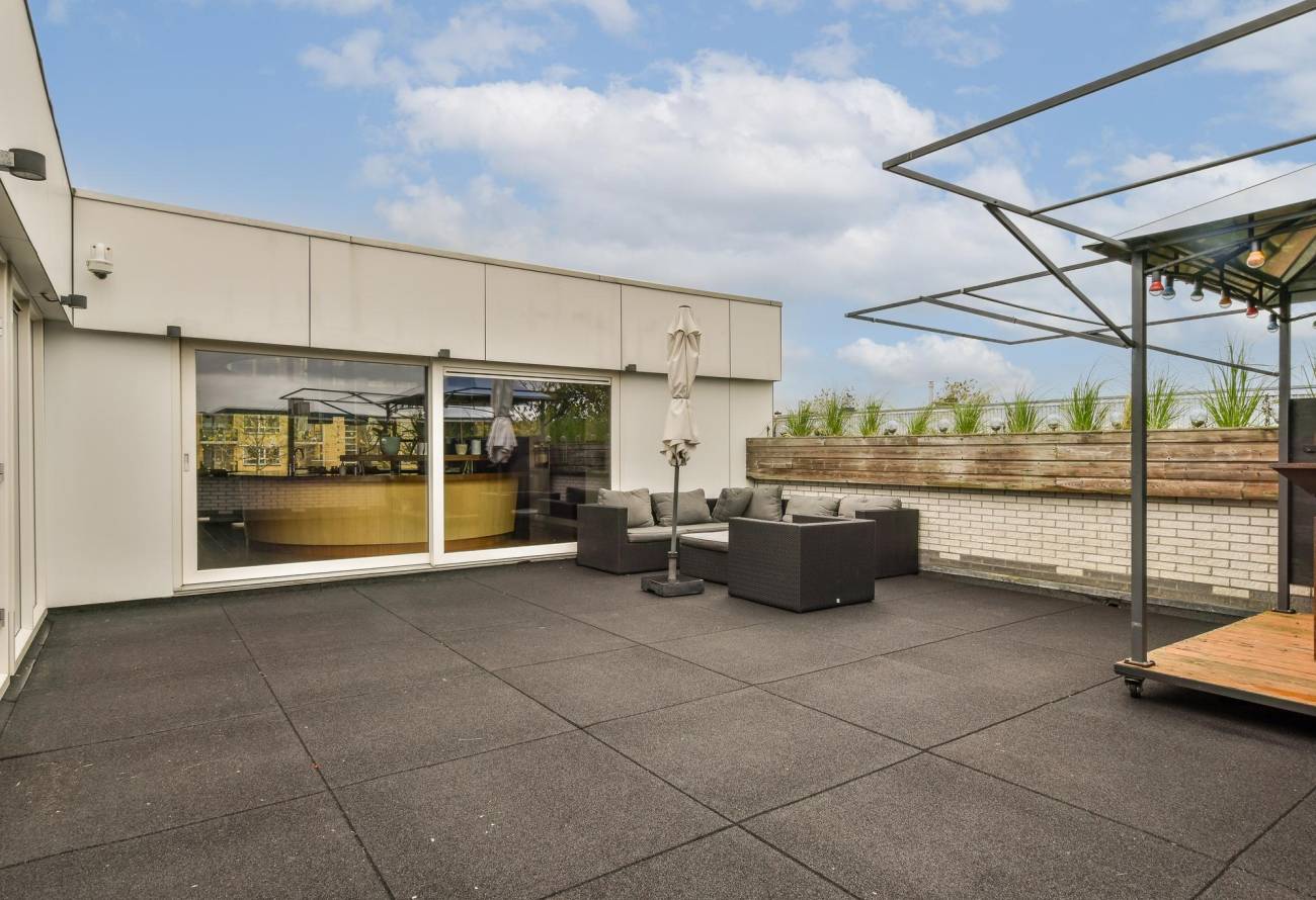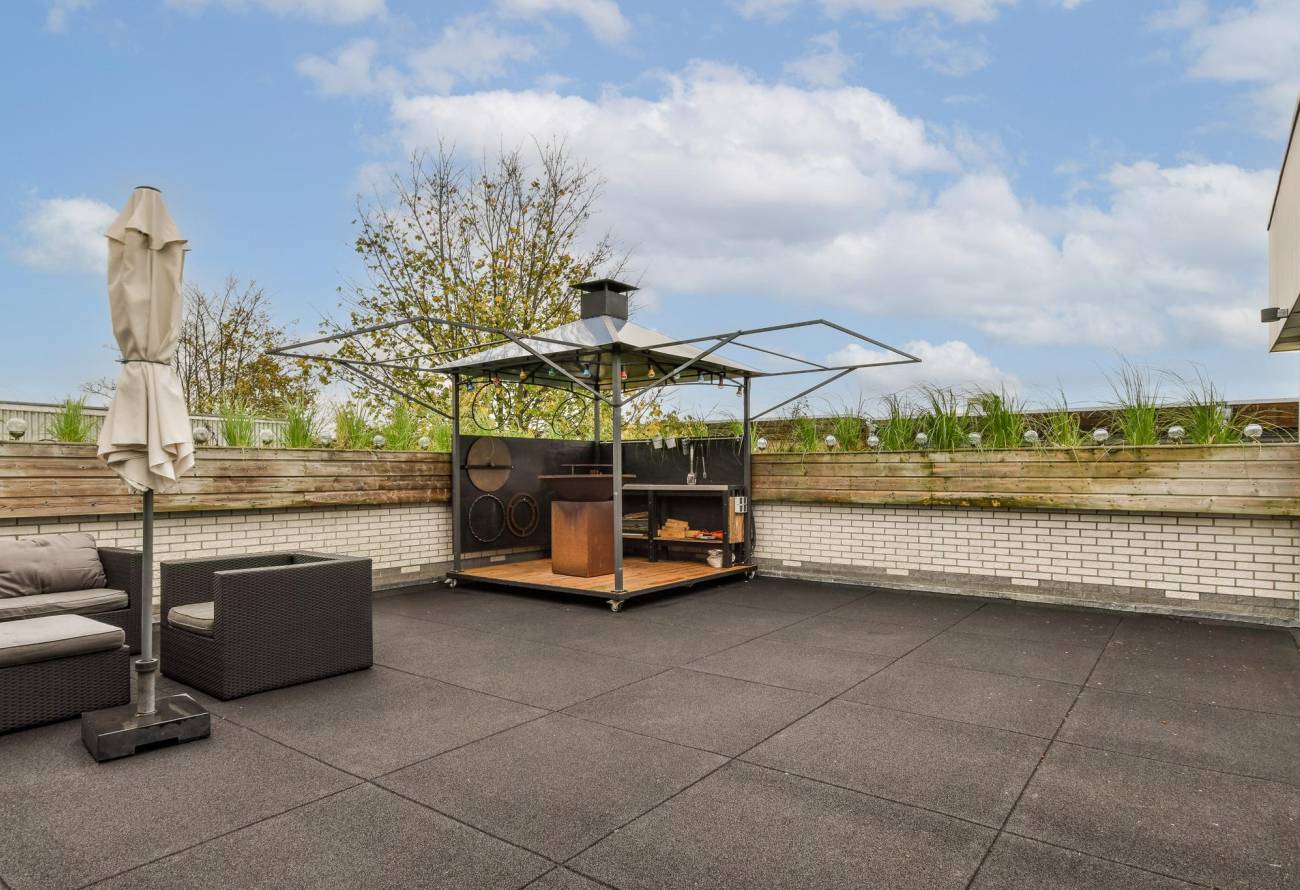 Vanuit de keuken is een dakterras met lichte betegeling en waar je de gehele dag kunt genieten van de zon en heerlijk uit de wind kunt zitten. Hier heeft u 100% privacy.