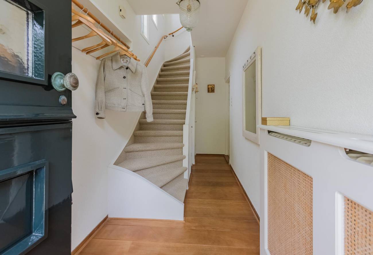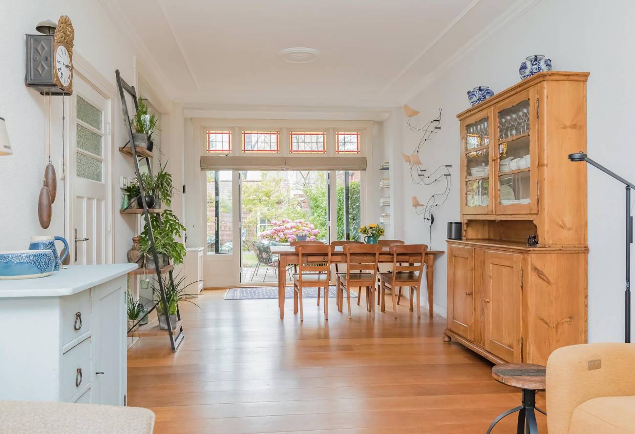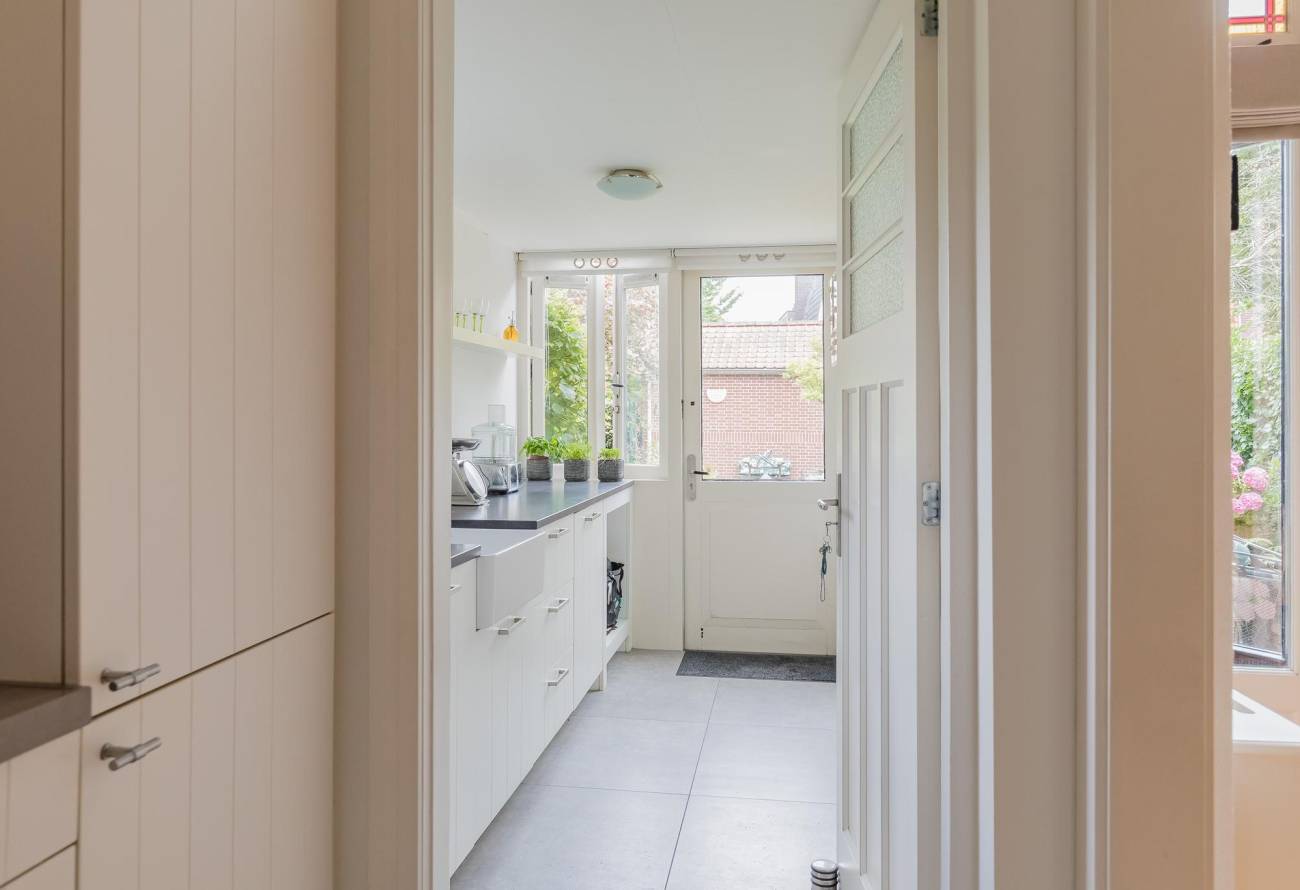 Entree, lichte hal, meterkast, modern zwevend toilet (2024). Sfeervolle woonkamer met massieve Robinia houten vloer en gashaard. De erker is voorzien kunststof kozijnen en HR++ beglazing. Aan de achterzijde bevinden zich de openslaande deuren met daarboven de glas in lood ramen. Zeer nette keuken, welke goed is onderhouden en is voorzien van allerhande inbouwapparatuur, waaronder: de oven, magnetron en het gasfornuis van het merk Smeg. Close-in boilers voor zowel de wastafel in de keuken als de butler sink in de bijkeuken. Verder is de keuken voorzien van Quooker (Franke), vaatwasser en koel-/vriescombinatie.