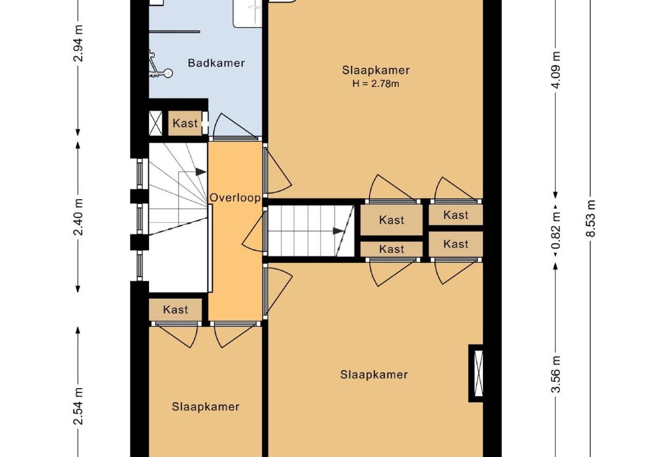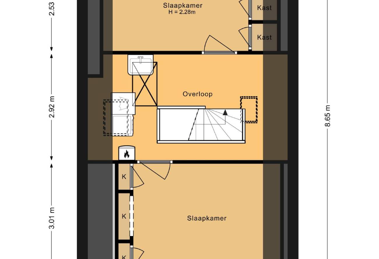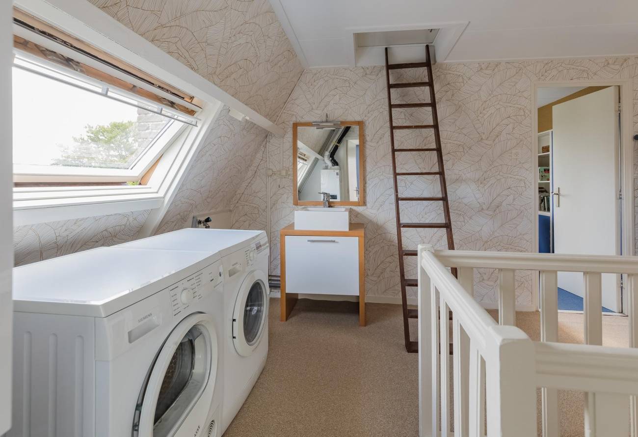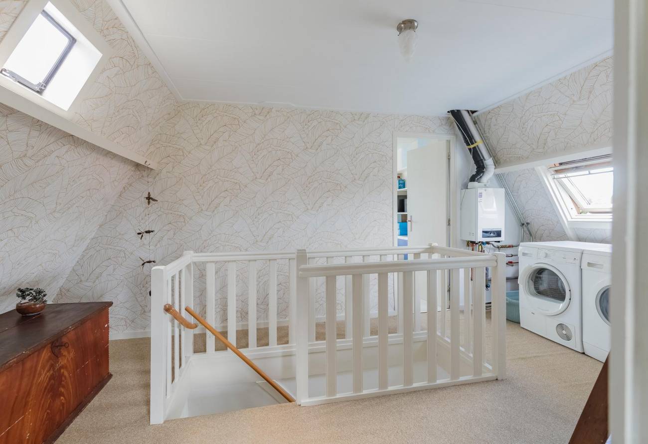 Ruime overloop met de aansluitingen voor de was-, droogapparatuur en de opstelling van de CV-ketel (2021). Aan zowel de voor als achterzijde bevinden zich nog twee ruime slaapkamers. Tevens is er nog een ruime vliering met een nokhoogte van ca 2,3 meter.