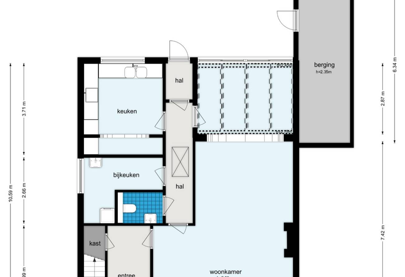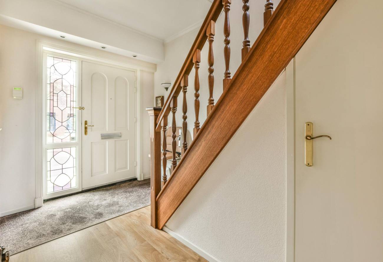 Via bordestrap met overdekte entree toegang tot de woning met ruime hal met meterkast en trap met trapkast naar verdieping. Via een deur is er toegang tot de woonkamer.