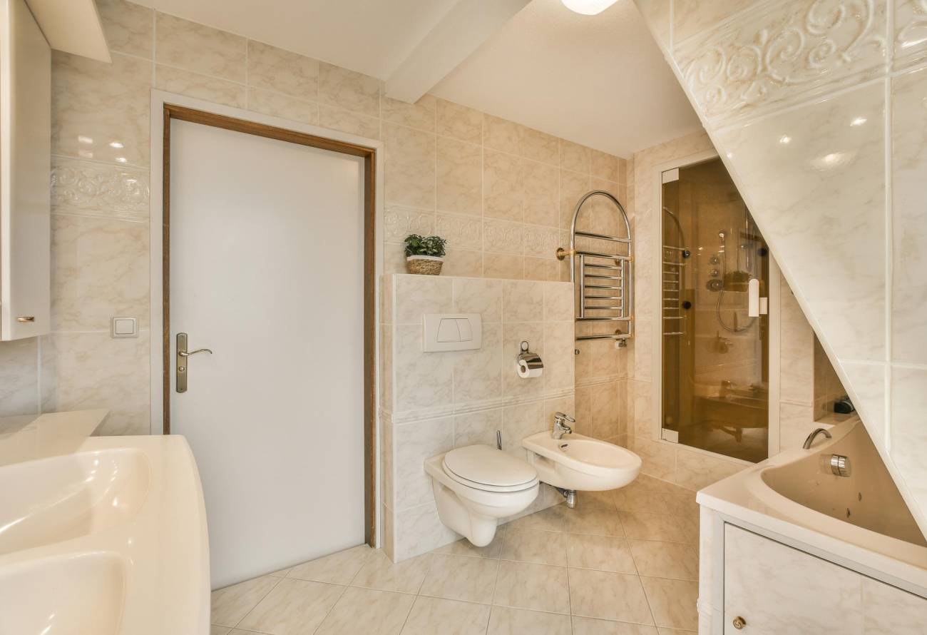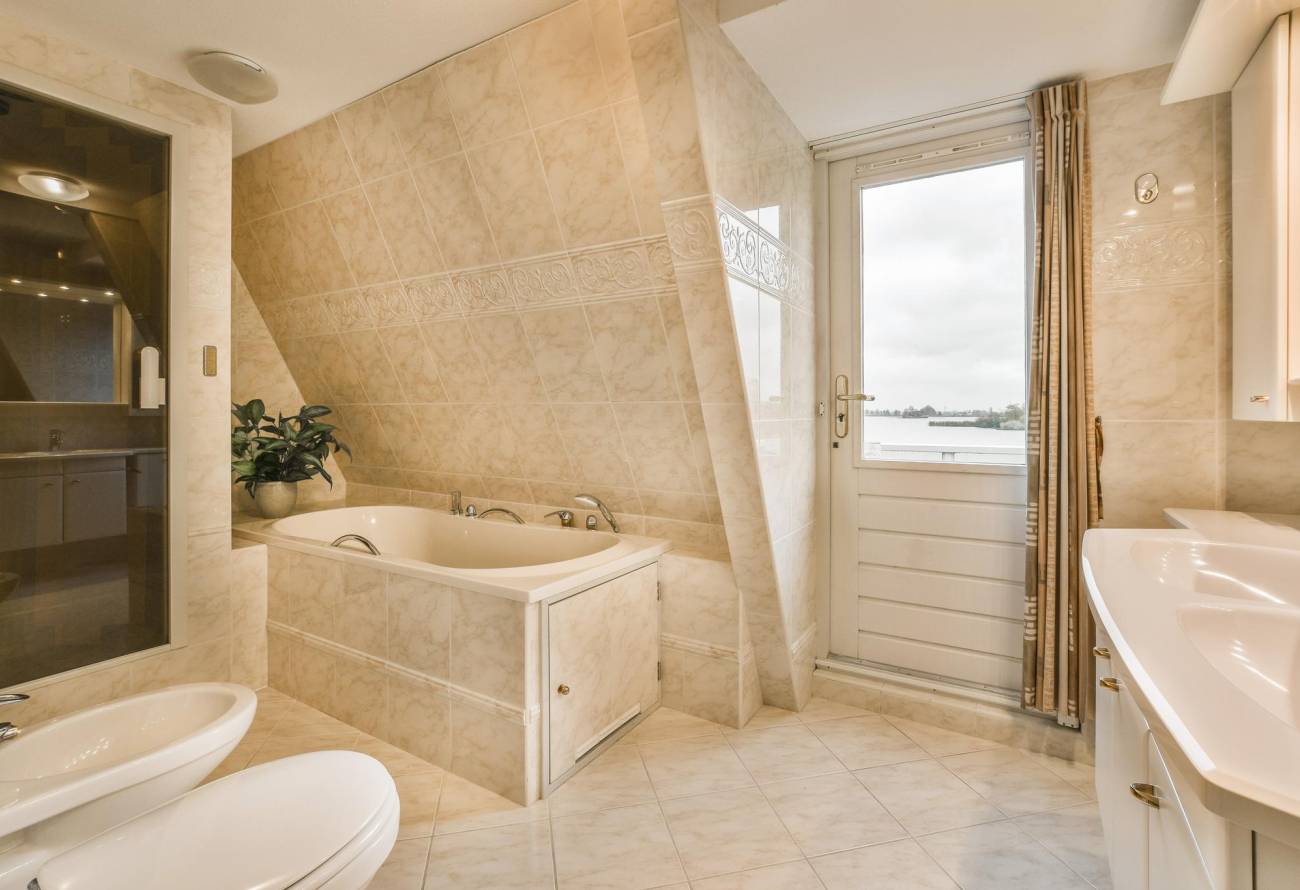 Vanuit de entree hal is er een vaste trap naar de ruime overloop met twee zeer ruime slaapkamers en een grote badkamer. De badkamer heeft een ligbad, een douchecabine, dubbele wastafel in meubel, toilet, bidet en deur naar groot balkon met super vrij uitzicht over het water.