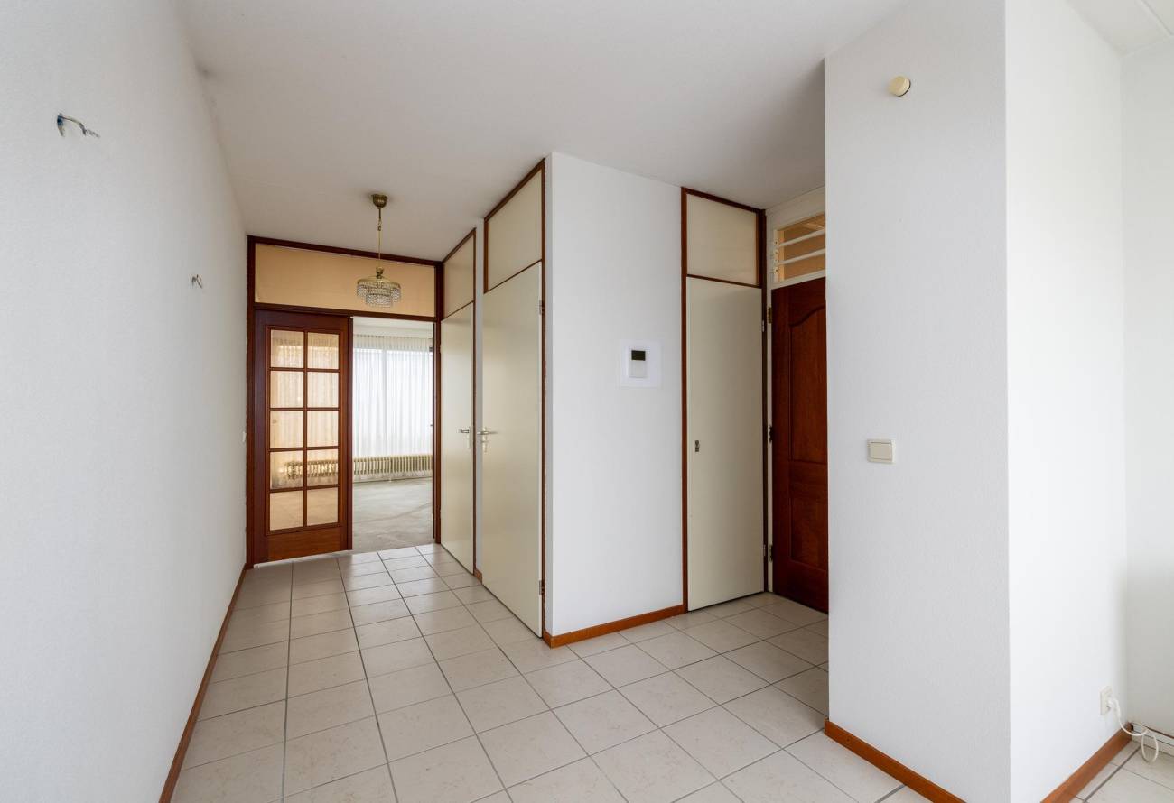 Grote lichte hal met garderobe, cv kast (combiketel 2022), meterkast en toiletruimte, riante woonkamer met aan drie zijden zicht, centraal gelegen ronde gashaard en 2 schuifpuien naar twee terrassen (ZW en NO), half open woonkeuken met crème onder- en bovenkasten in L-opstelling, plek voor eettafel en schuifpui naar serre.
