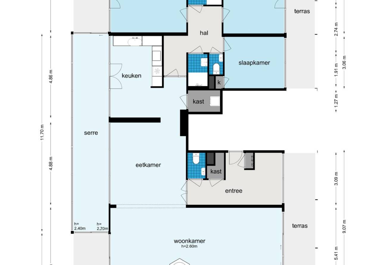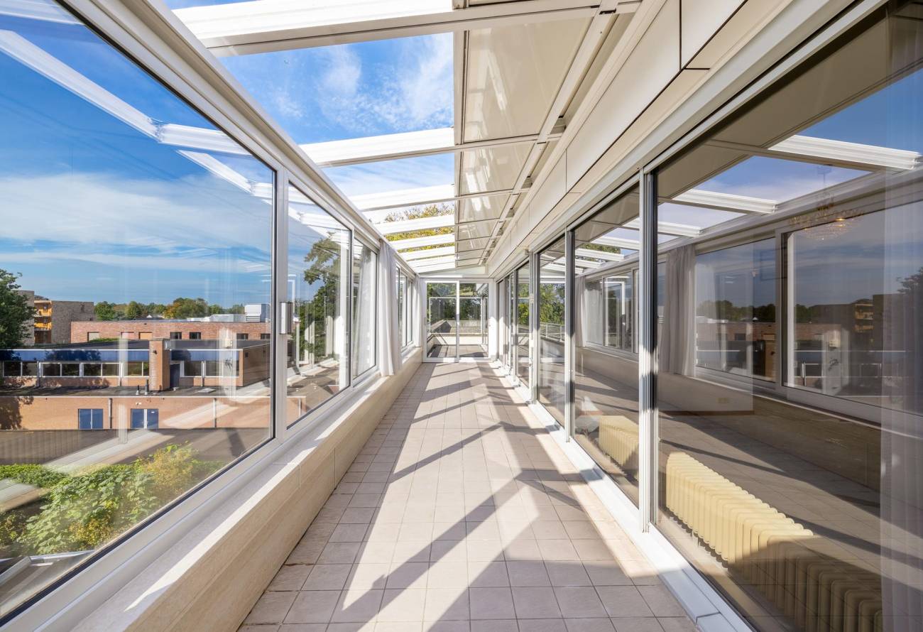 Deze serre heeft toegang tot twee terrassen en is voorzien van elektrisch bedienbaar glazen dakpanelen.