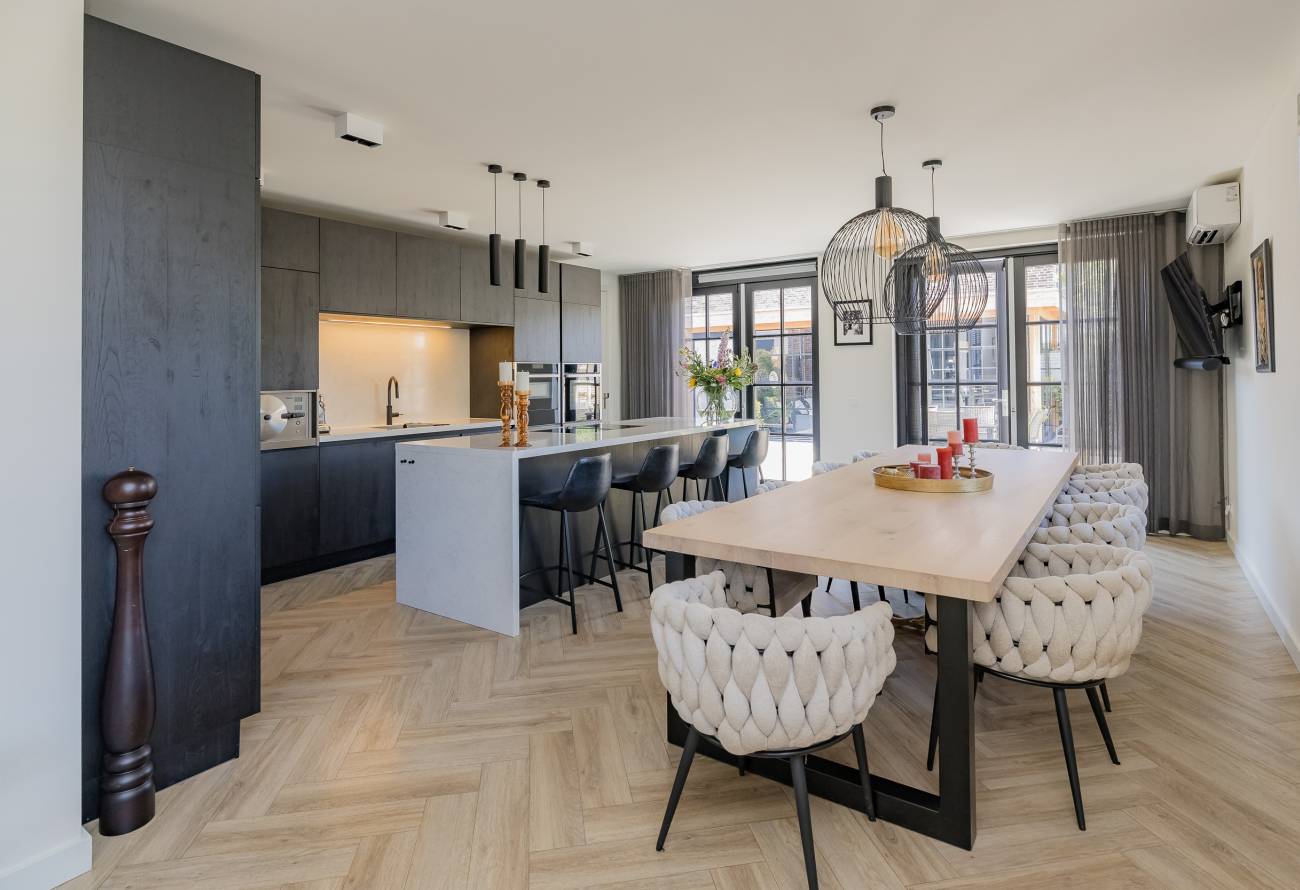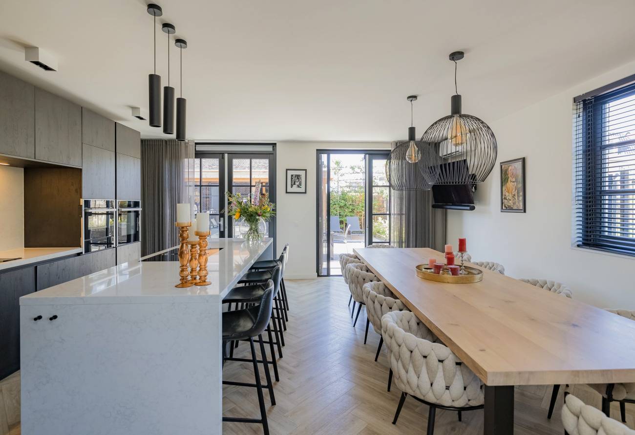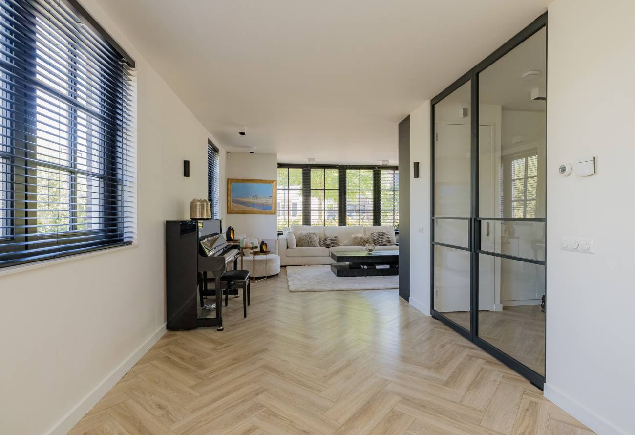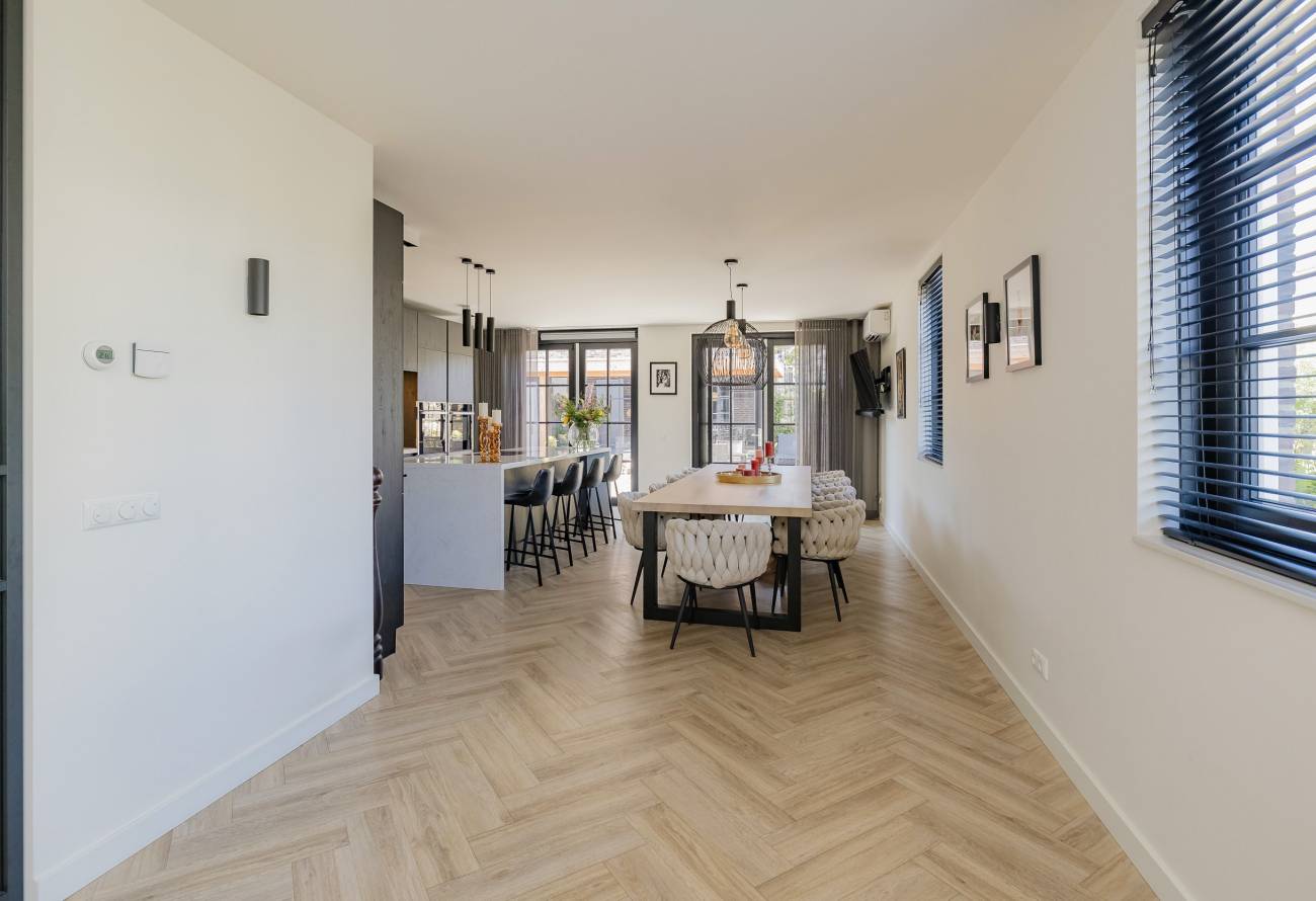 In de hal, met garderobekast en gastentoilet, geven stalen deuren toegang tot de ruime, zeer lichte woonkamer met fraai wandmeubel en een grote erker. Aan de achterzijde van de woning is de ruime woonkeuken met kookeiland gesitueerd - perfect om samen te komen met familie en vrienden. Twee paar openslaande deuren naar de tuin maken dat binnen en buiten moeiteloos in elkaar overlopen. Dankzij de vloerverwarming geniet je hier het hele jaar door van een behagelijke temperatuur.