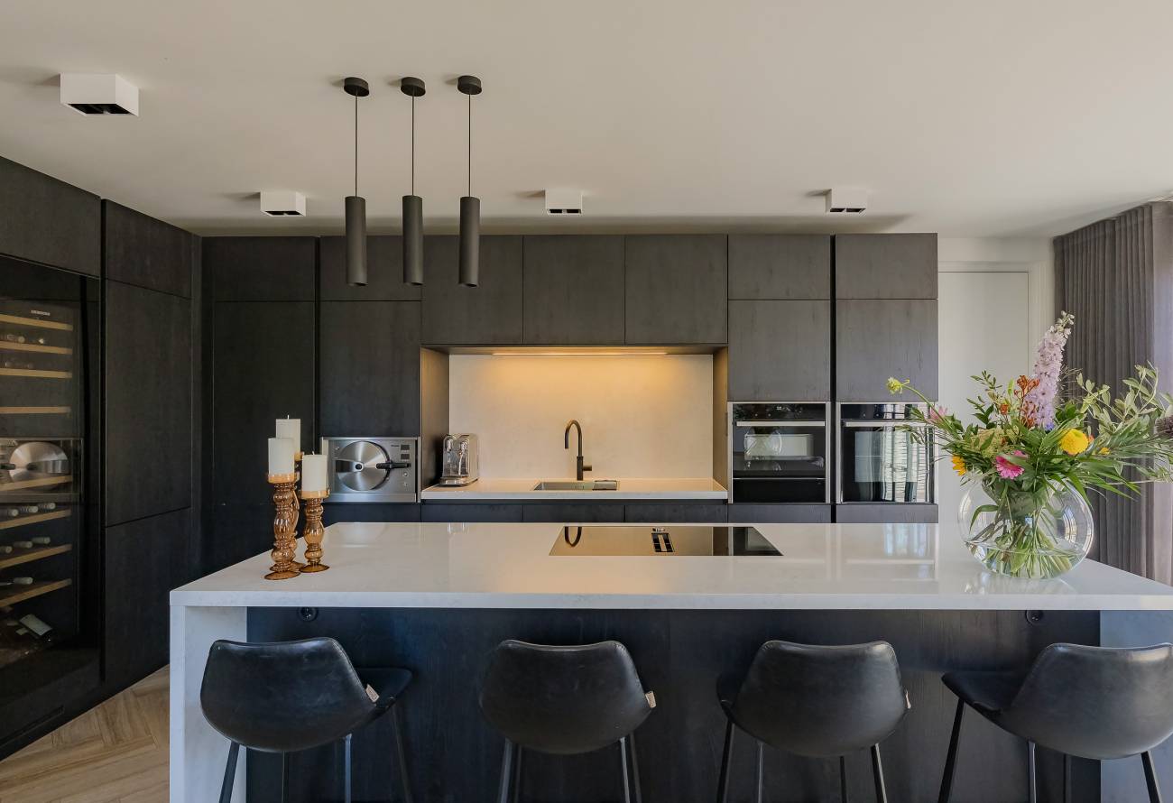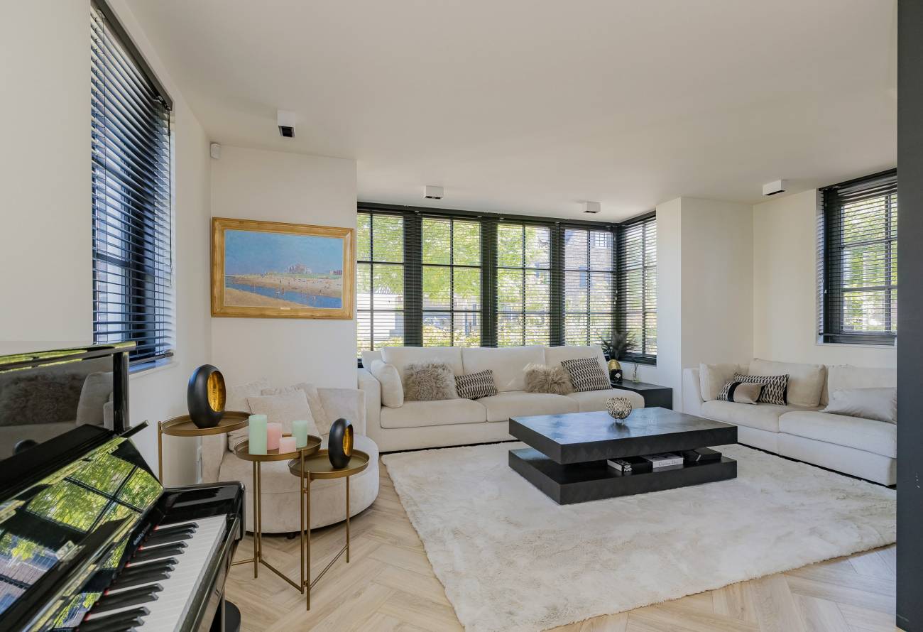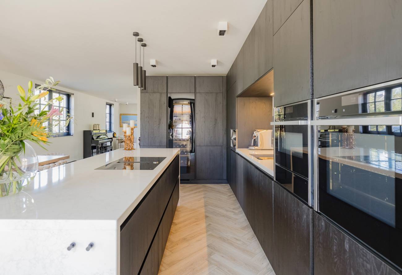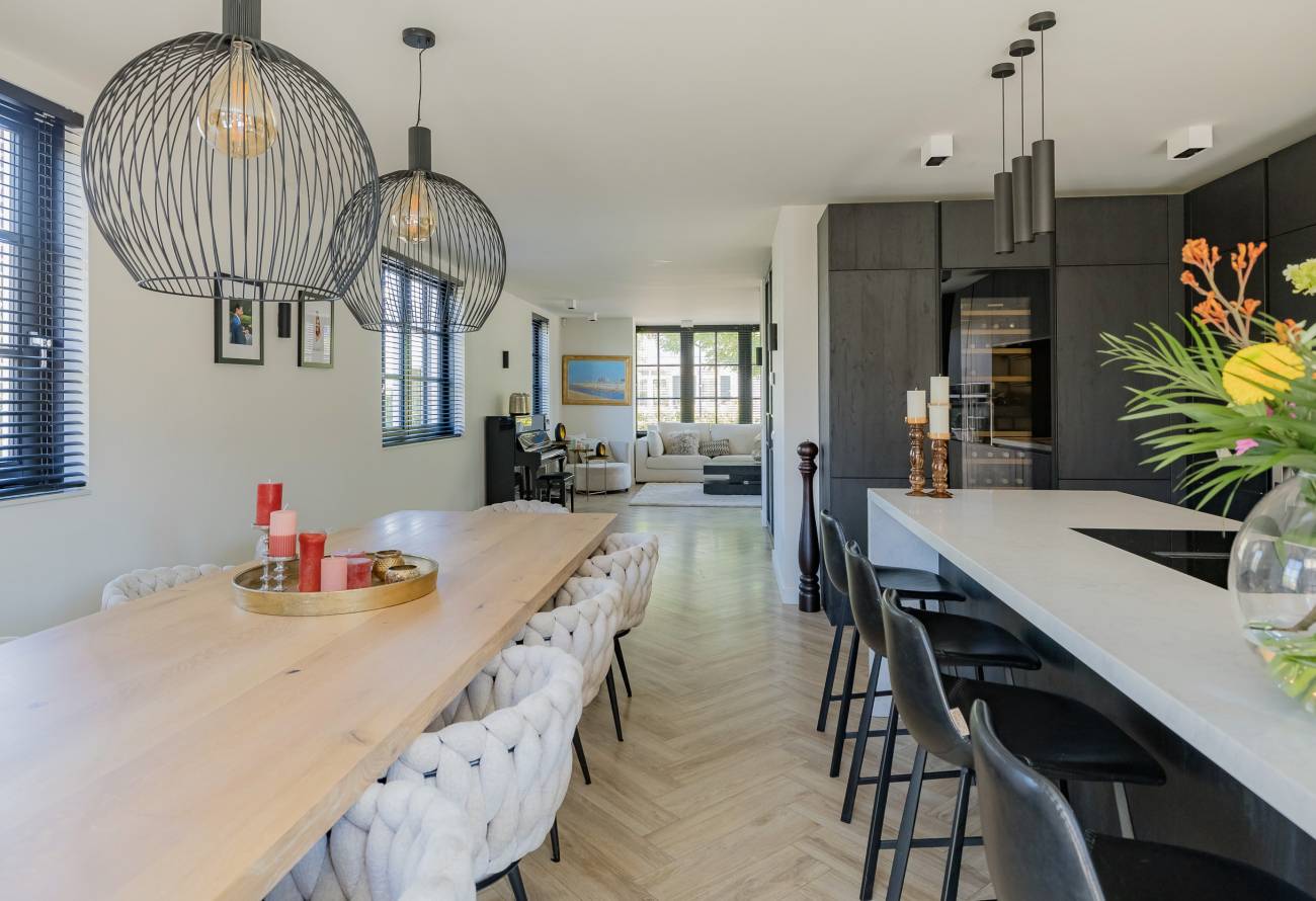 In de hal, met garderobekast en gastentoilet, geven stalen deuren toegang tot de ruime, zeer lichte woonkamer met fraai wandmeubel en een grote erker. Aan de achterzijde van de woning is de ruime woonkeuken met kookeiland gesitueerd - perfect om samen te komen met familie en vrienden. Twee paar openslaande deuren naar de tuin maken dat binnen en buiten moeiteloos in elkaar overlopen. Dankzij de vloerverwarming geniet je hier het hele jaar door van een behagelijke temperatuur.