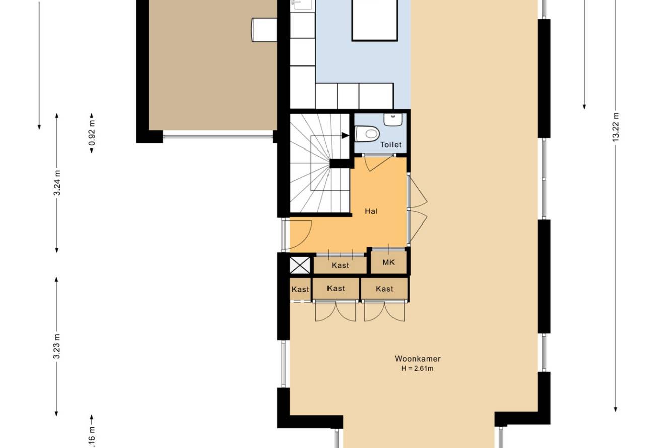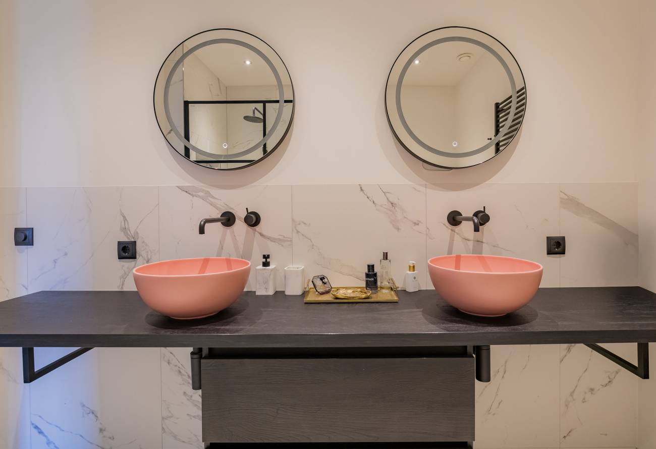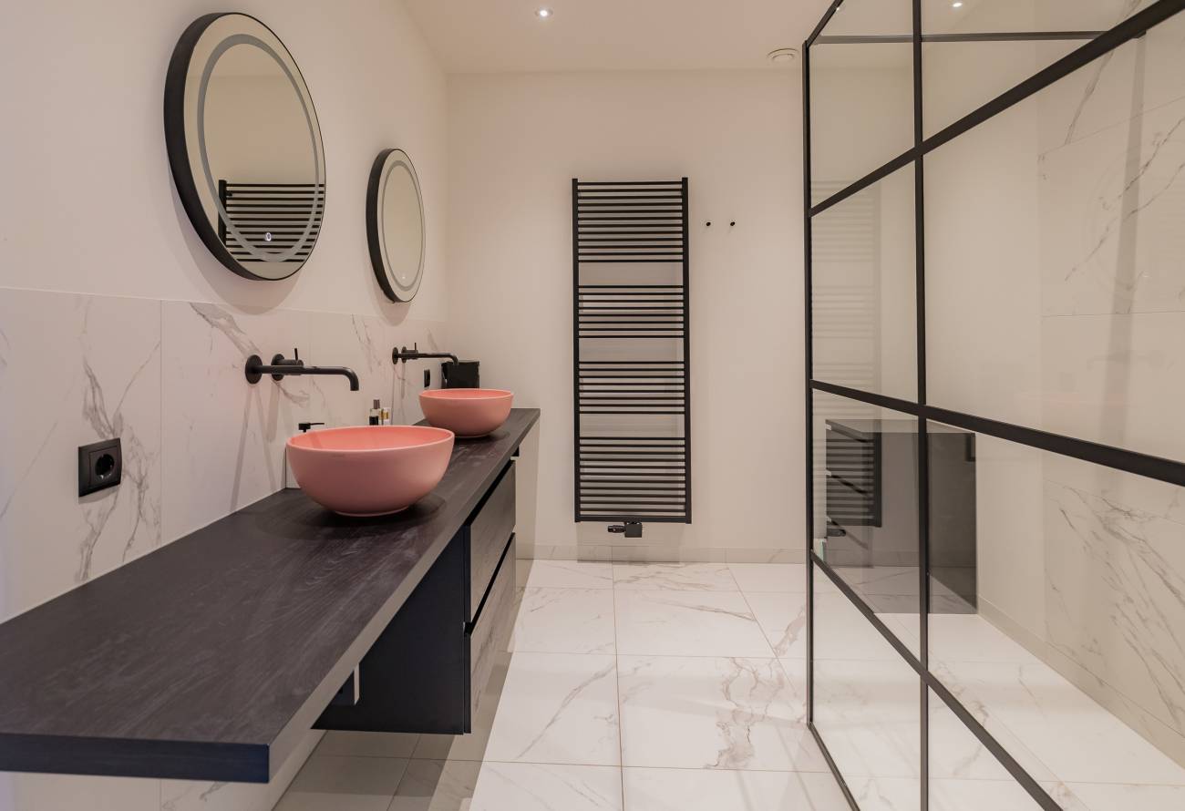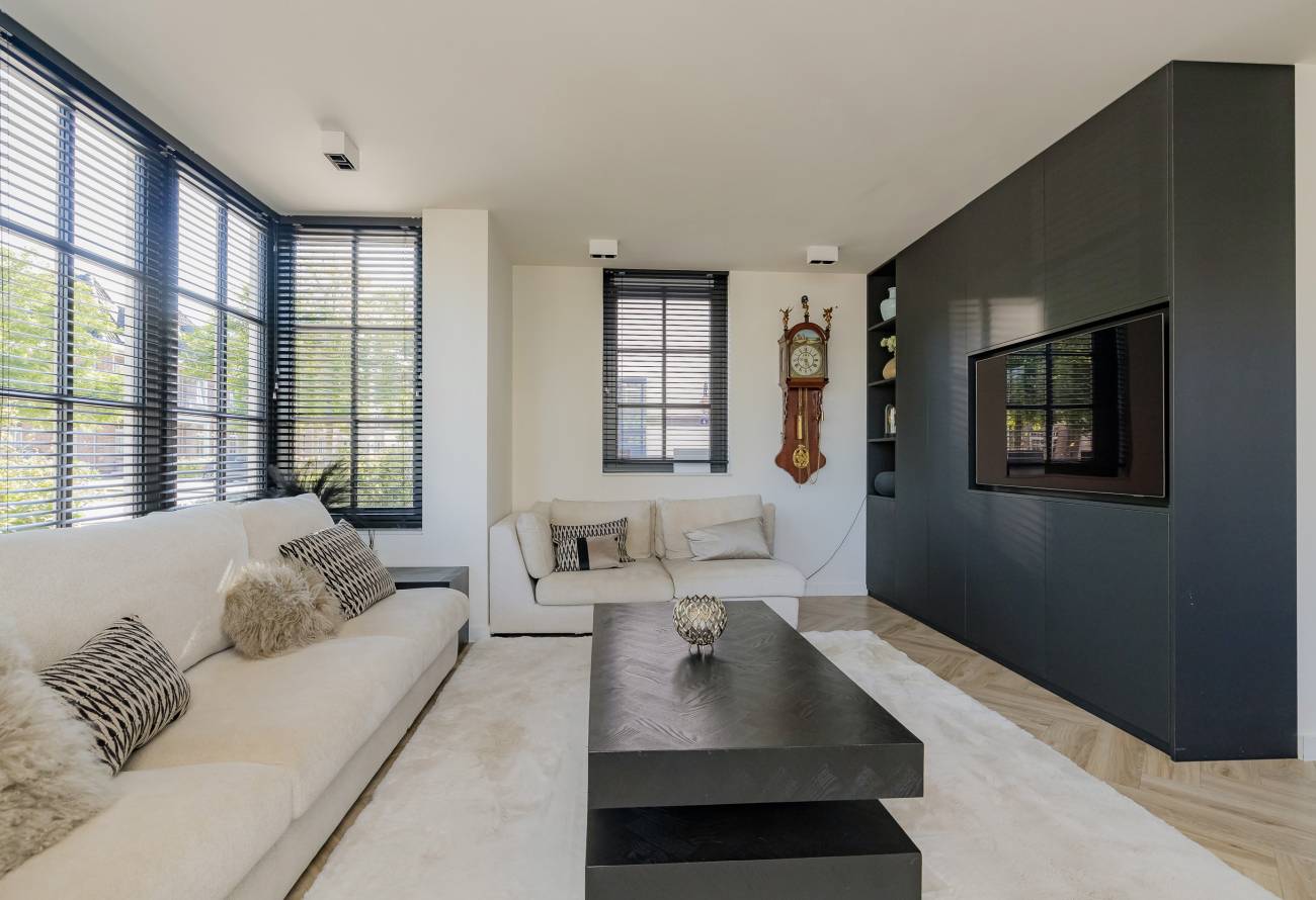 In de hal, met garderobekast en gastentoilet, geven stalen deuren toegang tot de ruime, zeer lichte woonkamer met fraai wandmeubel en een grote erker. Aan de achterzijde van de woning is de ruime woonkeuken met kookeiland gesitueerd - perfect om samen te komen met familie en vrienden. Twee paar openslaande deuren naar de tuin maken dat binnen en buiten moeiteloos in elkaar overlopen. Dankzij de vloerverwarming geniet je hier het hele jaar door van een behagelijke temperatuur.