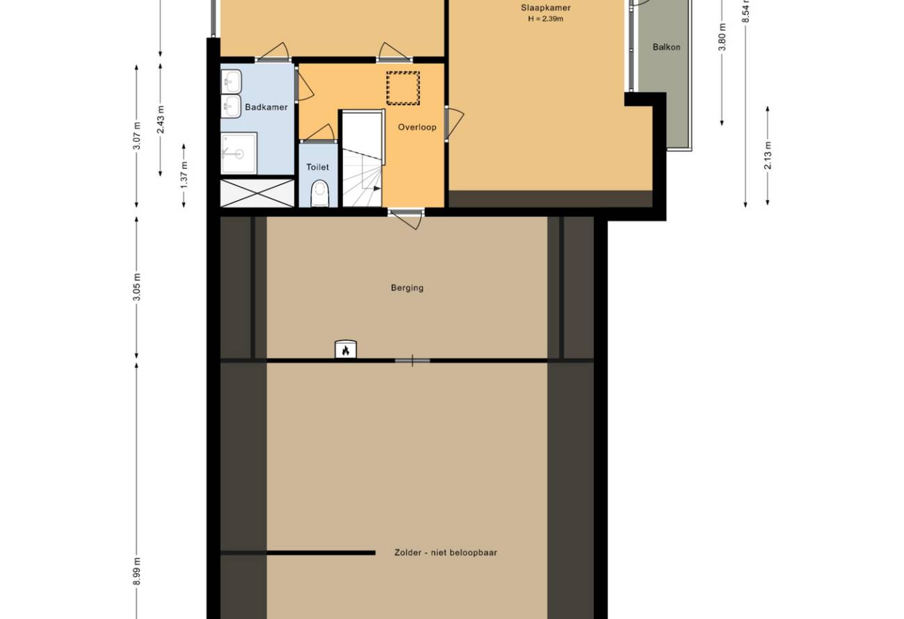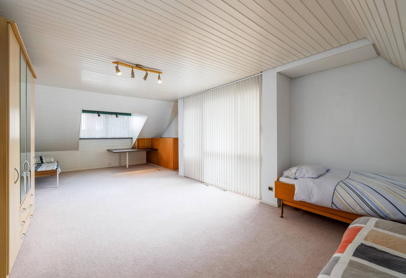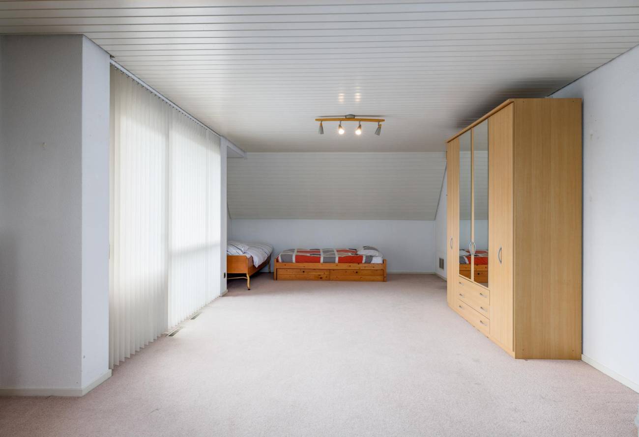 Overloop, twee ruime slaapkamers waarvan één met deur naar balkon, aparte toiletruimte en eenvoudige 2e badkamer met douchecabine en dubbele wastafel. De grote bergzolder biedt extra opslagruimte. Deze etage kan worden uitgebreid met een extra slaapkamer.